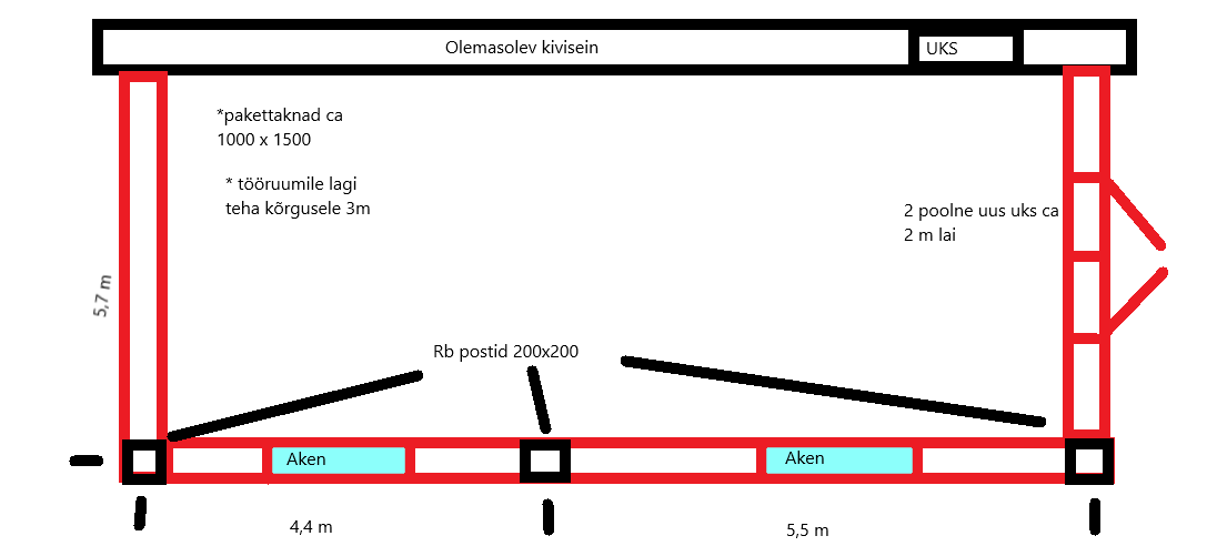 Kuna tegu on tootmisruumiga, siis esmatähtis on funktsionaalsus. Arvan ise, et puitsõrestik, tuuletõke, vahel vill ja mõlemal pool OSB oleks juba ok lahendus. Tööruumil on 2 akent (siseaknad) ja 1 kahepoolne rauduks. Ligikaudsed mõõdud on lisatud joonisel. Lae talad kinnituvad olemasolevale kiviseinale ja ehitatavale uuele seinale.