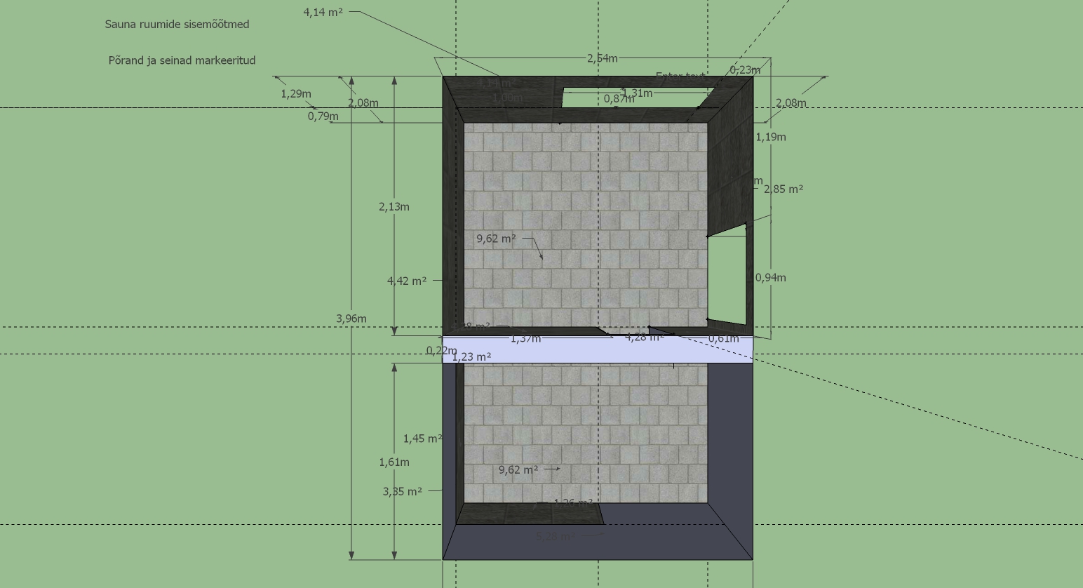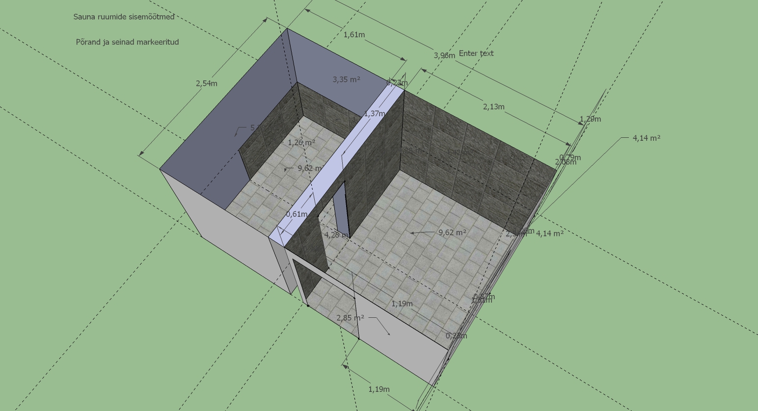 1988.a ehitatud sauna remont. Eesmärk: Vana betoonpõrand lammutada ja ehitada uus soojustatud ja köetav põrand (küttematt olemas) ning selle viimistlemine keraamilise plaadiga. Põrandaplaat olemas. Olemasoleva keraamilise seinaplaadi asendamine uuega. Seinaplaat olemas. Vaata lisatud failides töökirjeldust koos materjali ja töömahtudega.