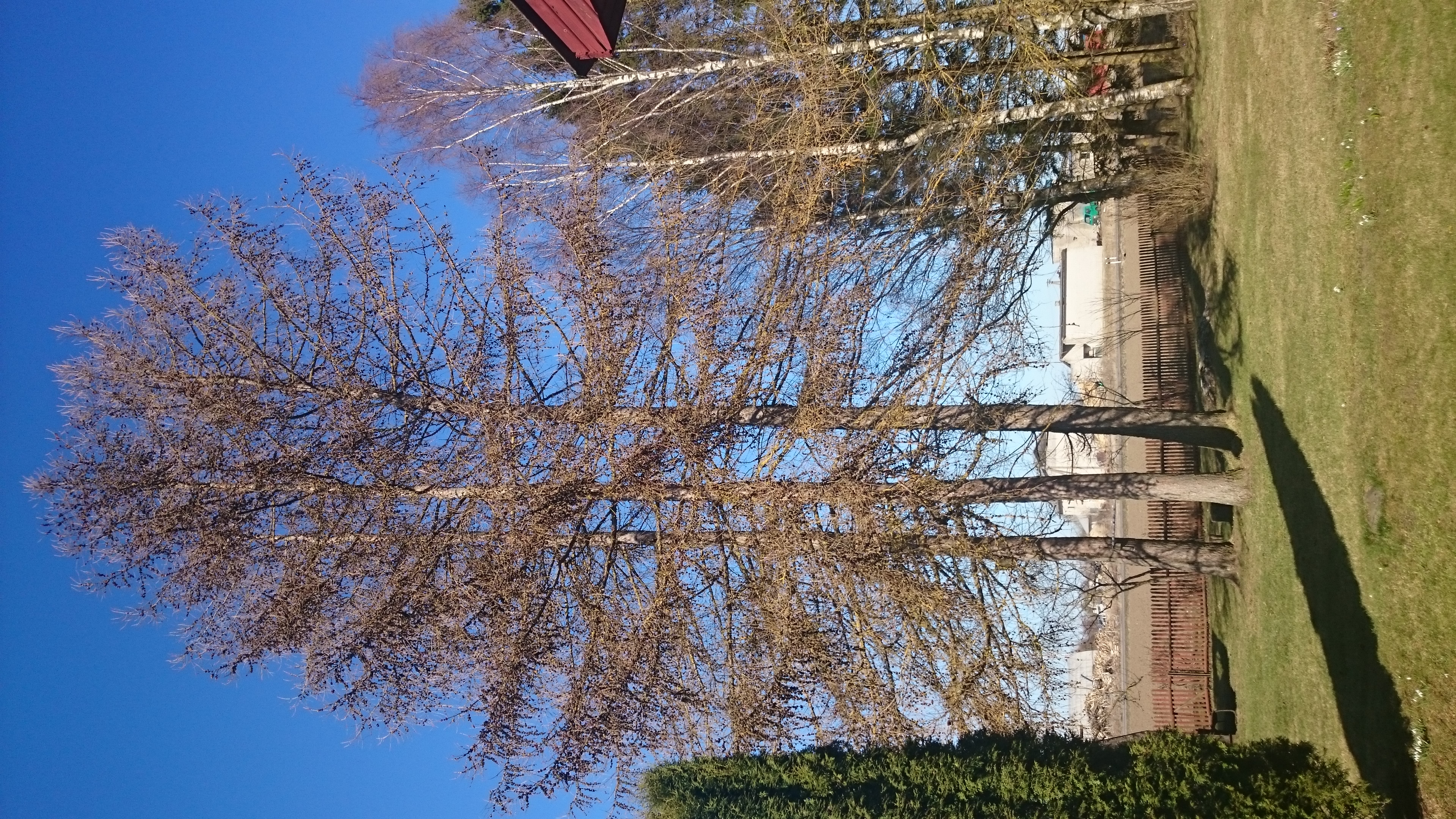 Aiaga piiratud õues kolme kõrge lehise maha võtmine. Lihtsalt langetada ei saa, sest pole ruumi. Asukoht Raplamaa Alu.