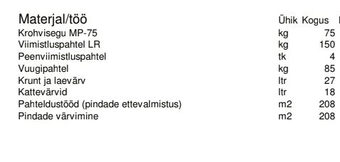 Pakkumine sisaldab seinte ja lae pahteldust ja värvimist ning kahe korstnajala viimistlust. Kõik materjalid, materjalide transport, töövahendid, teipimised, kaitsekatmised, prügi utiliseerimine jm töö teostamiseks vajalik sisaldub hinnas. Hind ilma käibemaksuta. Töödega saab märtsis alustada. |
