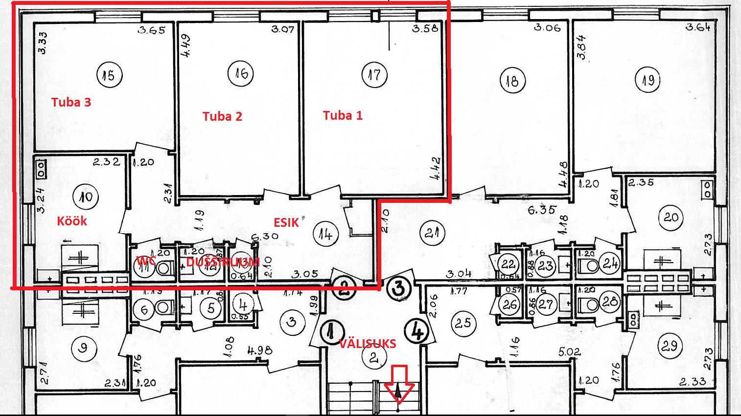 Kuigi mõnes lõigus on vahetatud mõned torud, siis on siiski näha vanu veetorusid ja kanalisatsiooni malmtoru. Veetorud ja kanalitorud tuleb asendada uutega. WC poti, dušši ja köögi kraani asukohad jäävad samadesse kohtadesse (Köögi valamu aukoht võib muutuda sama ruumi piires).