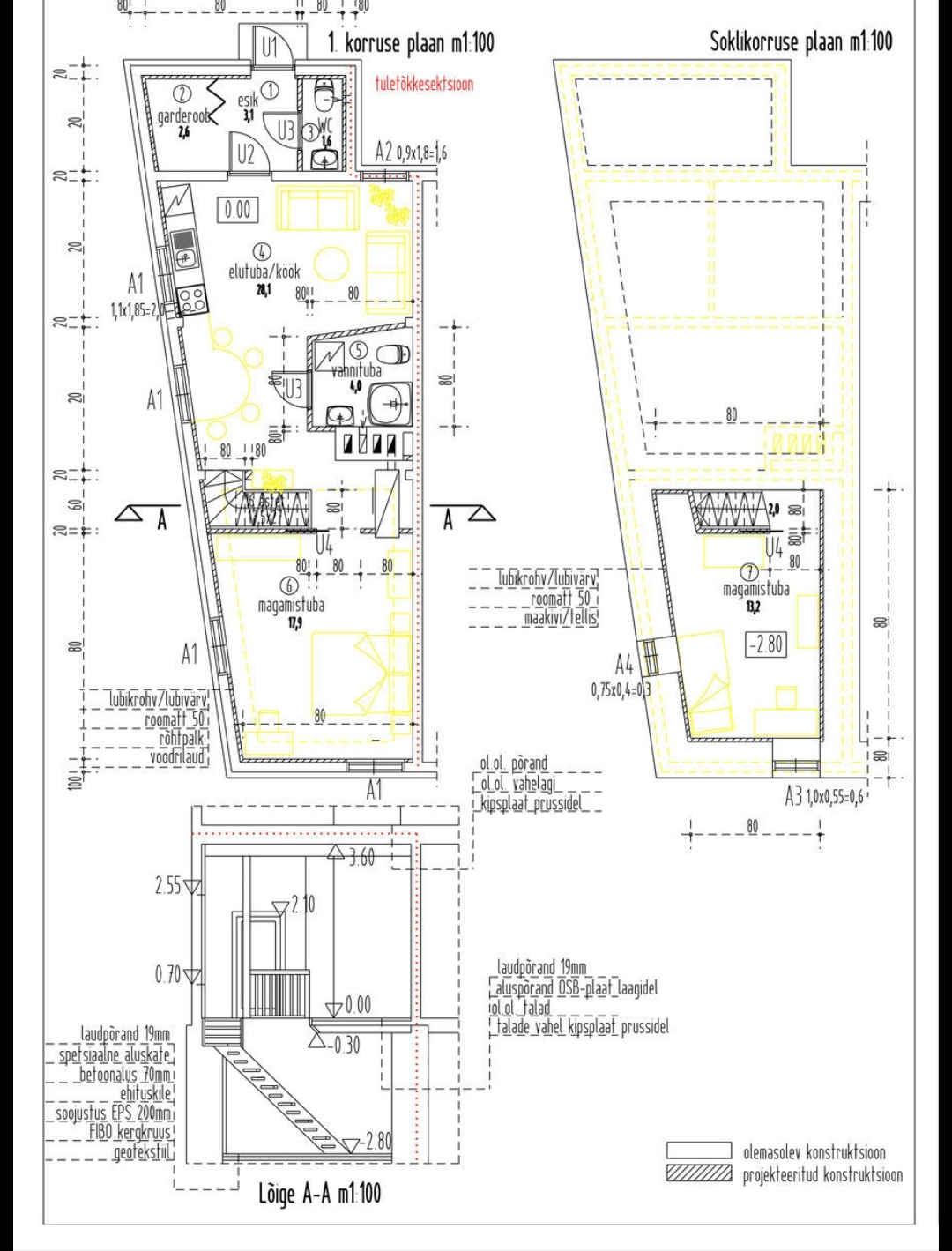 Lõpplahenduses tuleb avatud köök/elutuba, ning 2 eraldi magamistuba-1 esimesel korrusel 2. soklikorrusel.