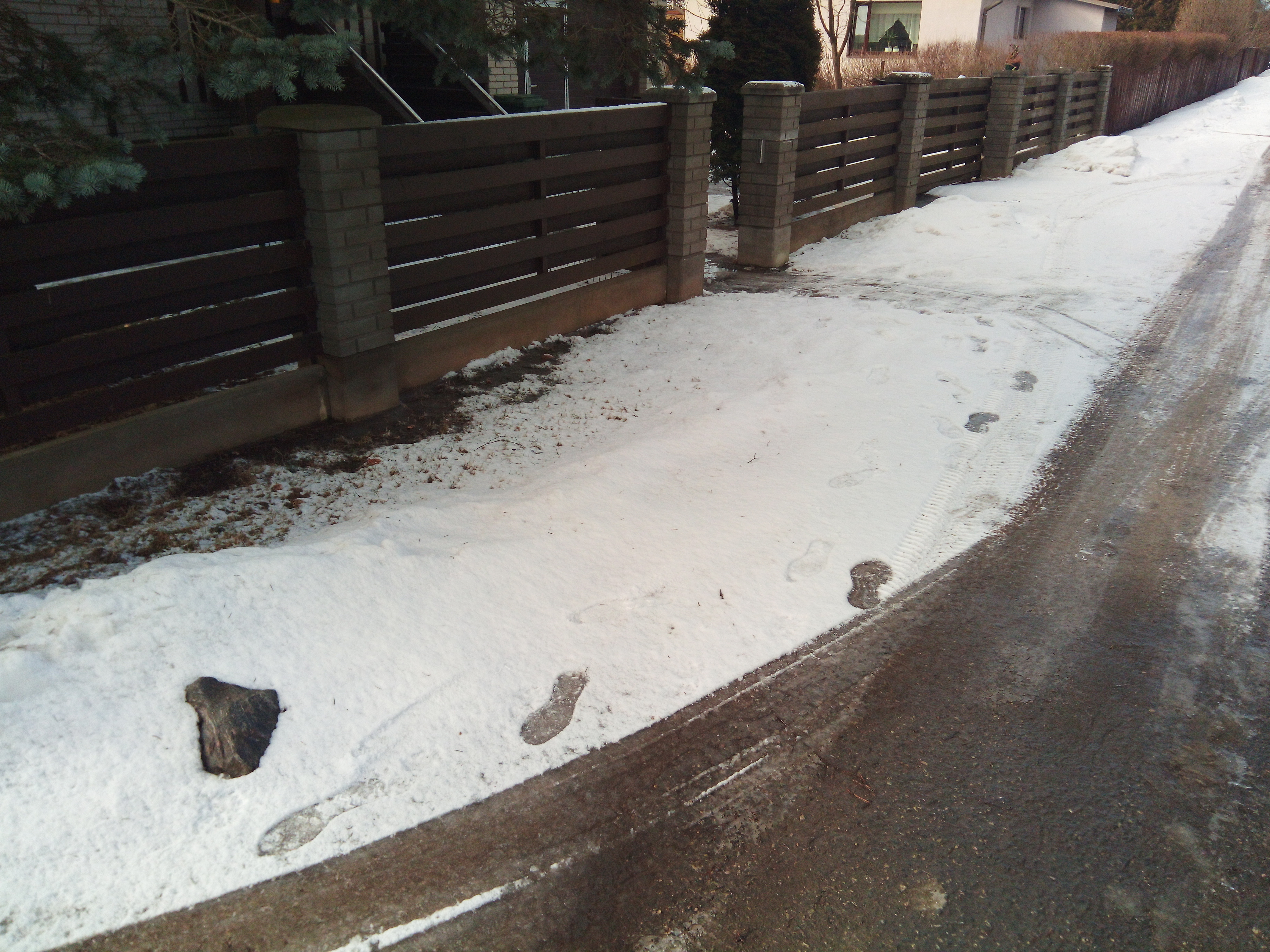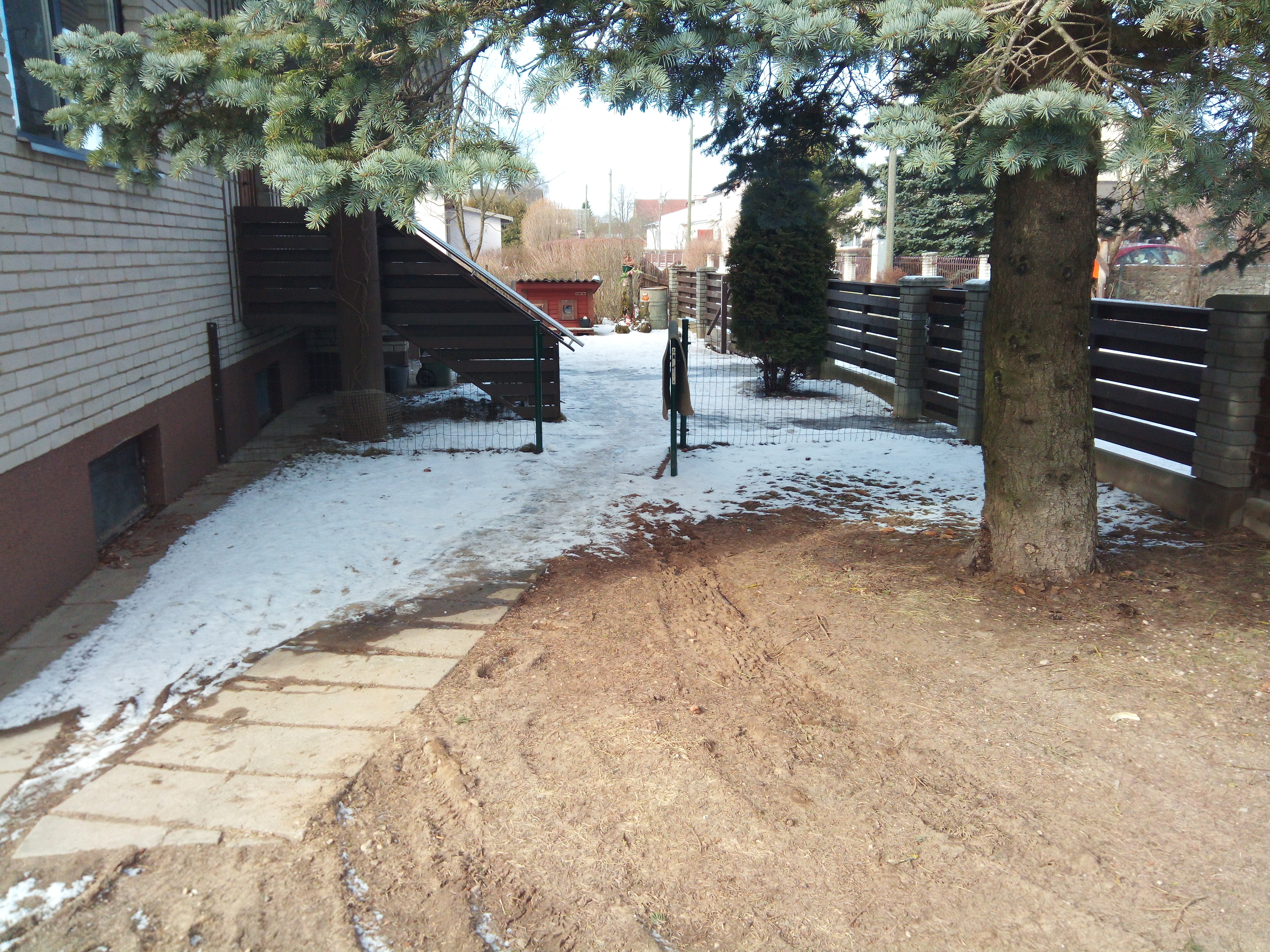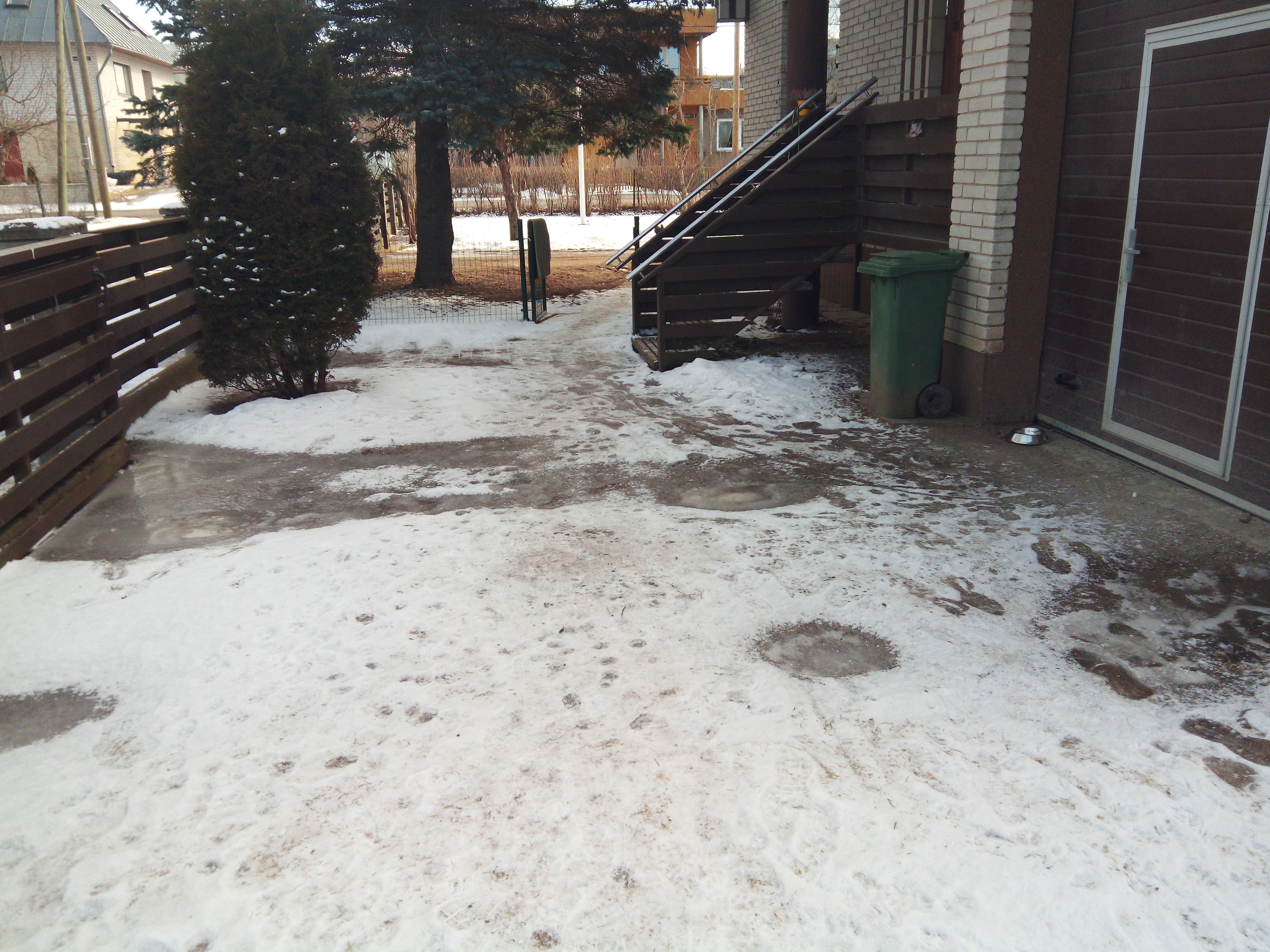 Materjalina soovin nunnakivi ( 75% hall, 25% pruun) ja kahte serva (ca.15 m.) õhukest äärekivi. Kuna tänav asub majast natuke kõrgemal, peaks vist ka mingi vihmavee äravoolurenni paigaldama (samuti tsementkivist).