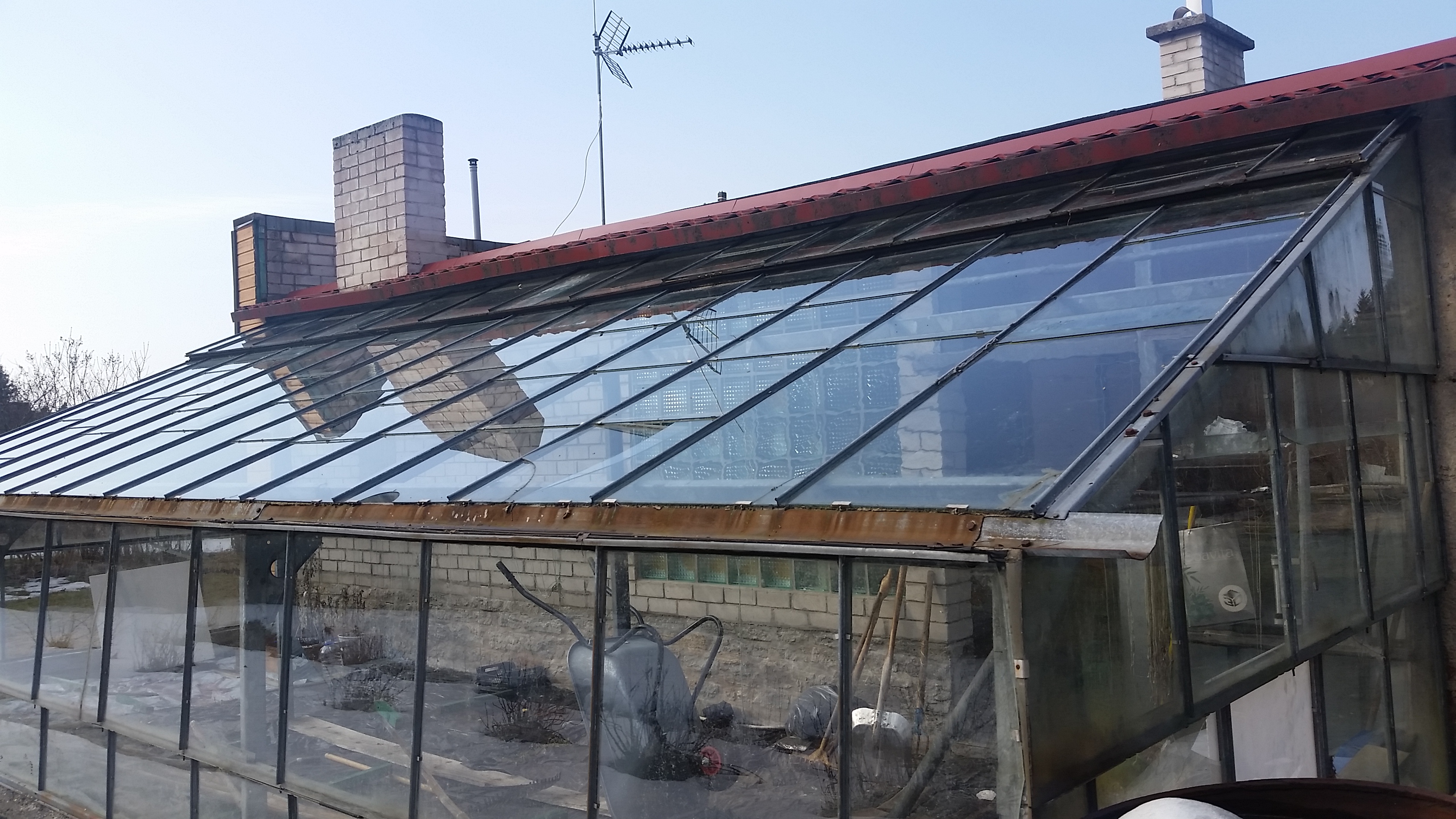 Vaja on kasvuhoone katuselt võtta üles vanad klaasid ja asemele paigaldada tugev polükarbonaat. Paigaldada nii et ei laseks vett läbi. Katuse mõõtmed on umbes 9x3.5m. Tsingitud raam. Klaasid ei sobi, kuna katus laseb ohtralt vett läbi, ja mõned klaasitükid on purunenud. Vanad klaasid vaja ära viia.
