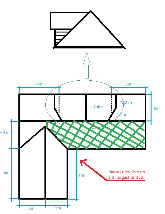 2-kordsel majal Haapsalus on vaja vahetada vana katusekate (valtsplekk) uue, klassik stiilis tsink-pleki vastu. Mõõdud on all oleval pildil. Rohelisega märgitud ala on juba uus ja seda ei vaheta.