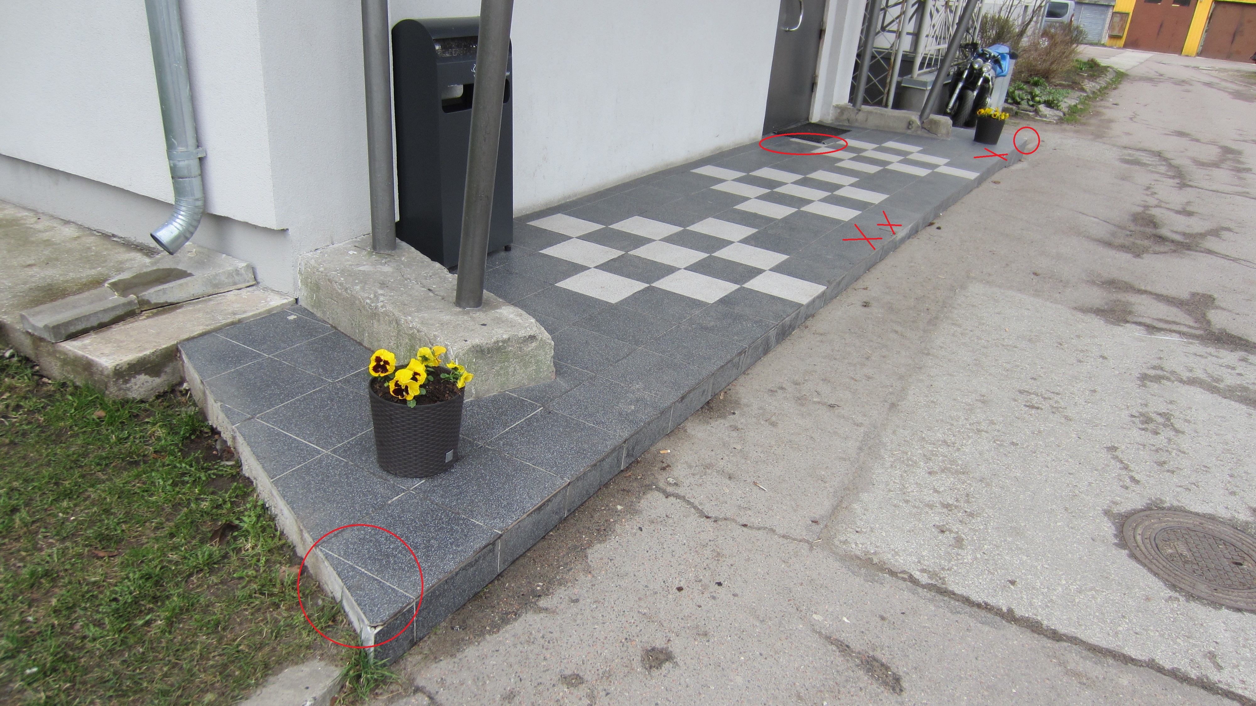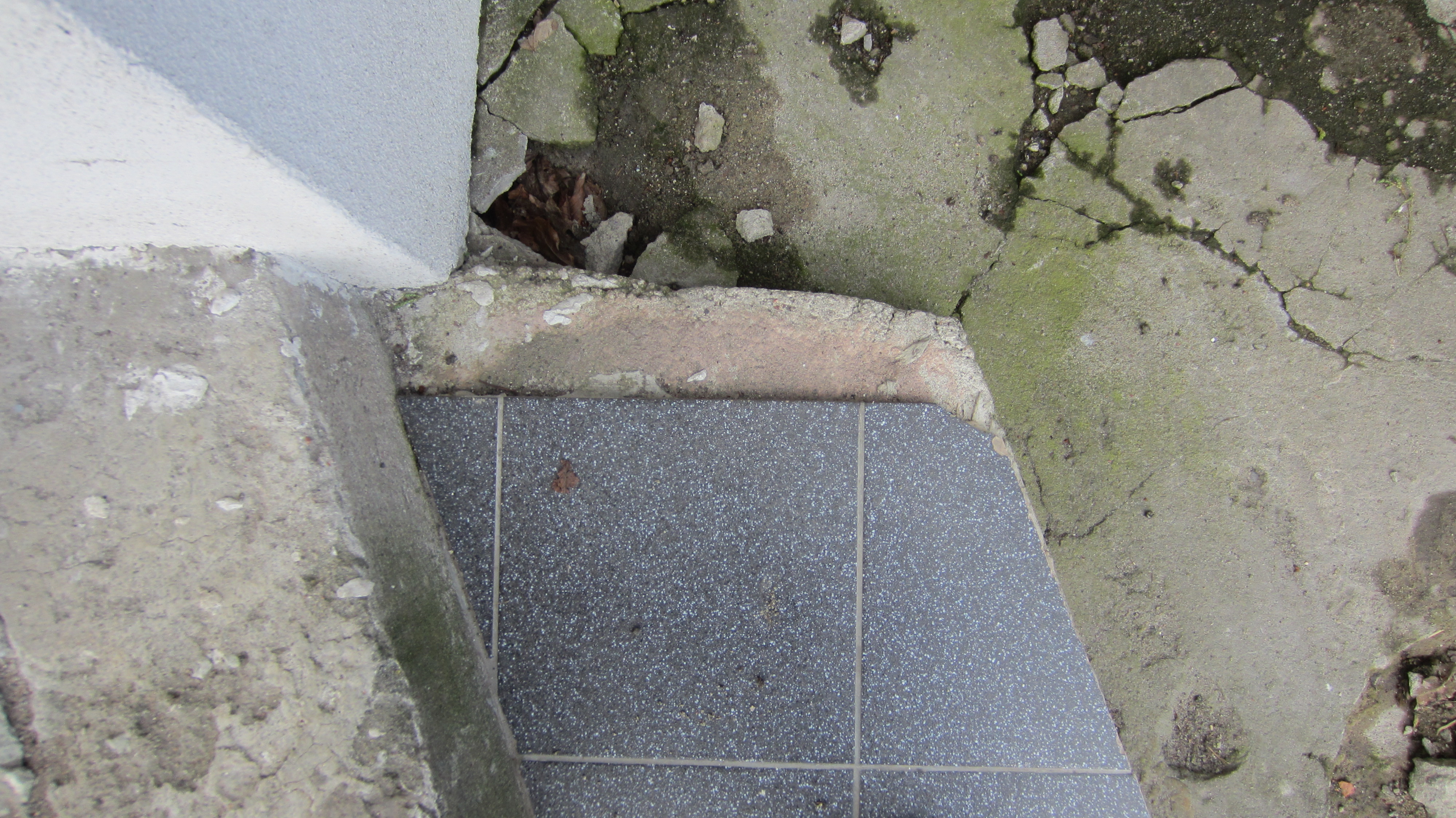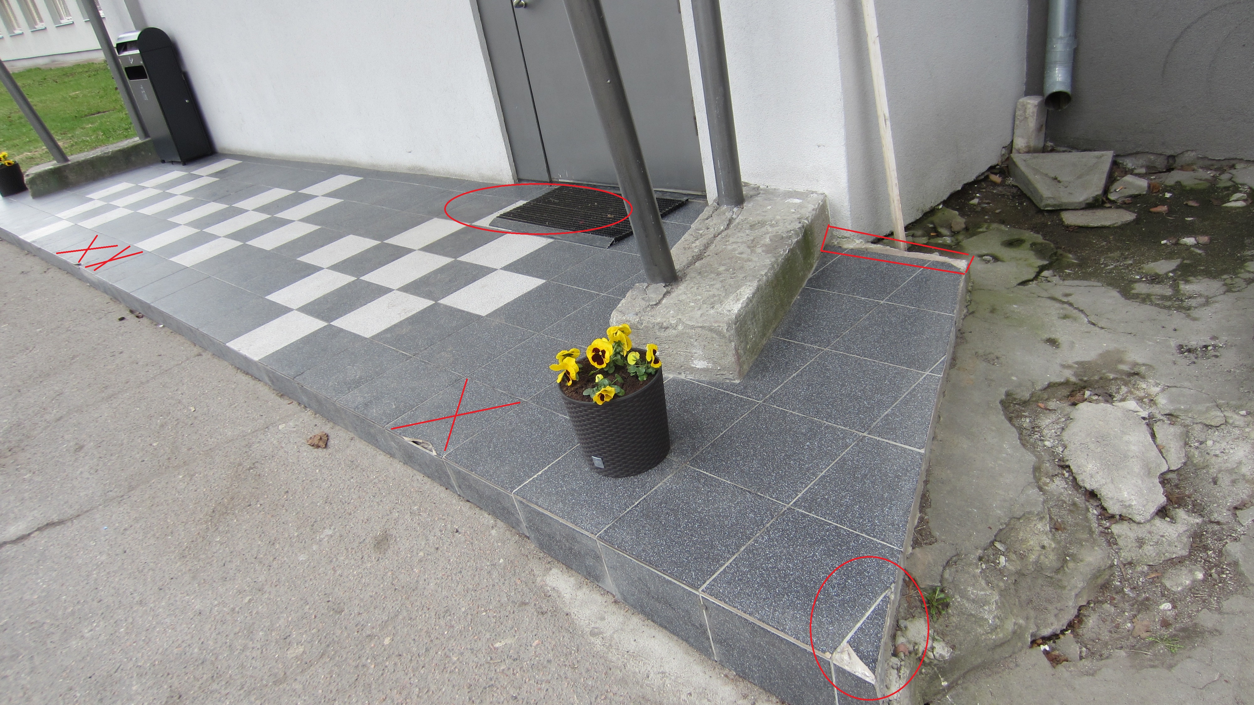 2) Väistrepil on vaja asendada katkised plaadid ehk kolm tervet plaati ja ühest plaadist tagada kaks kolmnurkset trepi otsmist nurka ning veel ühest plaadist saab tagada trepi parempoolse ülemise nurga mõõtu lõigatud rea. Poollahtised plaadid tuleb Teil tervena eemaldada, puhastada ja kasutada samasid plaate uuesti paigaldusel.