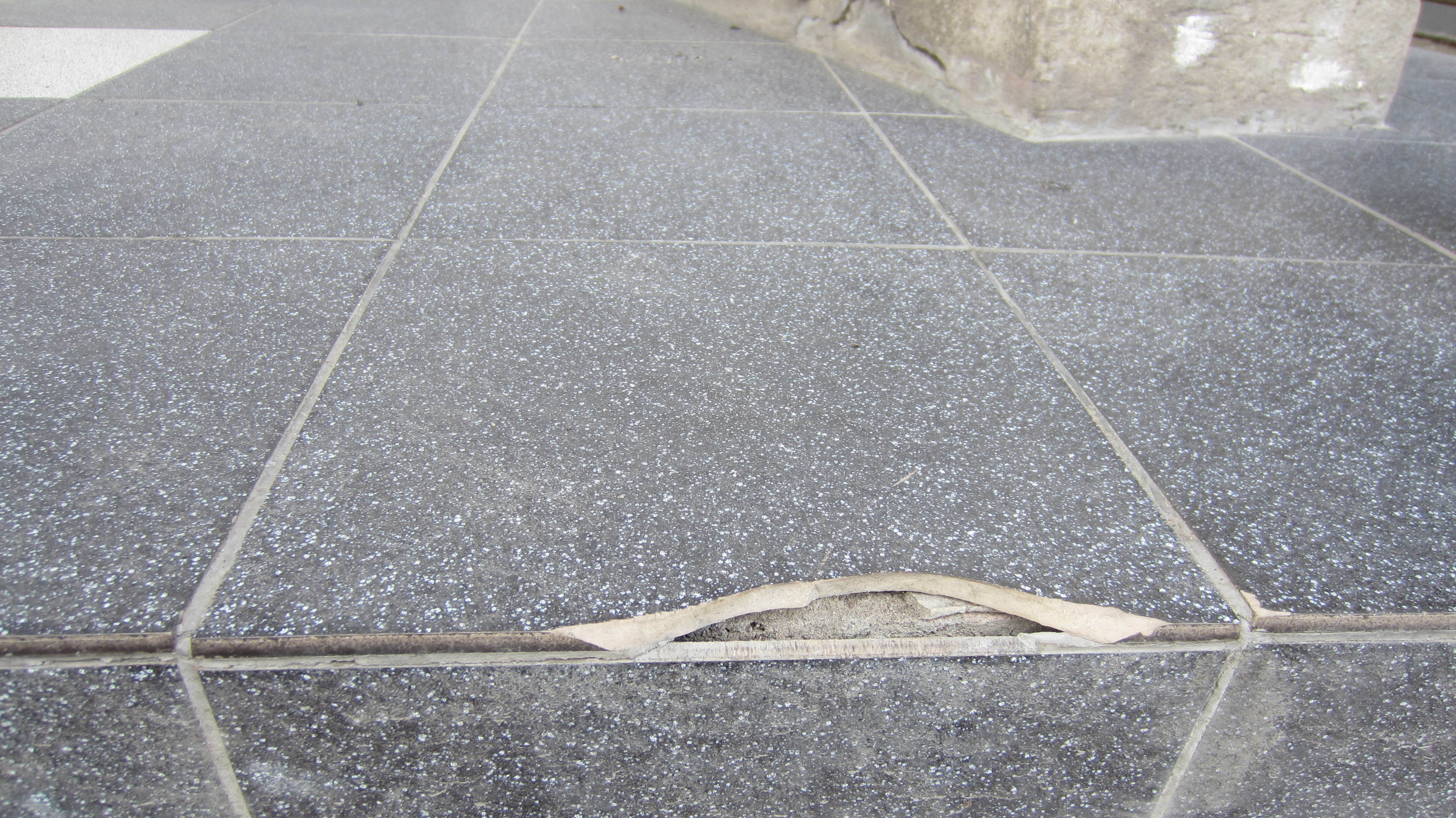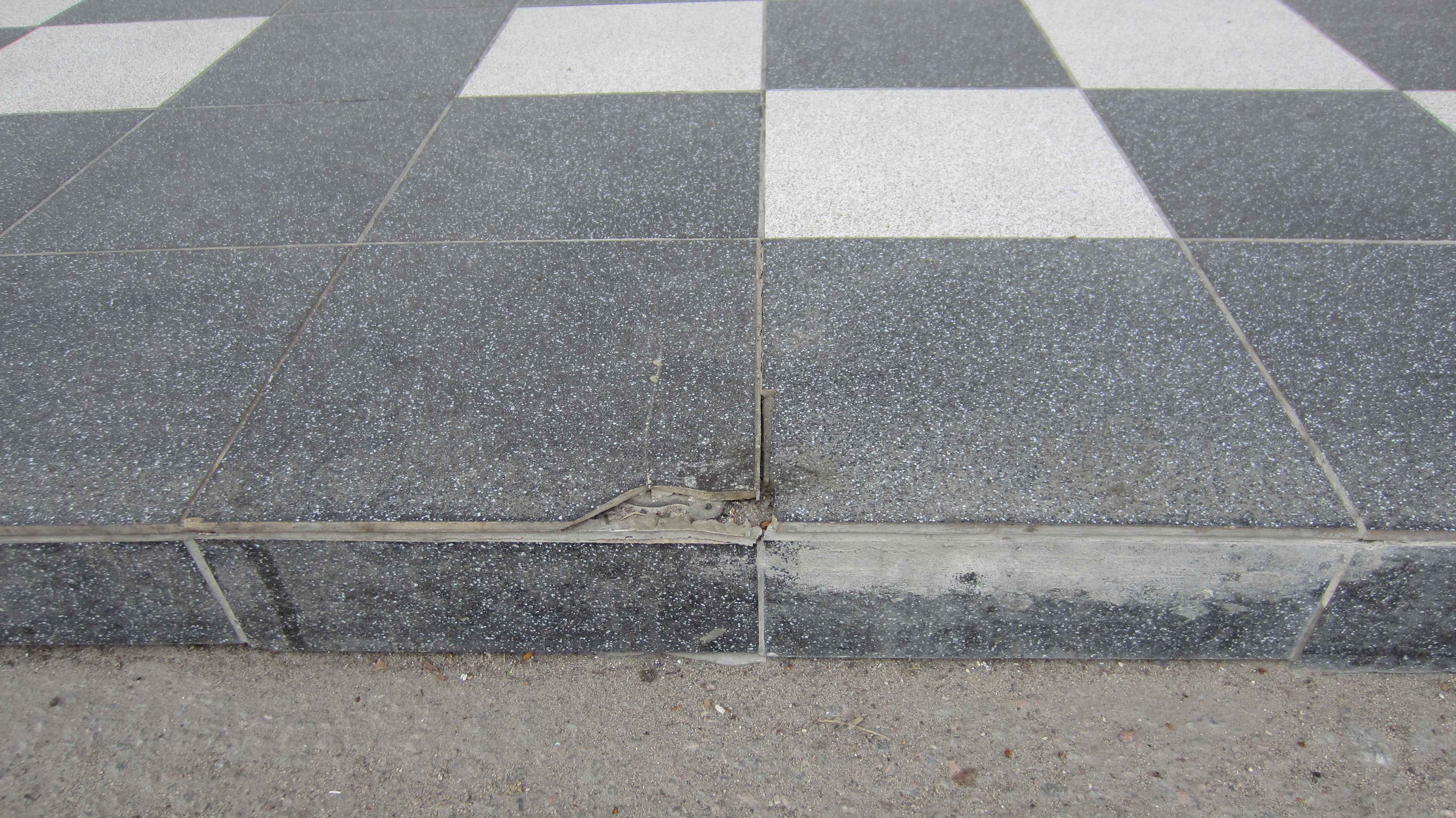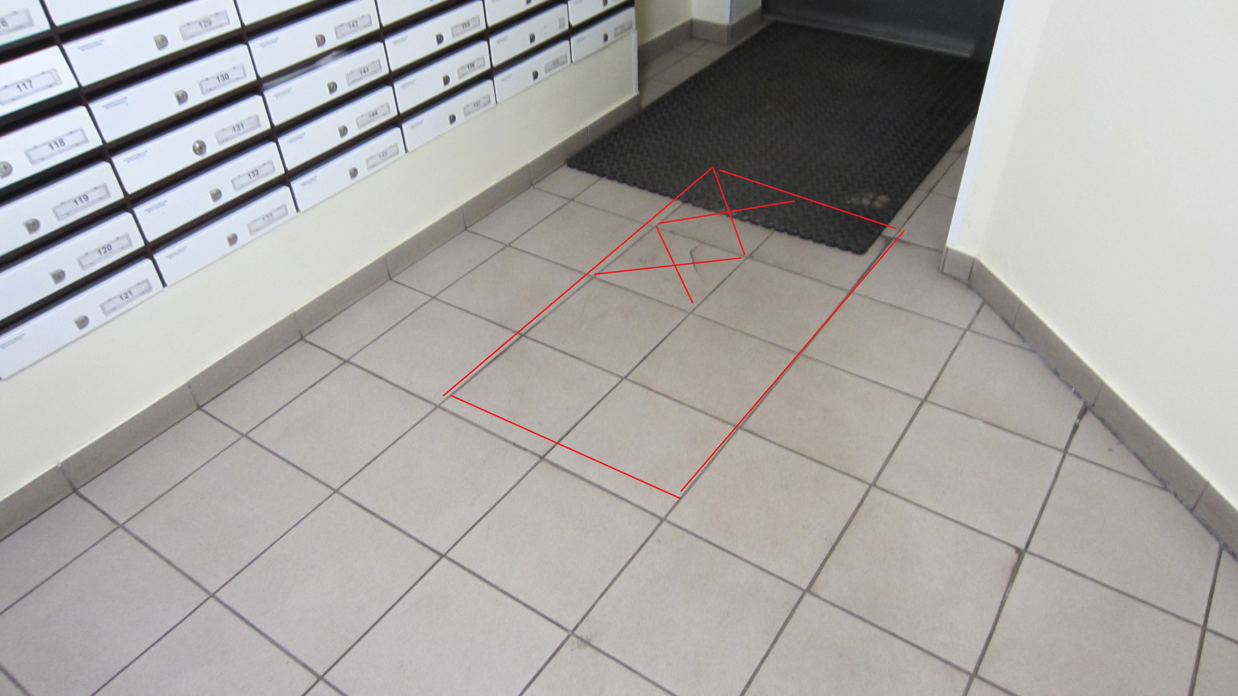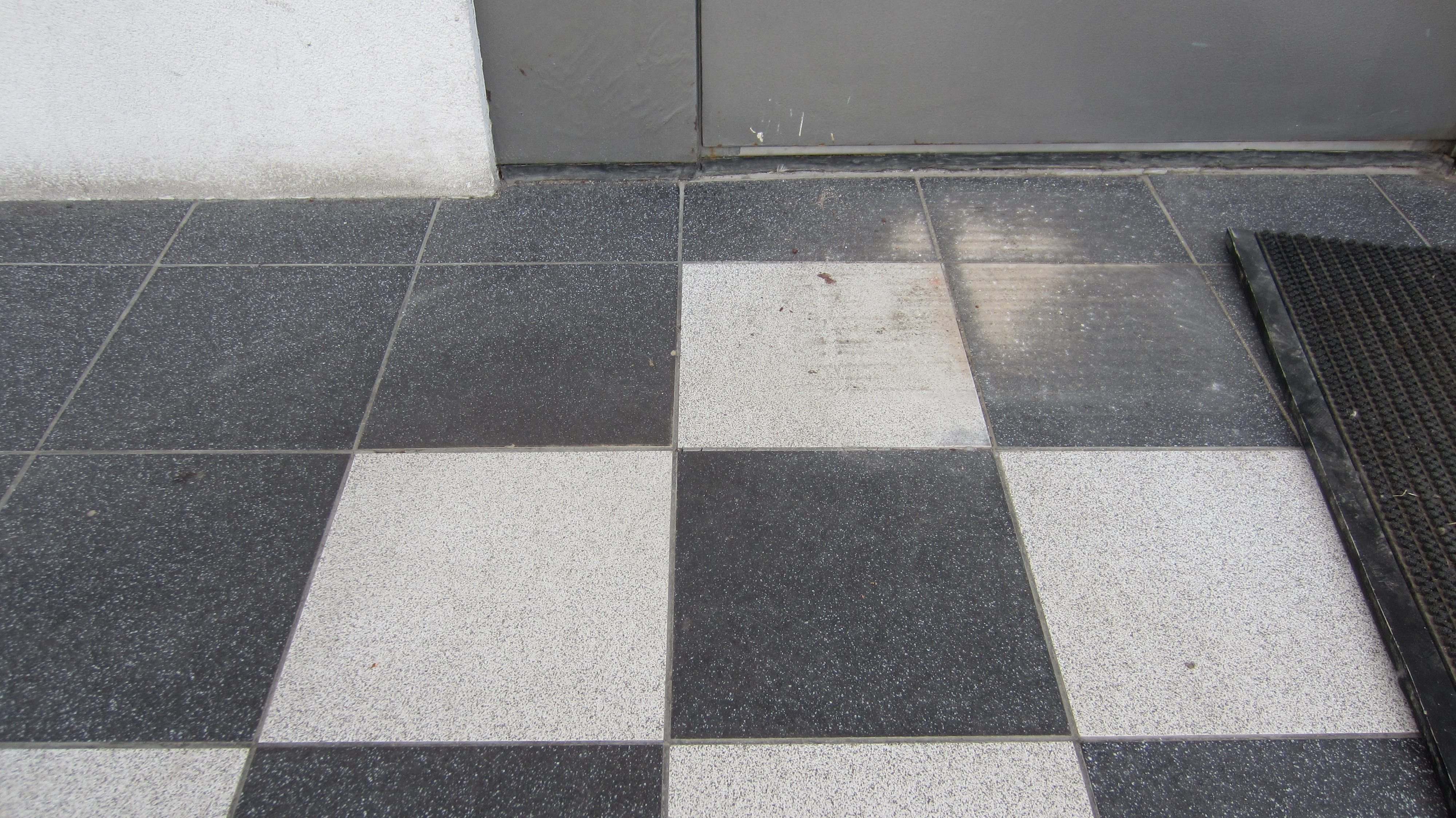 2) Väistrepil on vaja asendada katkised plaadid ehk kolm tervet plaati ja ühest plaadist tagada kaks kolmnurkset trepi otsmist nurka ning veel ühest plaadist saab tagada trepi parempoolse ülemise nurga mõõtu lõigatud rea. Poollahtised plaadid tuleb Teil tervena eemaldada, puhastada ja kasutada samasid plaate uuesti paigaldusel.