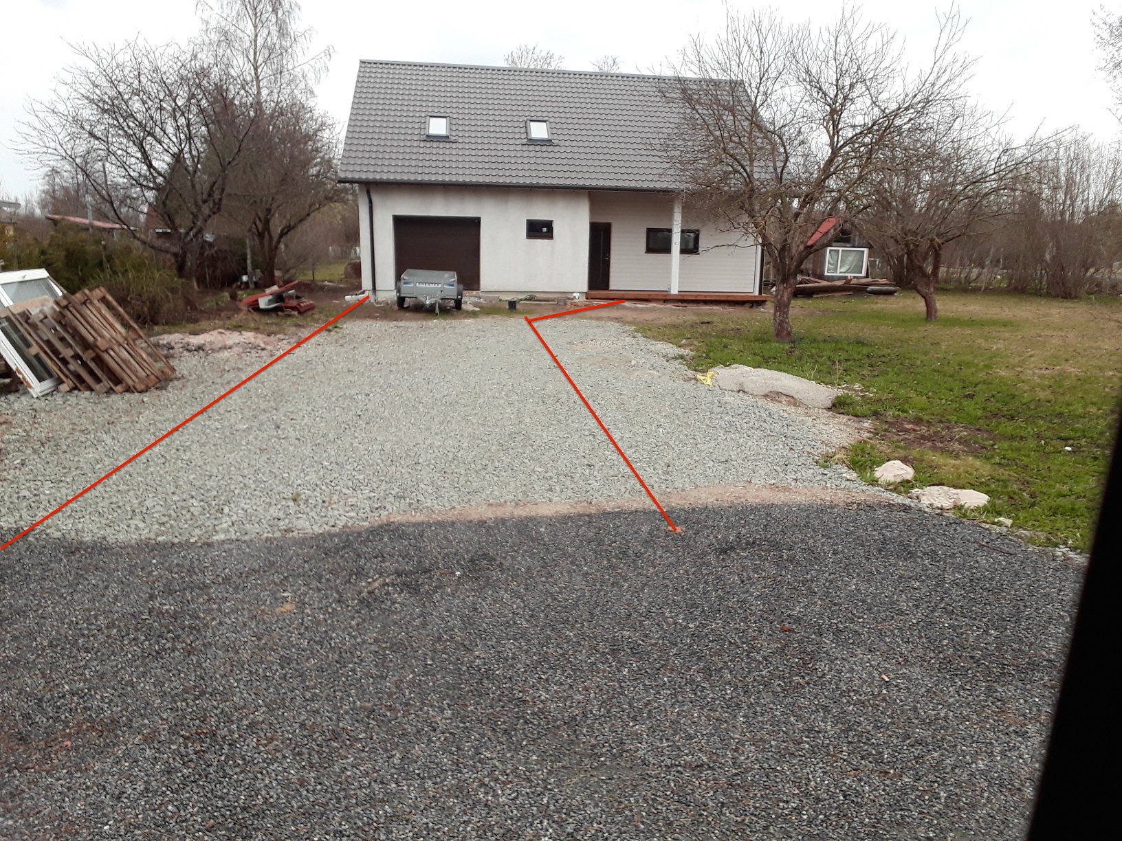 Kivi jookseb garaazi ukse alt kuni tänava asfaltini ühtlase kalde all, mis tähendab, et olemasolevat killustikualust tuleb tänavapoolt pisut koorida ja garaazi eest pisut täita.