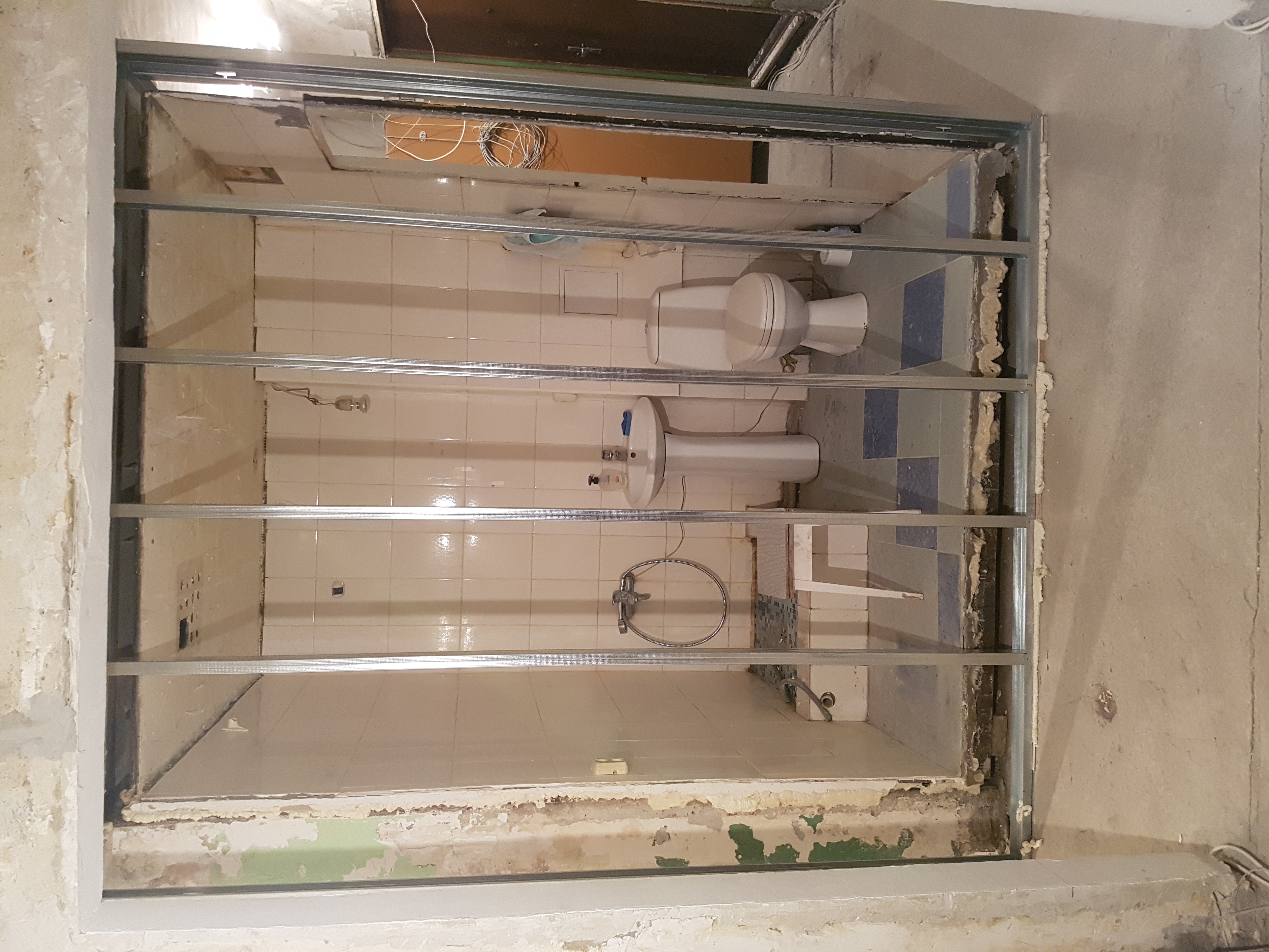 Püstitada kaks kergseina (kips/puitlaastplaat)- 2+2 m. Põranda tasandamine seguga. Ettevalmistus kuni plaatimiseni.