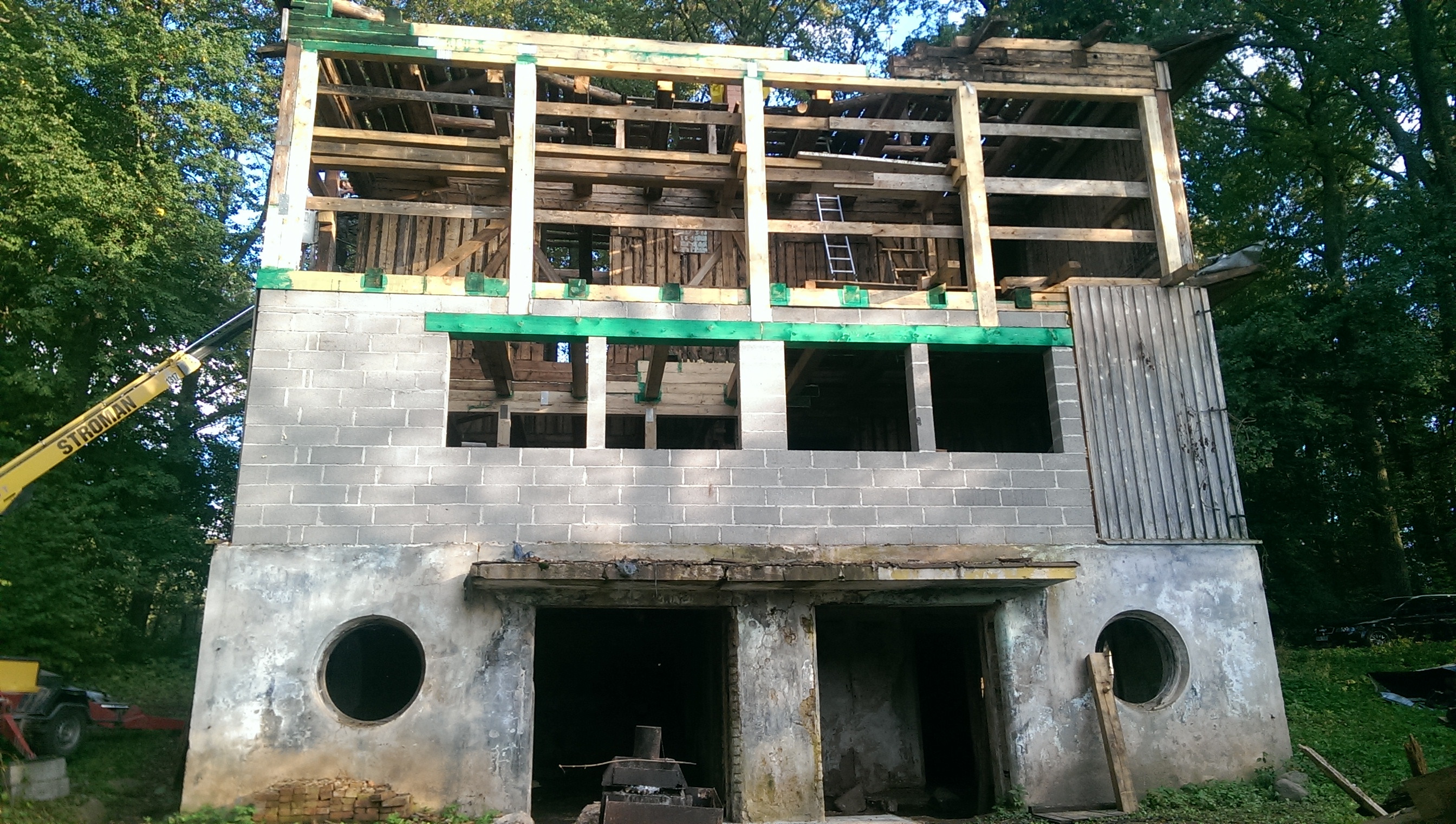 Hoone puitraami ehitamine PUR vahuga soojustamiseks. Hoone fassaad on eelnevalt eemaldatud. Karkass tuleb 10cm majast eemale tuua, et selle alt täita vahuga.