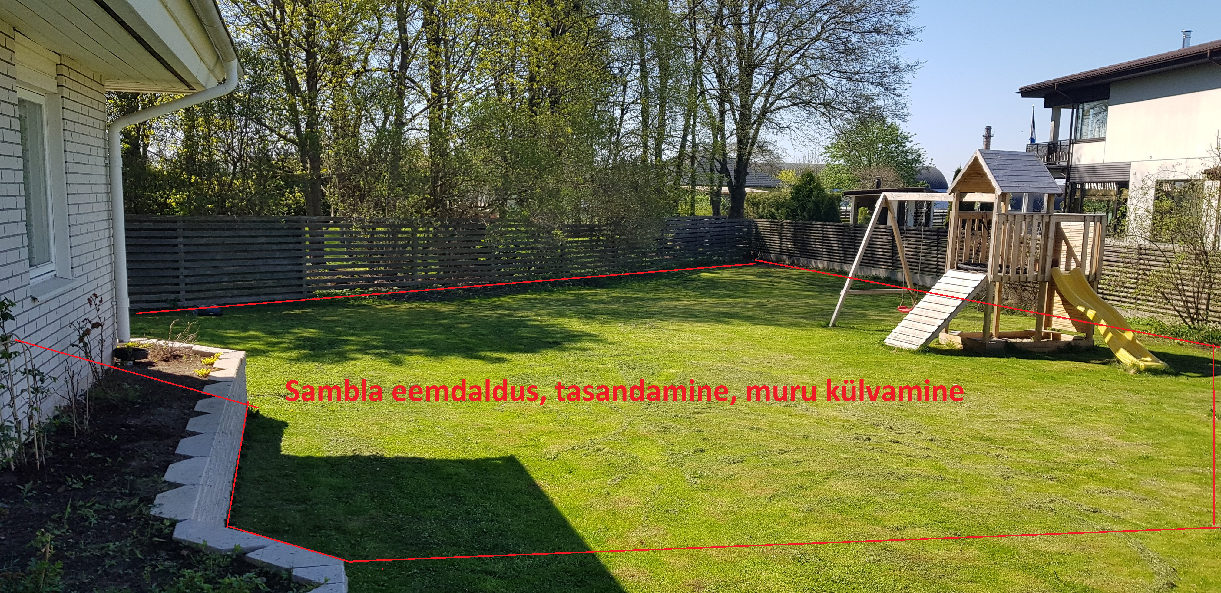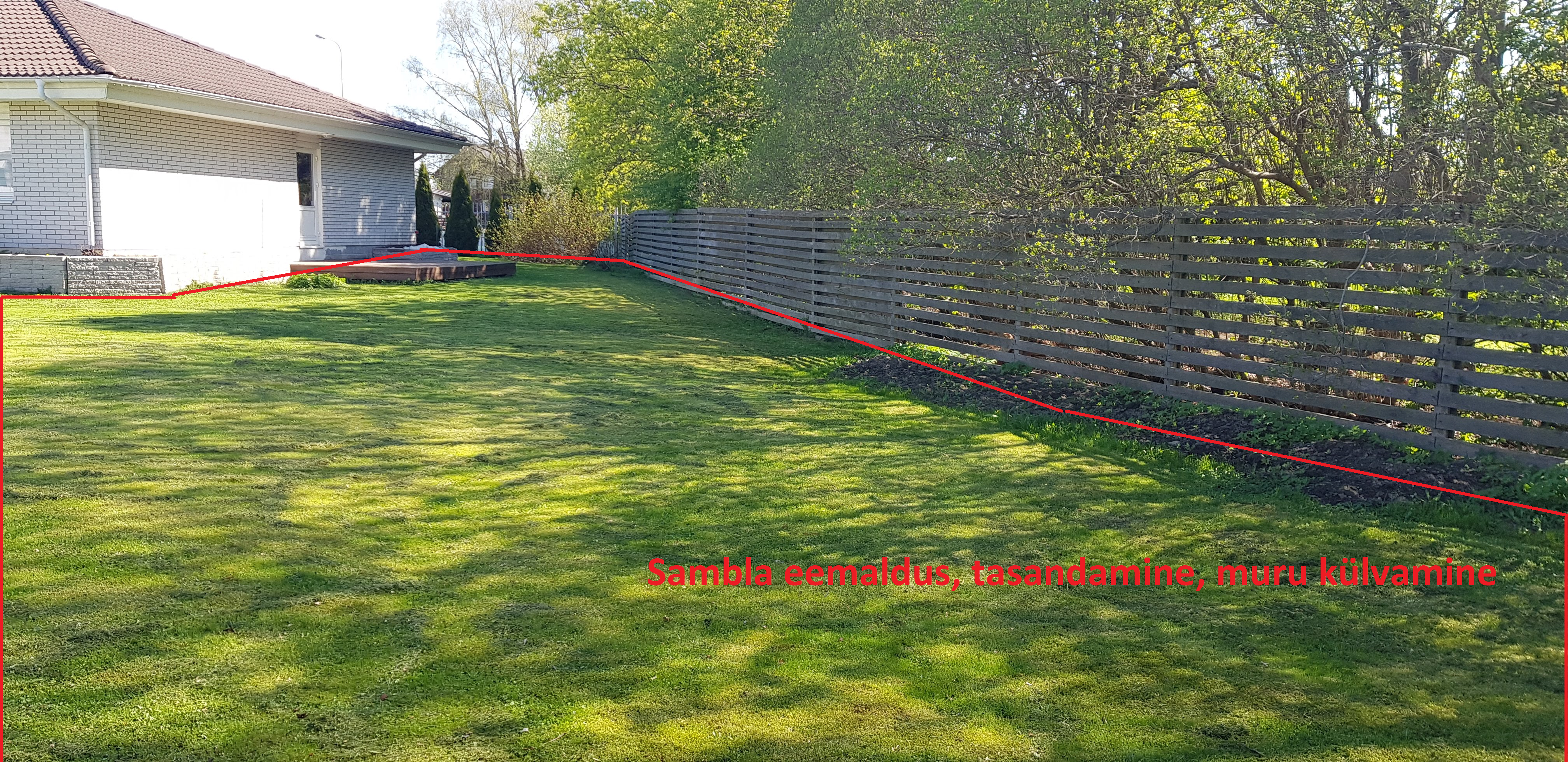 * sambla eemaldus, tasandus, muru külvamine suuremal määral ~600m2 alal, väiksemal määral kogu aia ulatuses (alad piltidel)
