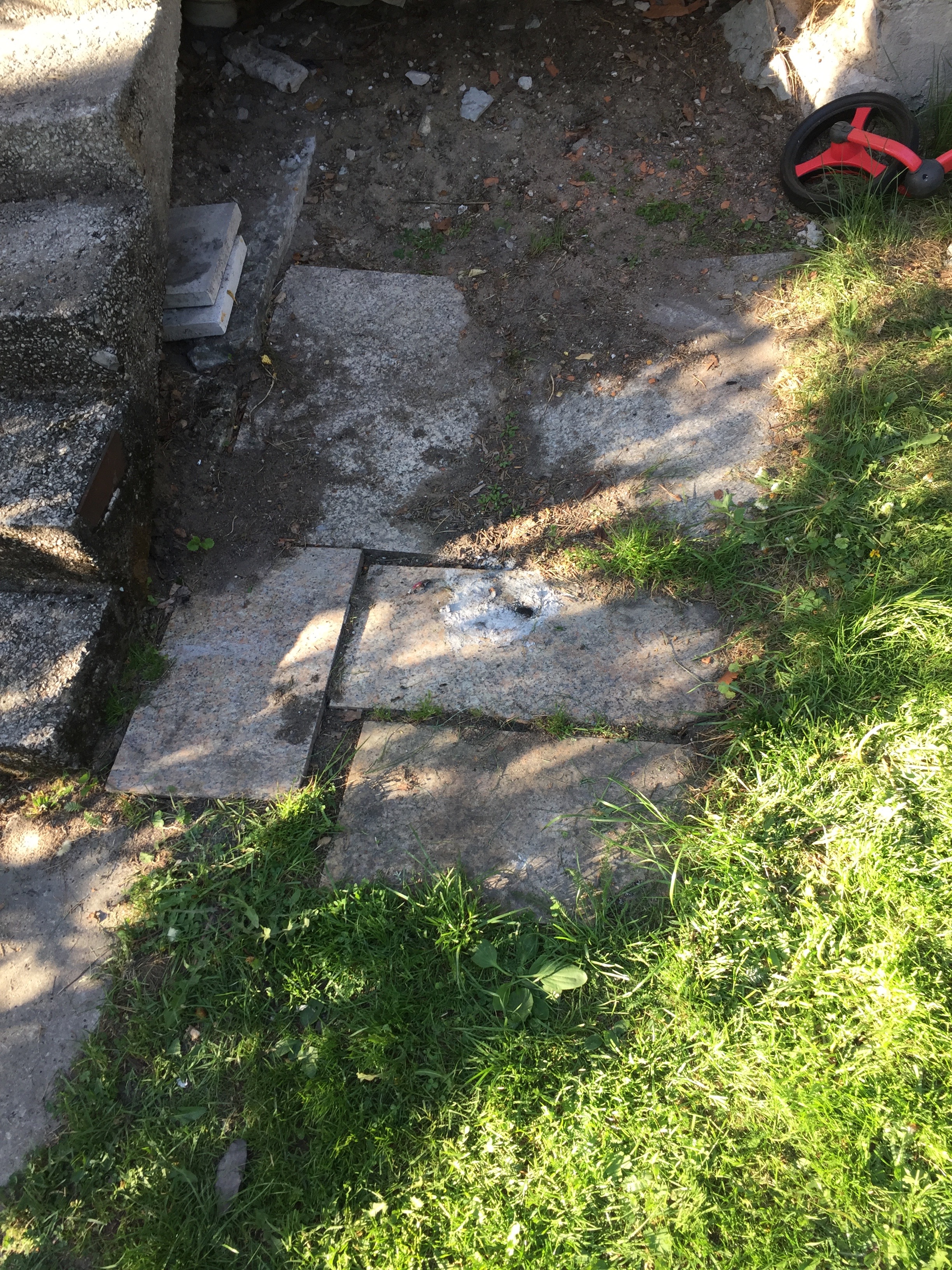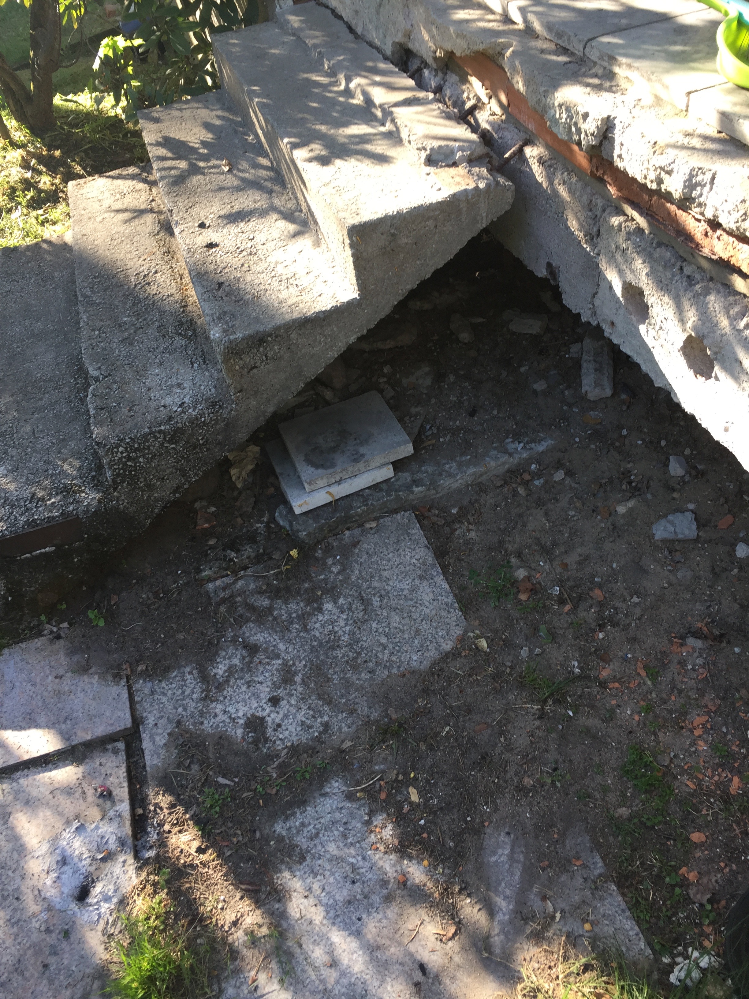 Vaja lammutada betoontrepp, 5 astet, laius 1400. Trepp on kinnitatud armatuur-raudadega maja vundamendi külge, aga kipub ära kukkuma. Vaja ka minem vedada. Ühtlasi vaja maast lahti kangutada ja minema vedada 12 tk paksemaid kiviplaate ca 680x270 (mingi nõuka aegne suurus) ja ca 2m2 muid kiviplaate.