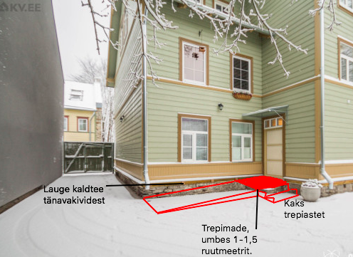 PS! Illustreerival fotol on kalle kuni välisukseni. Mina sooviks aga nii, et välisukse ees on umbes 1-1,5 ruutmeetrine made, mis oleks välisuksega täpselt samal tasapinnal, sest välisuksest peab saama ratastooliga lihtsasti sisse. Seetõttu on oluline, et kuskil ei oleks ühtegi astet.