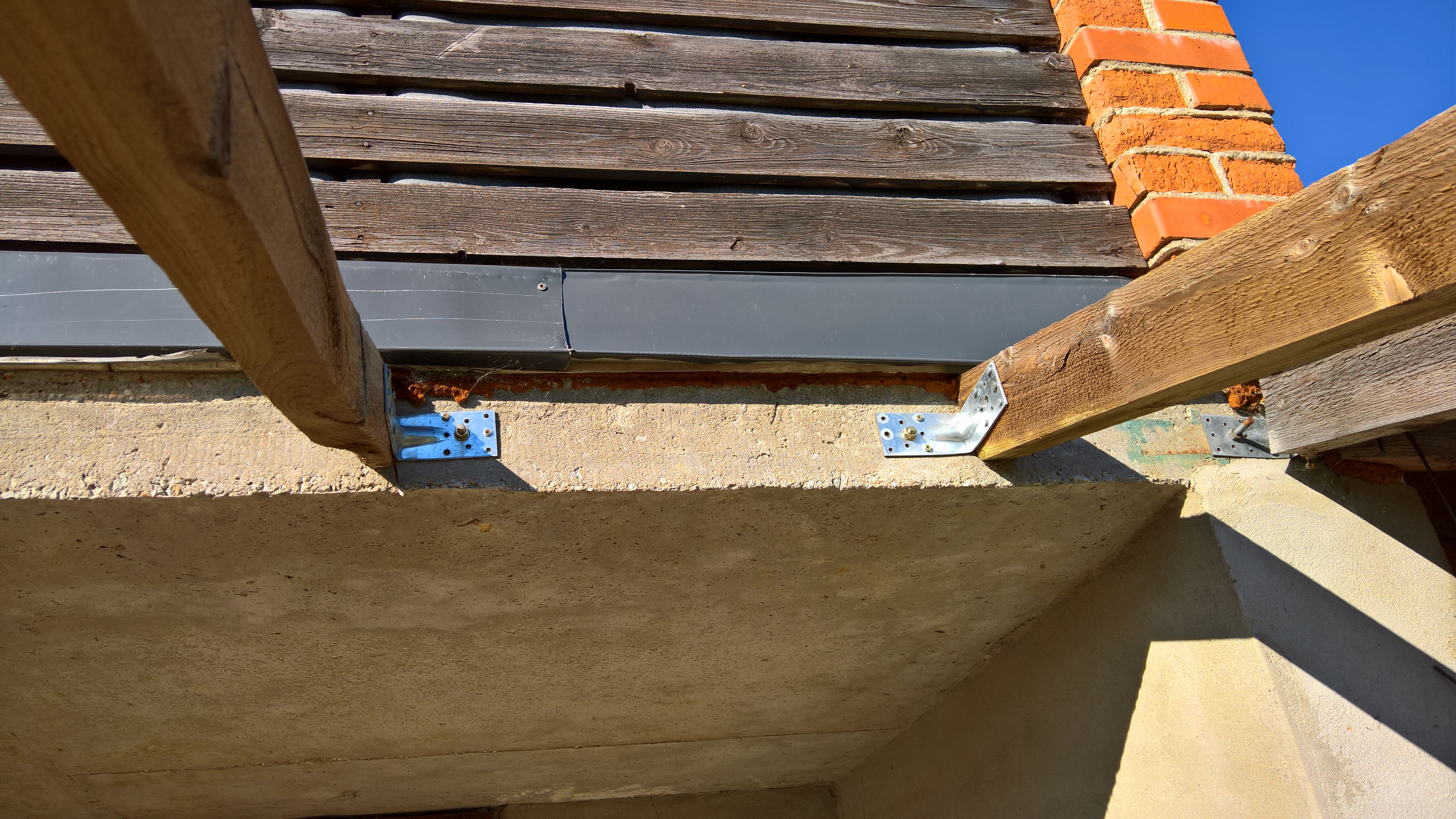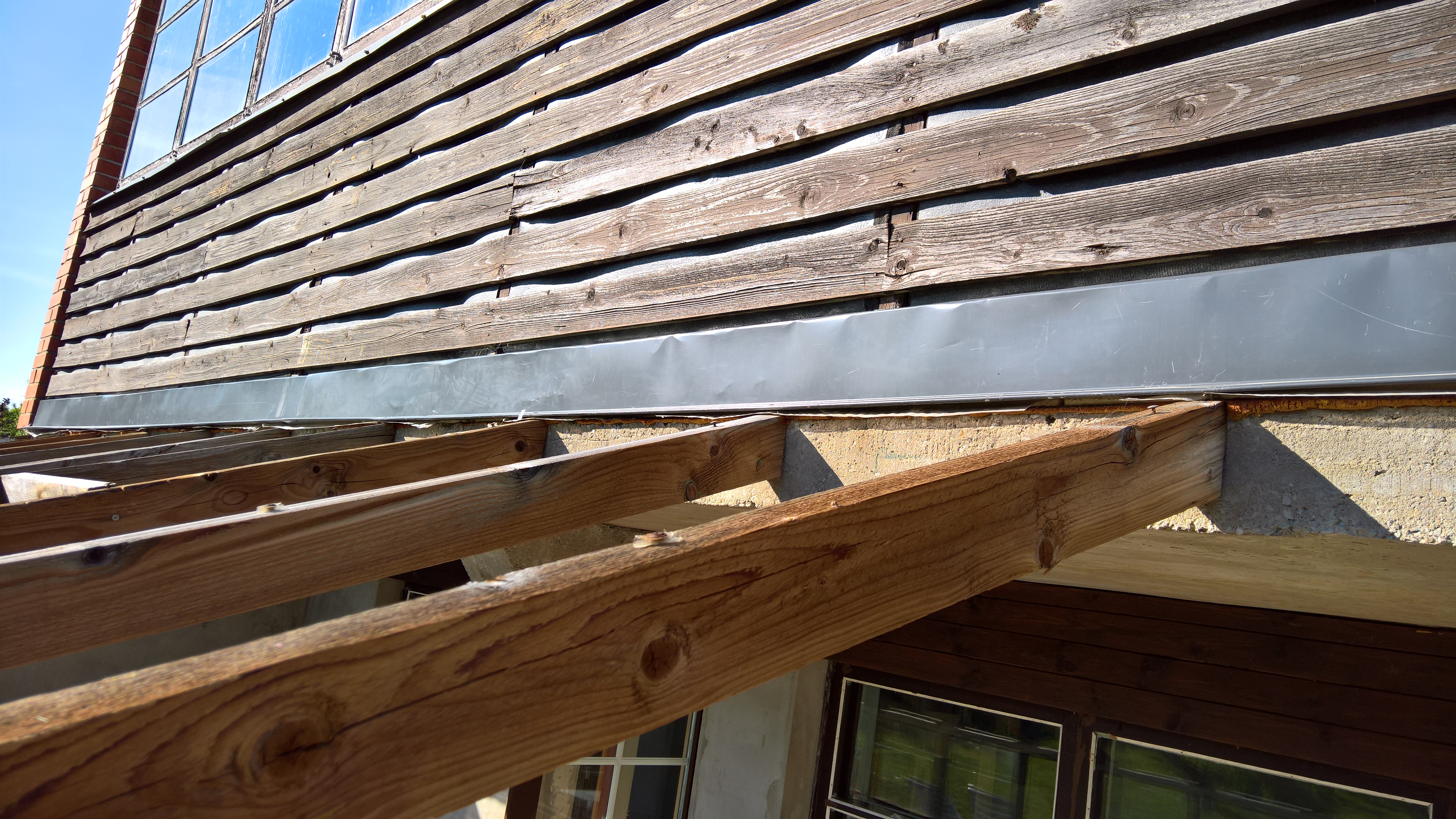 Katuse talad on kinnitatud teise korruse rõdu serva külge, aga on aia poolsest servas liiga madal. Vajalikud on uued talad ja katus väikema kaldega, et katuse alt oleks võimalik igas suunas välja kõndida. Terrassi katuse materjaliks kindlasti plekk, mitte mõni plast või laineplaat.