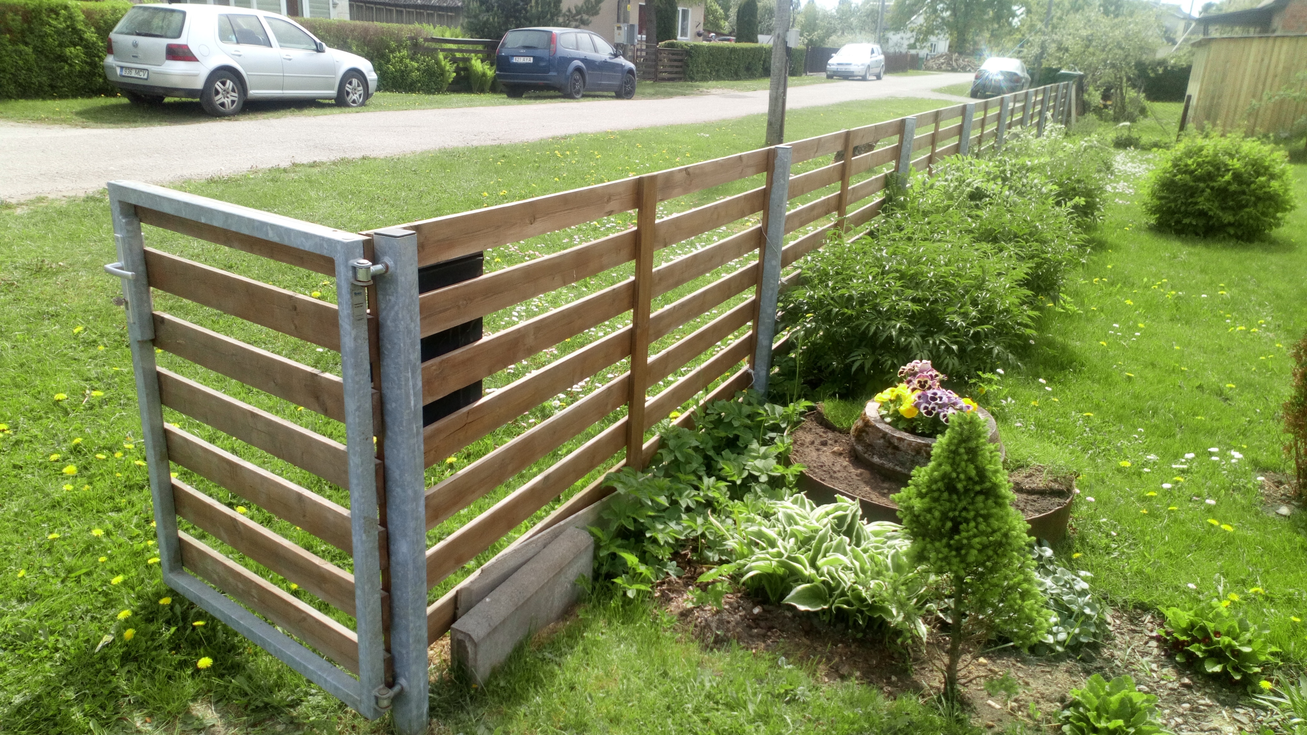Uus aed peaks vastavalt fotodele tulema horissontaalne puitaed, kus laudade vahekaugus on 5 cm. Aia kõrgus 1.3m. Laudosa kinnitatud tsingitud postidele.Aias on samuti jalgvärav 1.1m lai ja värav autole 3.2m lai. Fotodel olev uus aed on soovitusliku konstruktsiooniga. Ootame võimalikult soodsat lahendust