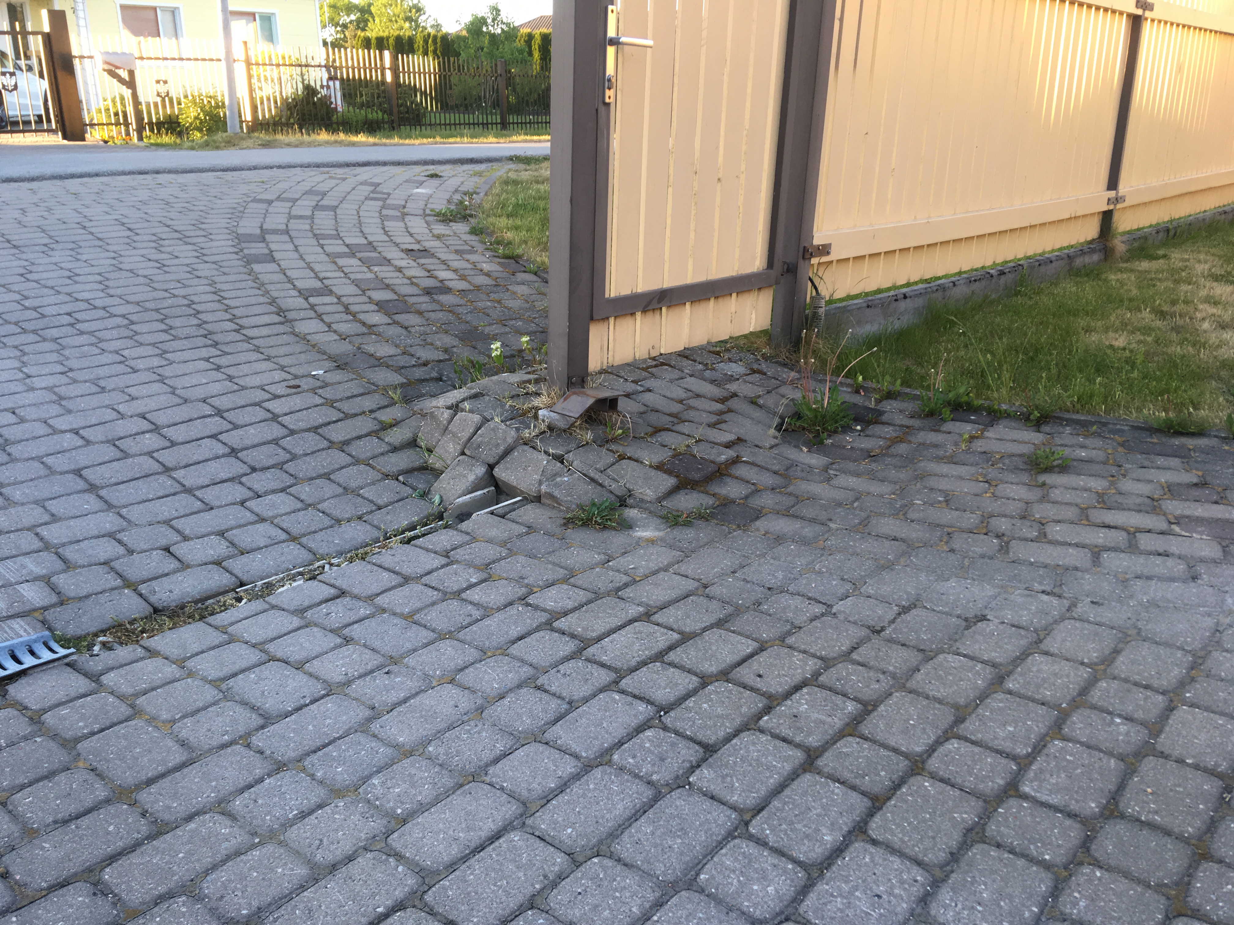 7) Väljas auto sissesõidutee kõrval on jalgvärava postid tõusnud ca 20 cm ja postid on viltu vajunud. Ellimineerida probleem jäädavalt, samuti lahendada auto sissesõidutee.