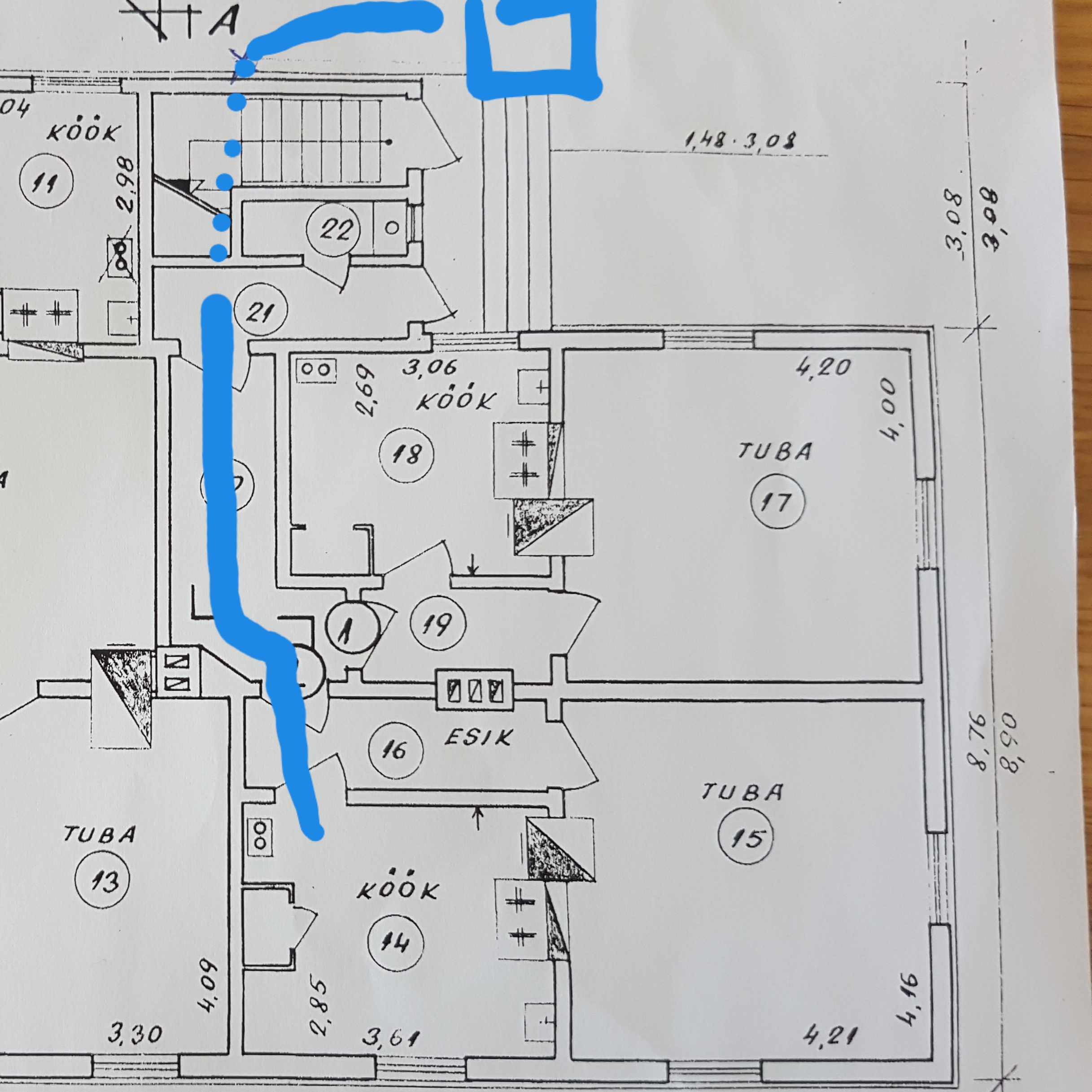 Puumajas asuvasse korterisse planeeritakse ehitada duširuum ning selleks on vaja korter üldkanalisatsiooniga ühendada. Majas on vaja paigaldada ca kuni 10m torusid, väljas on vaja kaevata olemasoleva kaevani ca 4 m. Plaanil on sinise värviga joonistatud planeeritav kaevamise tee. Vajadusel välja vahetada vahekaev (sinine ruut plaanil).