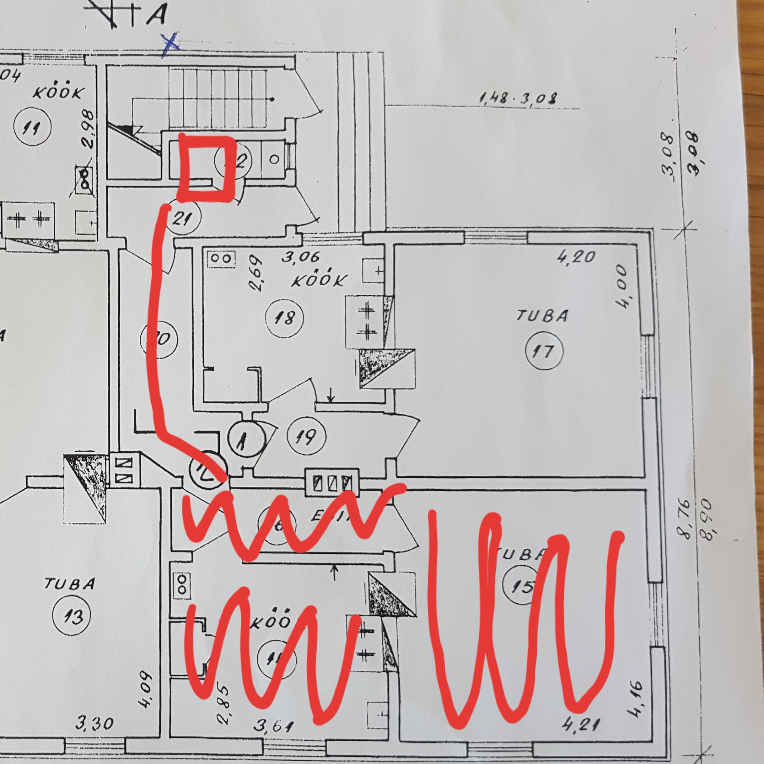 Koridori pindala 10m2, dušš+köök 10m2 ja elutuba 17m2. Plaanil on punase värviga märgistatud põrandaküte ala ning torude tee pumbani (punane ruut). Palun küsige lisainfot.