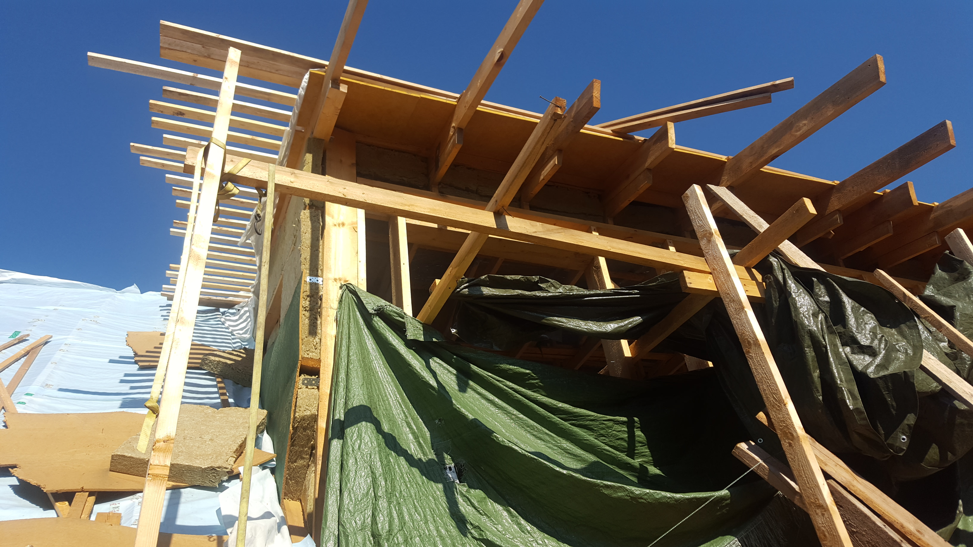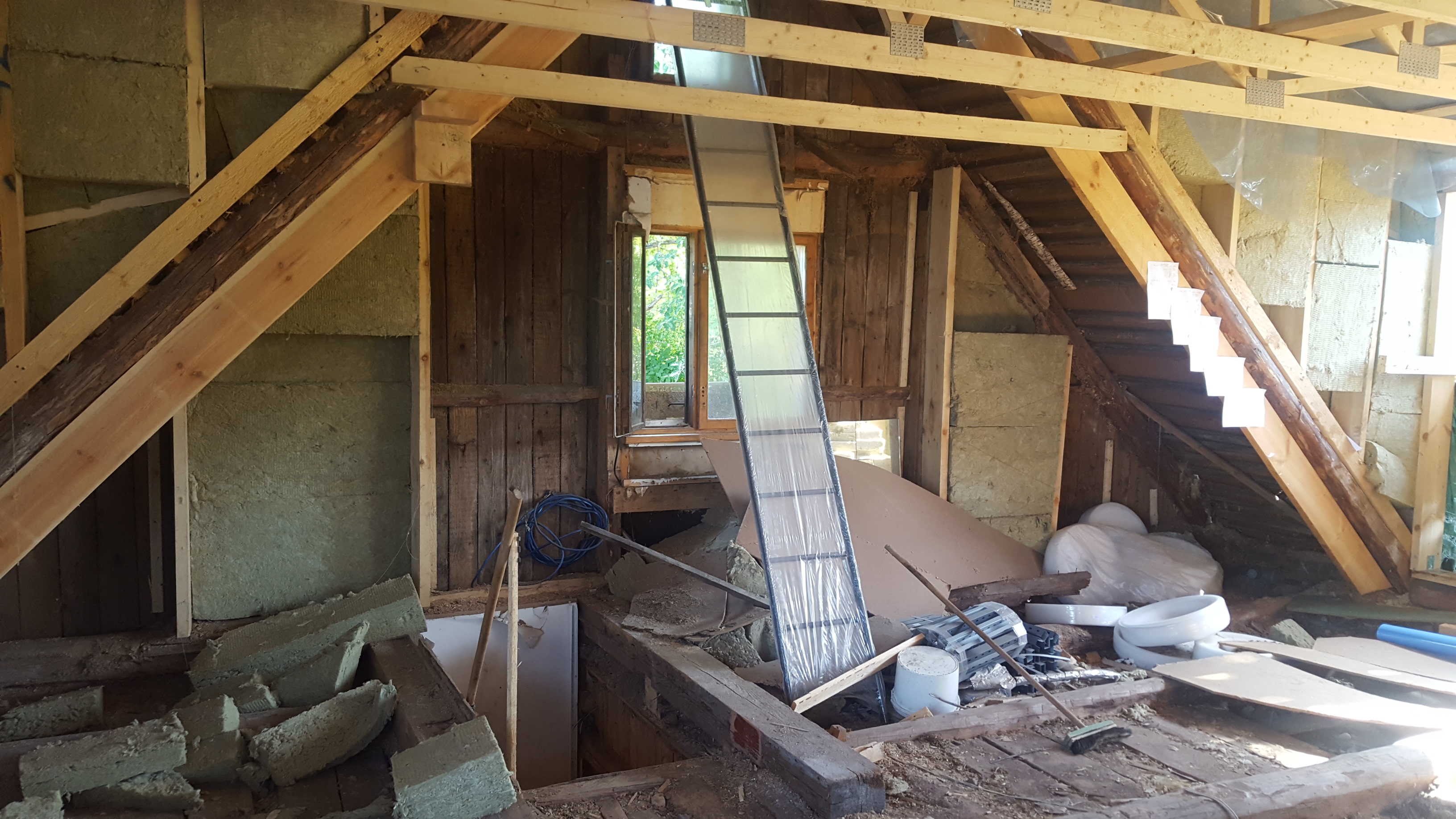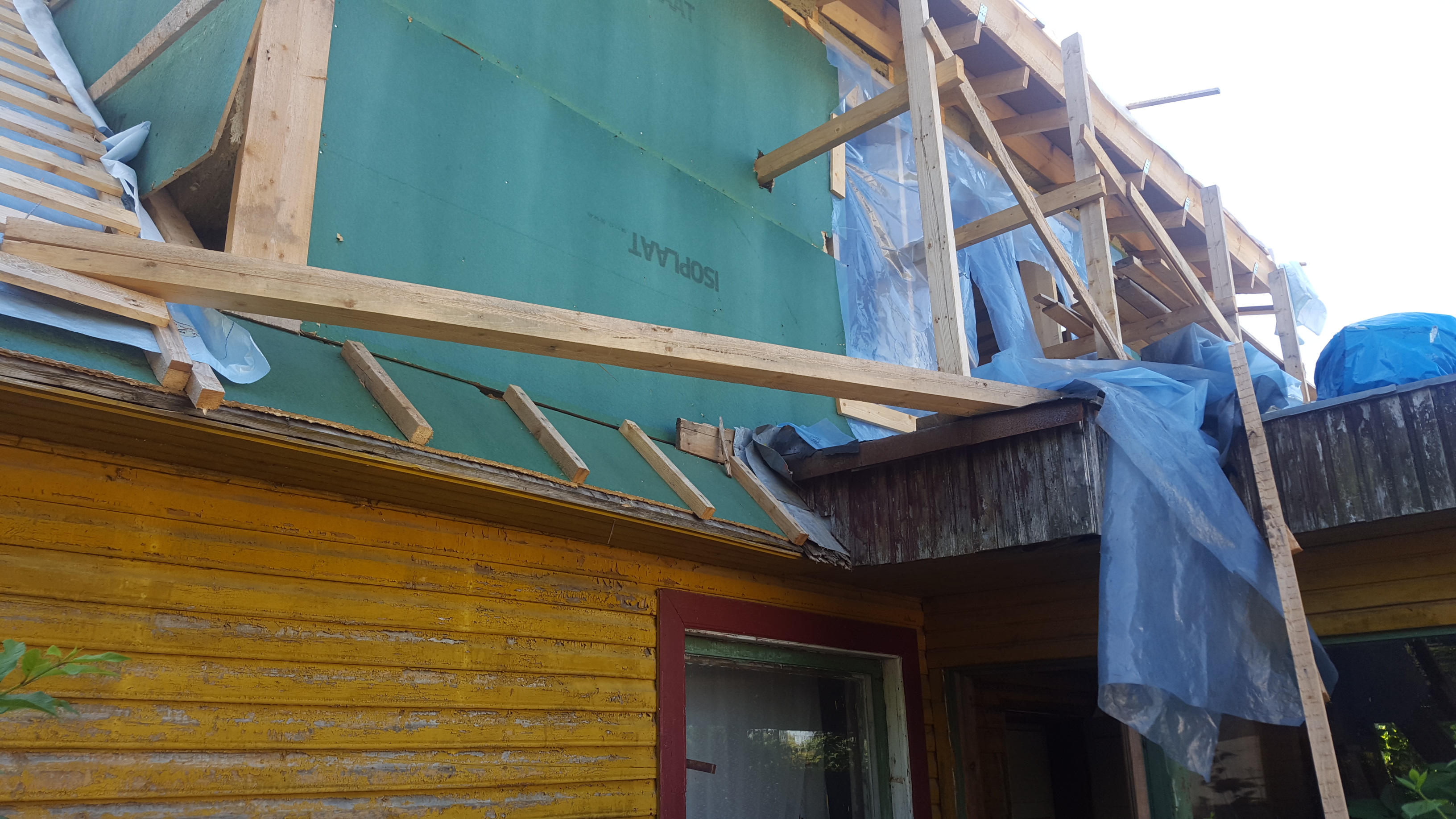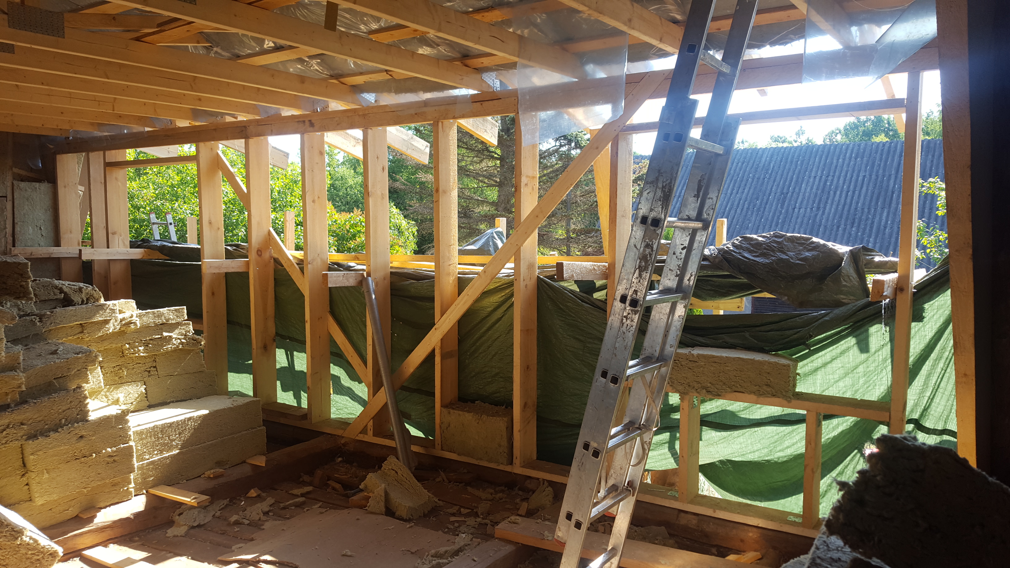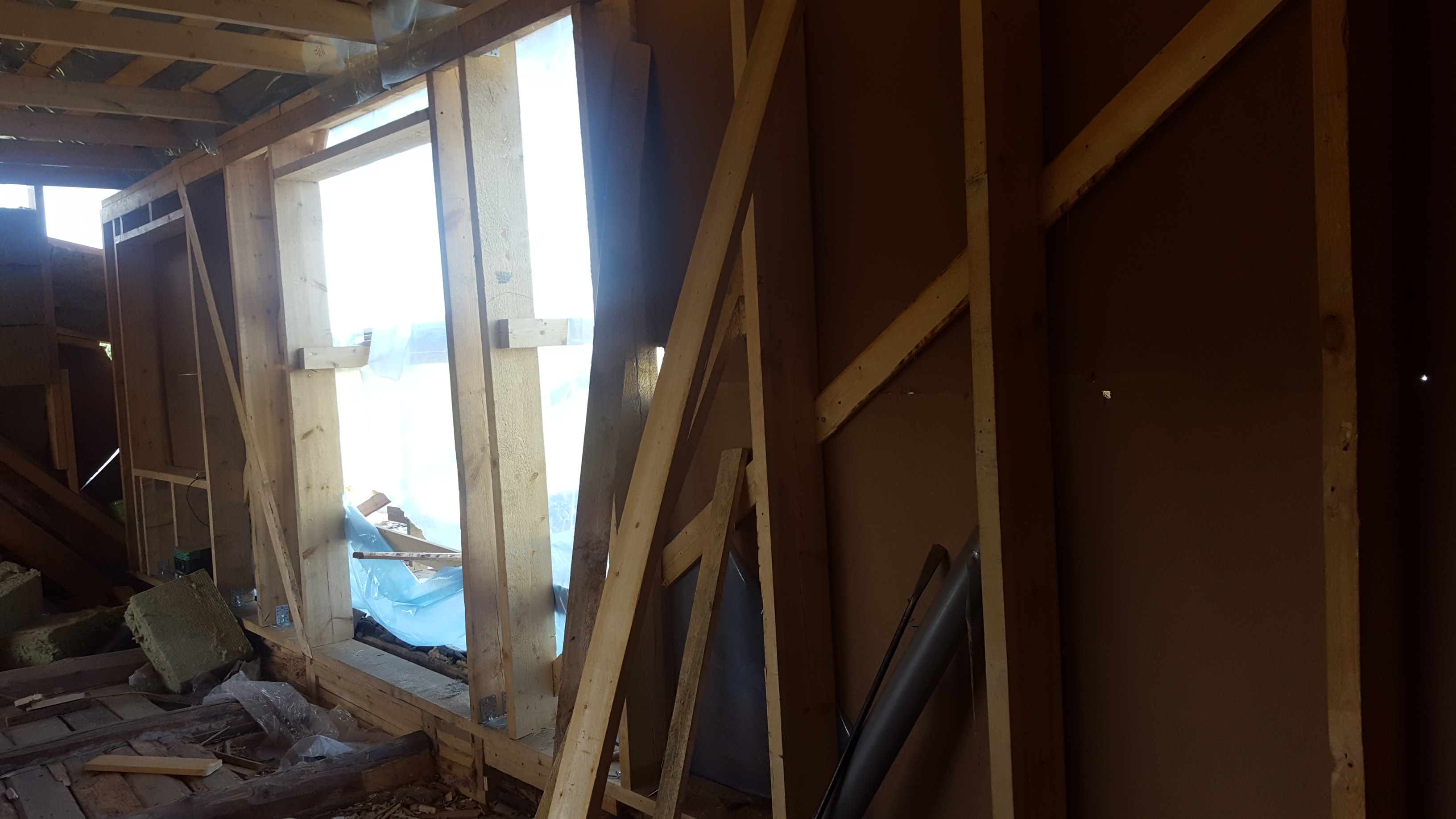3) Otsaseintes (mitte vintskapi otsasein vaid maja otsasein) olemasolevate akende eemaldamine ja uute akende ning rõduuste jaoks avade ehitamine. 20 cm soojustuse jaoks karkassi ehitamine sisse poole ning soojustuse paigaldamine (vt otsaseina ühel fotol on näha kuidas osaliselt on soojustuse konstruktsioon ja soojustus paigaldatud). Aurutõkke kile ning roovituse paigaldamine sisevoodrilaua jaoks. (sisevoodrilauda pole vaja paigaldada, samuti pole vaja olemasolevast konstruktsioonist välja poole soojustuse ja laudise paigaldamist.