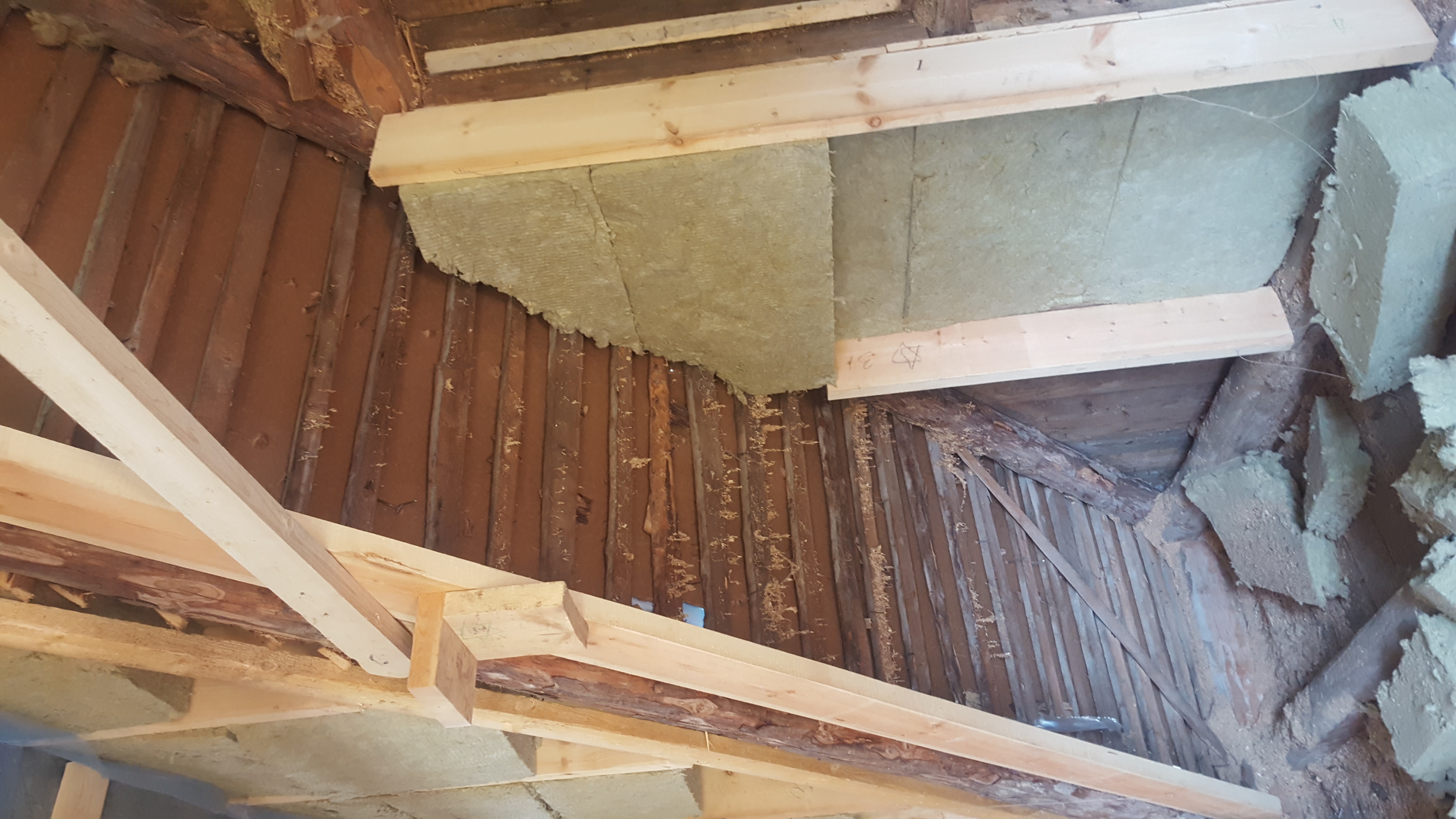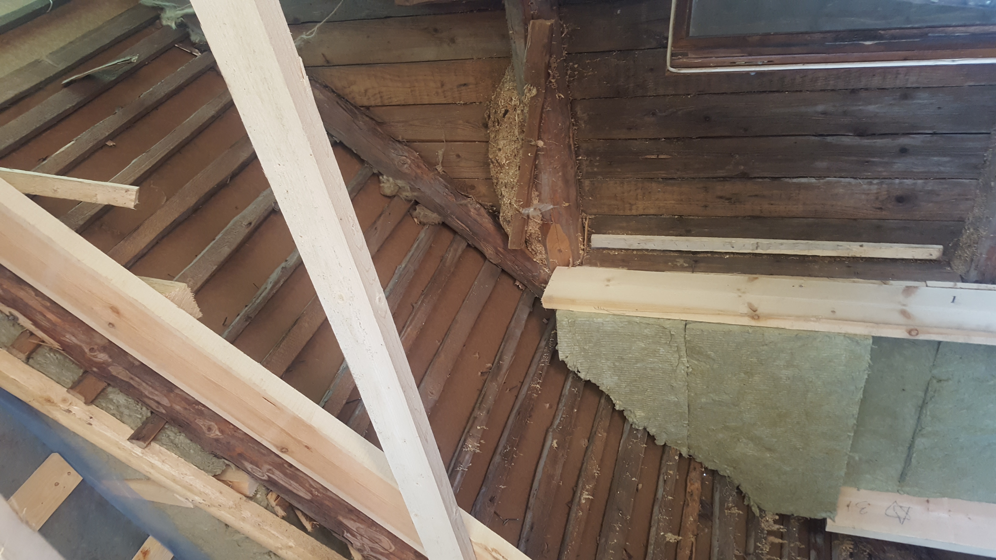 Käsil on eramaja teise korruse rekonstrueerimine. Tegu on viilkatusega majaga, kuid viilkatusest suurem osa on asendatud puitkarkassil kahe poolse vintskapiga (vt joonised). Karkass on 5x20 prussidest. Viilkatus on vanade sarikate peal ning otsaseinad on samuti vana palkidest karkass, mis on väljast poolt kaetud laudadega (vt fotod otsasein 1 ja 2). Palgid on korralikud. Soojustamisel on vaja teha järgmised tööd: