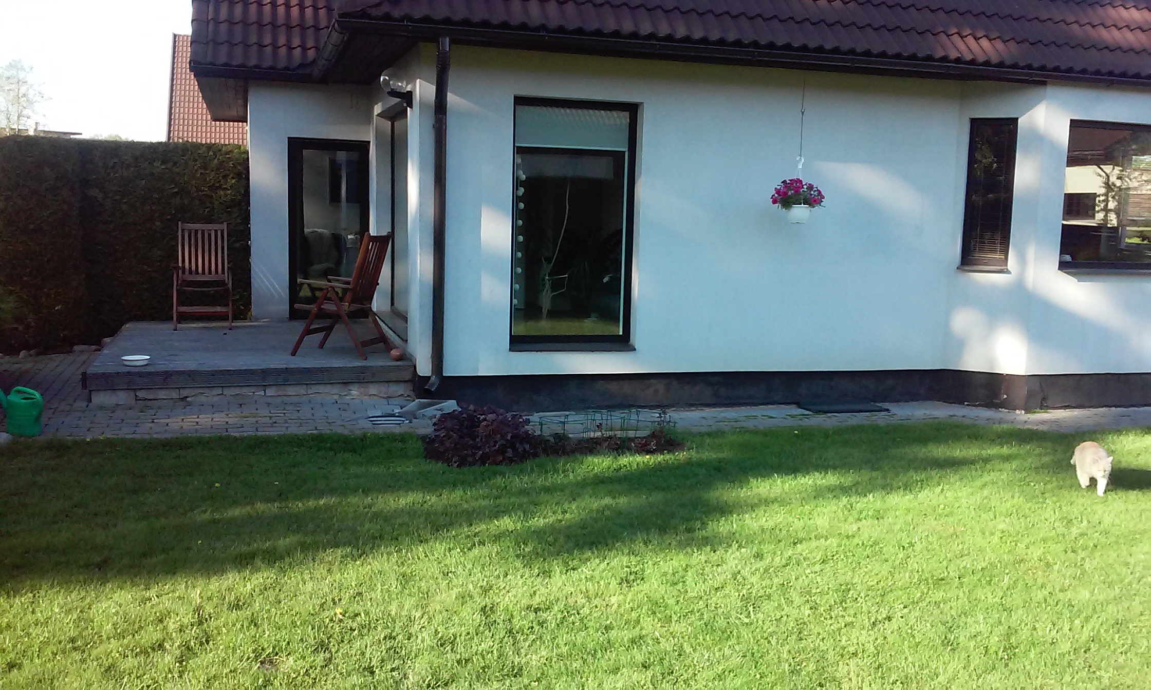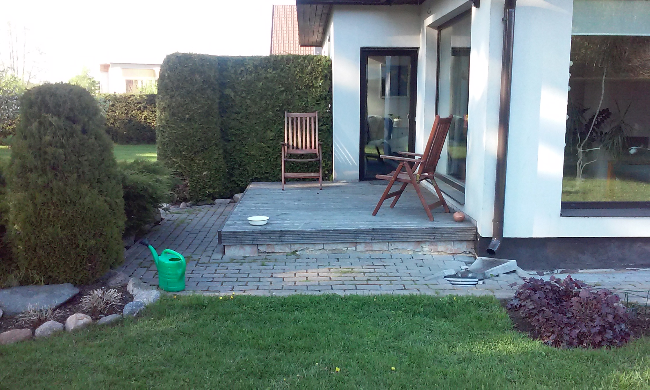 Olemasoleva terrassi mõõdud on 3,68 x 2,58 m. Soov oleks katta vana terrass uue materjaliga ja uus tuleks vanast 3,60m edasi majast eemale ja läheks piki maja küljele edasi 5,80 m. Uue terrassi alt tuleks ka pinnas ära koorida. Materjaliks oleks immutatud pruun puit.