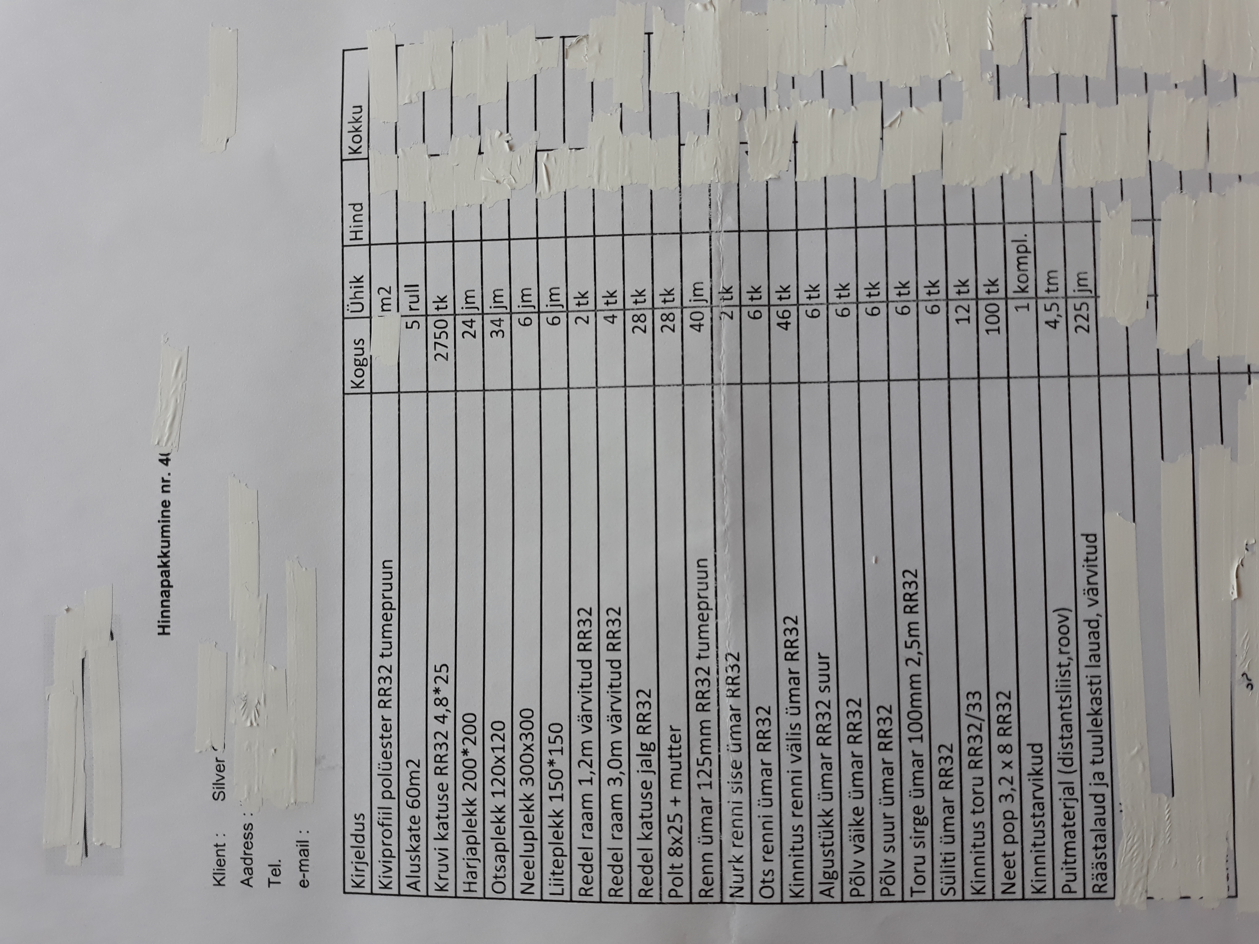 Tere, teeme pakkumise katuse renoveerimisele. Vana eterniidi eemaldus (mida ei utiliseeri, nii nagu kirjas oli). Olemasoleva sindli peale ehitame 50*100 sarika süsteemi, et kolmekihiline hingav kile oleks sindlist eemal. Ühtlasi kohe rihime Sarika süsteemi ära ka poltide ja kabadega ankrusse jättes. Peale seda kile, distants roov 32*100 või 50*75. Kiviprofiil pleki võtame Bestroofist. Ümara renni võtame AS Toode. Liistud teeme ise, kuna on valmimas plekitöökoda. Pleki paksus 0,5mm. Teostatud töödele Eesti seaduste järgi saame anda garantiid 2 aastat. Töödega saame alustada augusti lõpus. NB! Saan tähelepanu juhtida sellele, et kui te ise ostate pleki materjali, siis annab tootja otse materjalile 5-10 aastat garantiid! Ennem tööde alustamist soovime lepingu alusel 50% ettemaksu materjalide soetamiseks. Parimate soovidega, Alar