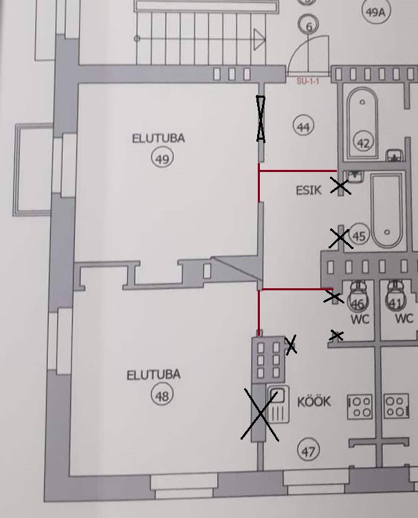 - kokku ca 7m2 vana (kivi)seina lammutamist (tegemist ei ole ühe terve seinaosaga, vaid väikeste juppidega, vt jooniselt), ca 3,5m2 kipsist seina eemaldamist ning ca 1x0,6x0,9m tuhaplokist ehitatud "köögisaare" lammutamist;