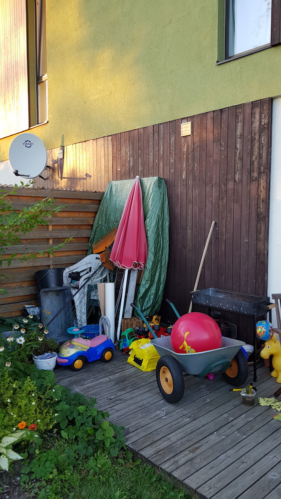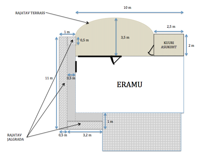 Olemasoleva terrassi asemele uue ehitamine. Terrassi pikkus ca 10m ja laius vastavalt 2-3,5 m (vaata joonist). Vajalik valada külmumissügavusest allapoole ulatuv postvundament. Terrassi aluse ettevalmistamiseks paigaldada maapinnale ka geotekstiil, et muru ei hakkaks läbi kasvama. Aluskarkass 50*150 sügavimmutatud pruss, terrassilaud 28*120 siberi lehis (rihveldatud ja õlitatud). Kasutada terrassikruve või klambreid. Terrassi kitsamale otsale ehitatakse järgnevalt kirjeldatav kuur/panipaik. Tellija demonteerib vana terrassi.