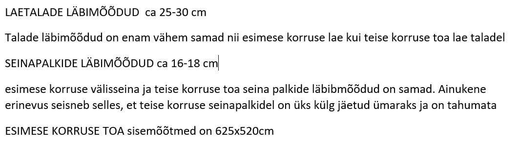 Suuresti on kandekonstruktsioonid puhastatud katvast krohvist, soojustusest jms. Tellija likvideerib ehitajaga kooskõlastades ka hetkel alles olev palke katva materjali, mis jääb tööde teostamisele ette. Ehitaja ei pea sellega ise tegelema, samuti ei ole vaja teha hilisemat viimistlust. Vajalik on vaid pehkinud palgid asendada uutega. Ehitusmaterjal on tellija poolt olemas. Põrand peaks olema piisavalt tugev, et toestust kanda.