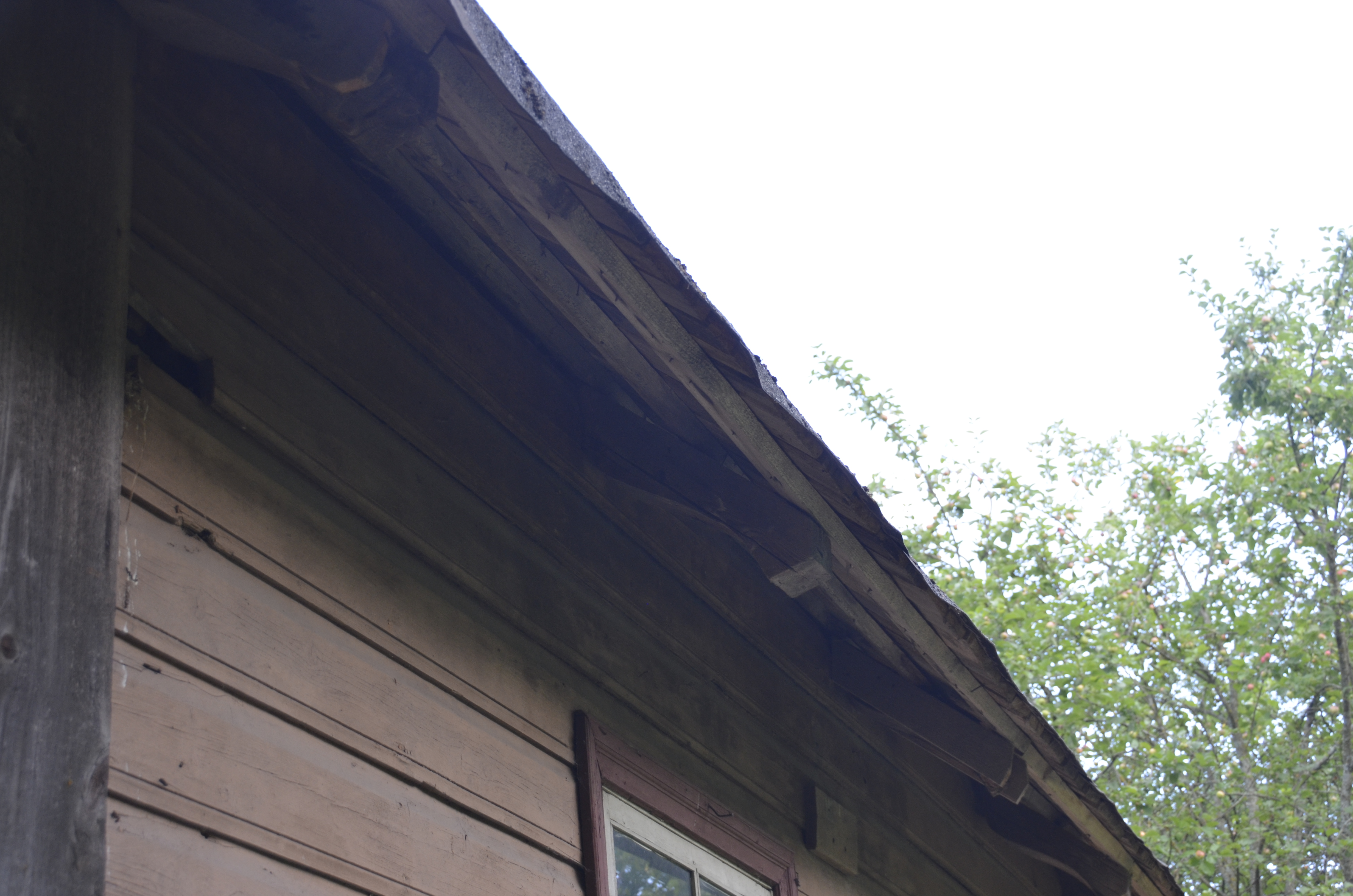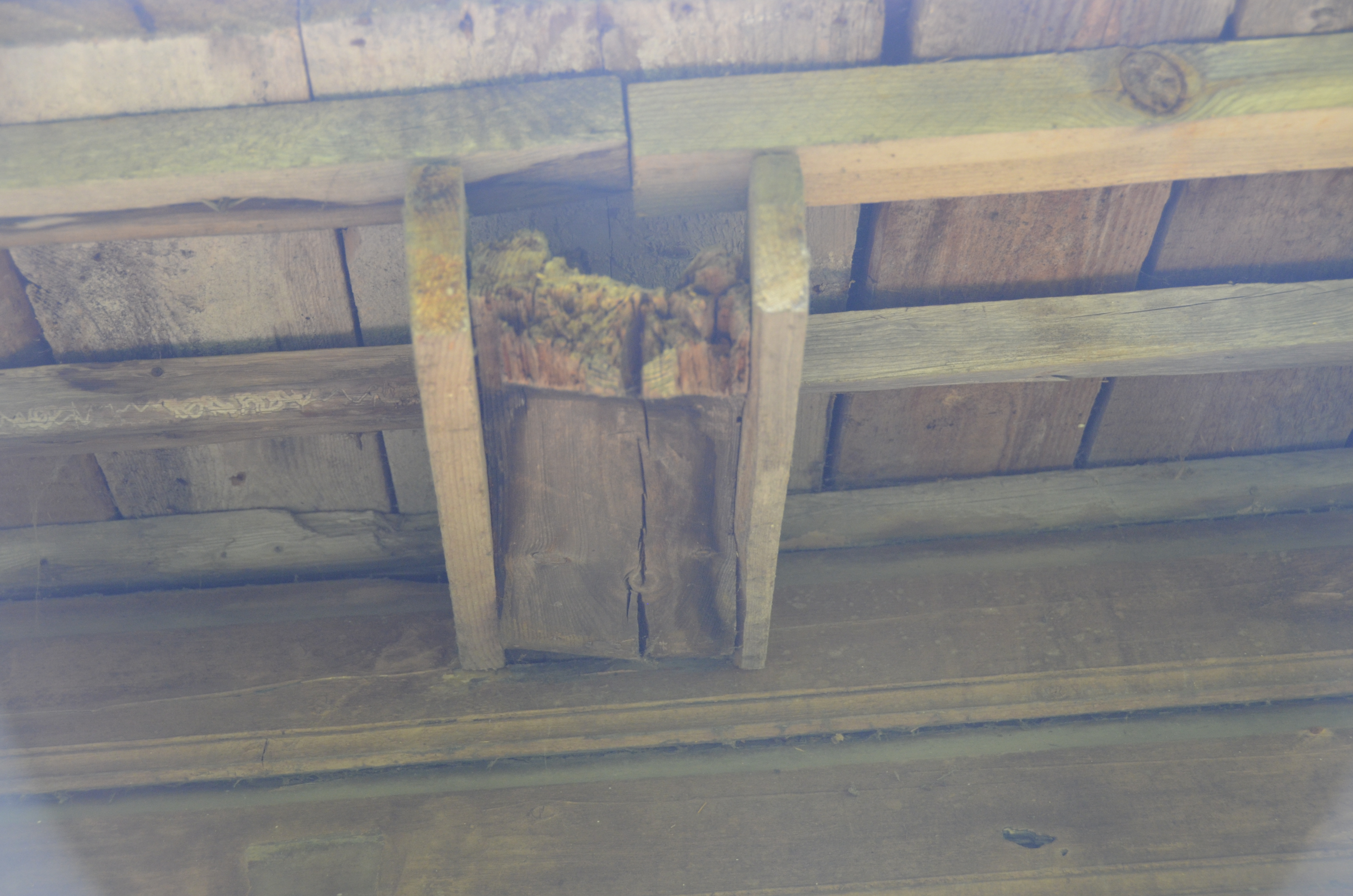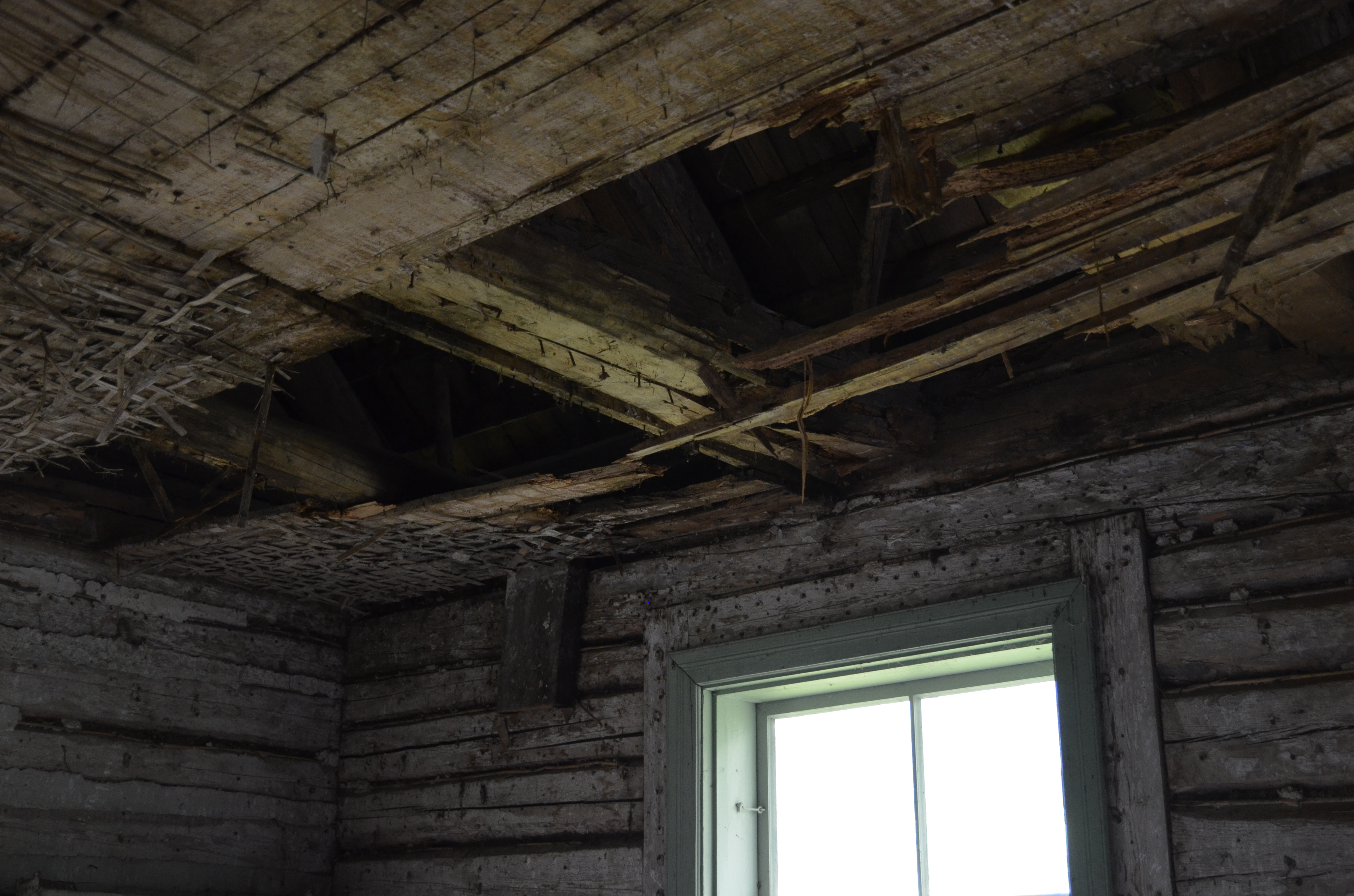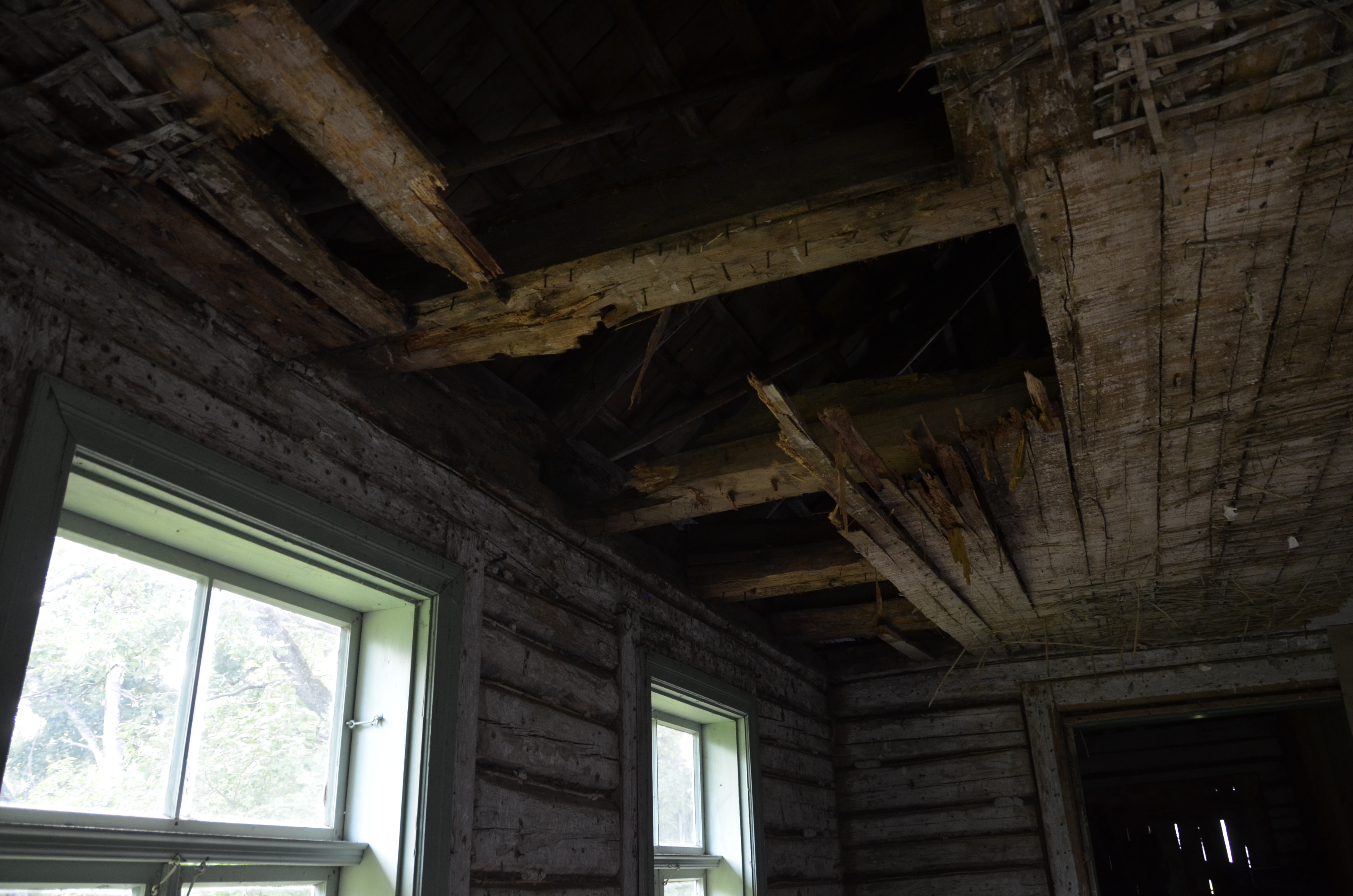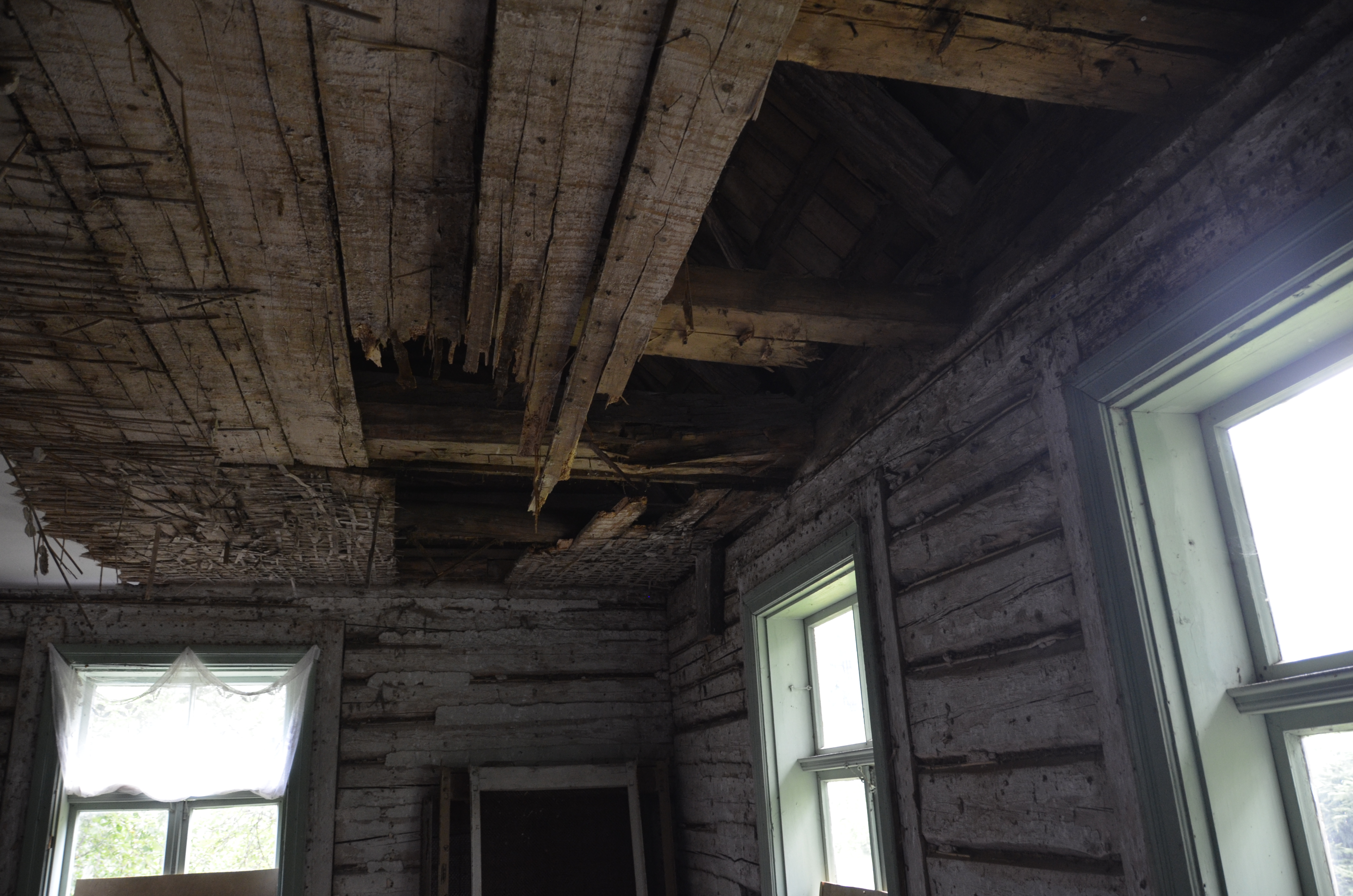Tegemist on katuse läbijooksust tingitud kahjustusega. Pehkinud laetalad toetuvad seinale, mille ülemine (ülemised) palk on vaja vahetada, samuti toetuvad samale seinale kaks sarikat, mille otsad vajavad vahetamist.