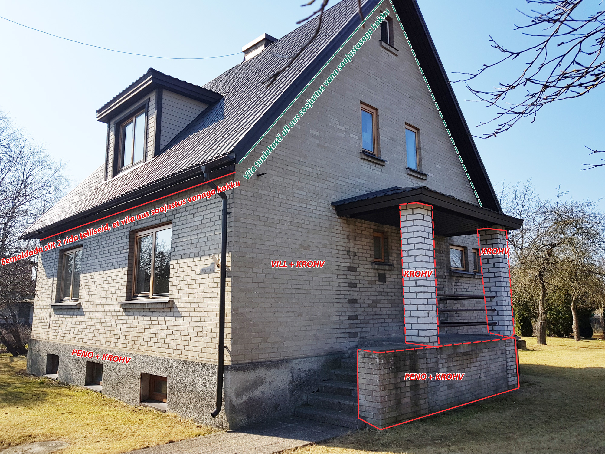 - maja kahel küljel fassaadi ülemises servas (tuulutuskastis) on vaja eemaldada kaks horisontaalset telliskivi rida (kogupikkus 20 jm), et viia uus soojustus vana soojustusega kokku (pöörata villa ca 90 kraadi)