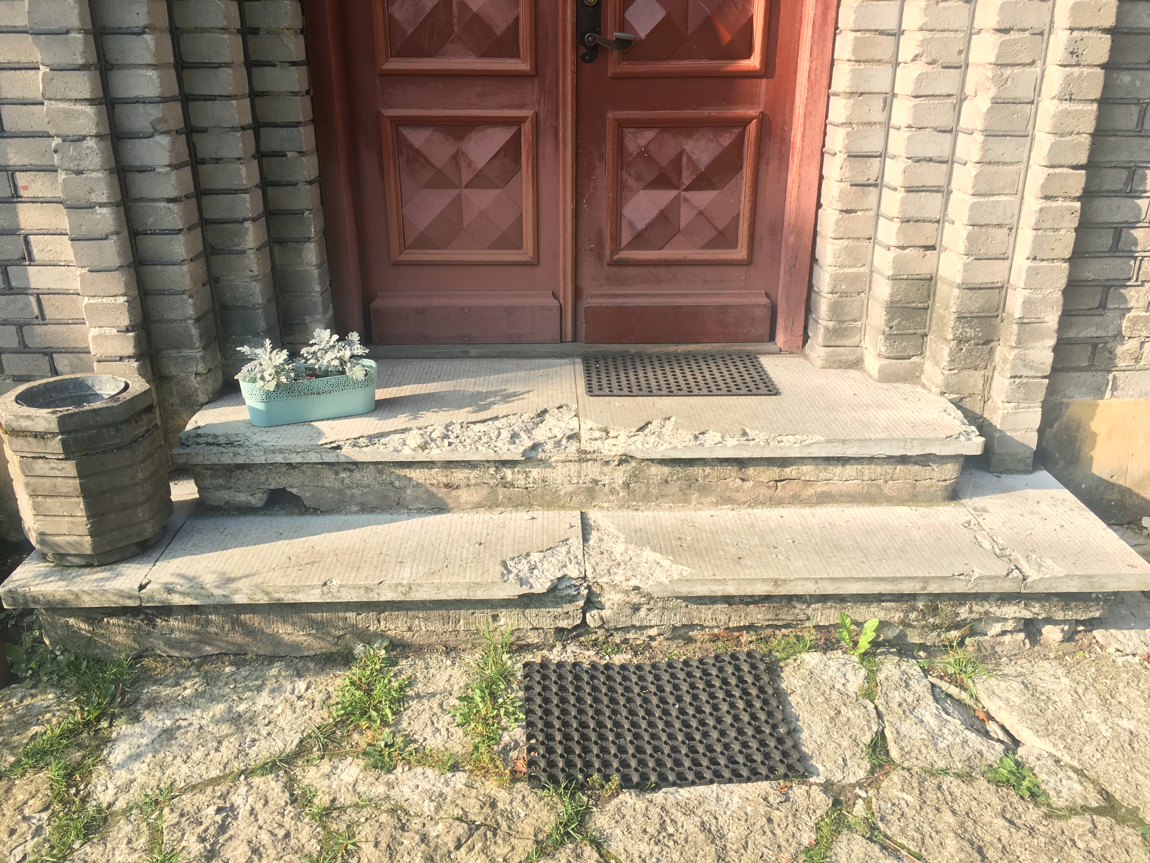 Välistrepp on ära lagunenud, vaja korda teha. Võibolla ka alus, lisaks plaatidele. Astmete laiused 2800 ja 2200.