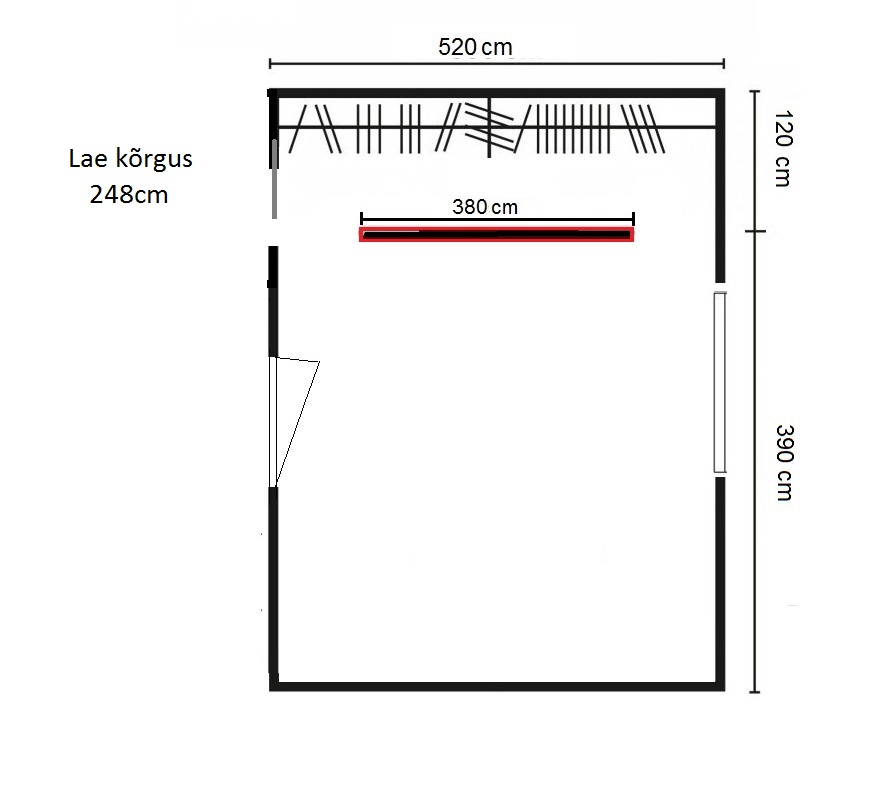 Magamistuppa ja kabinetti planeeritud kipsseina mõõdud on toodud joonisel. Põrand on kaetud parketiga ja lagi 2-kordse kipsiga.