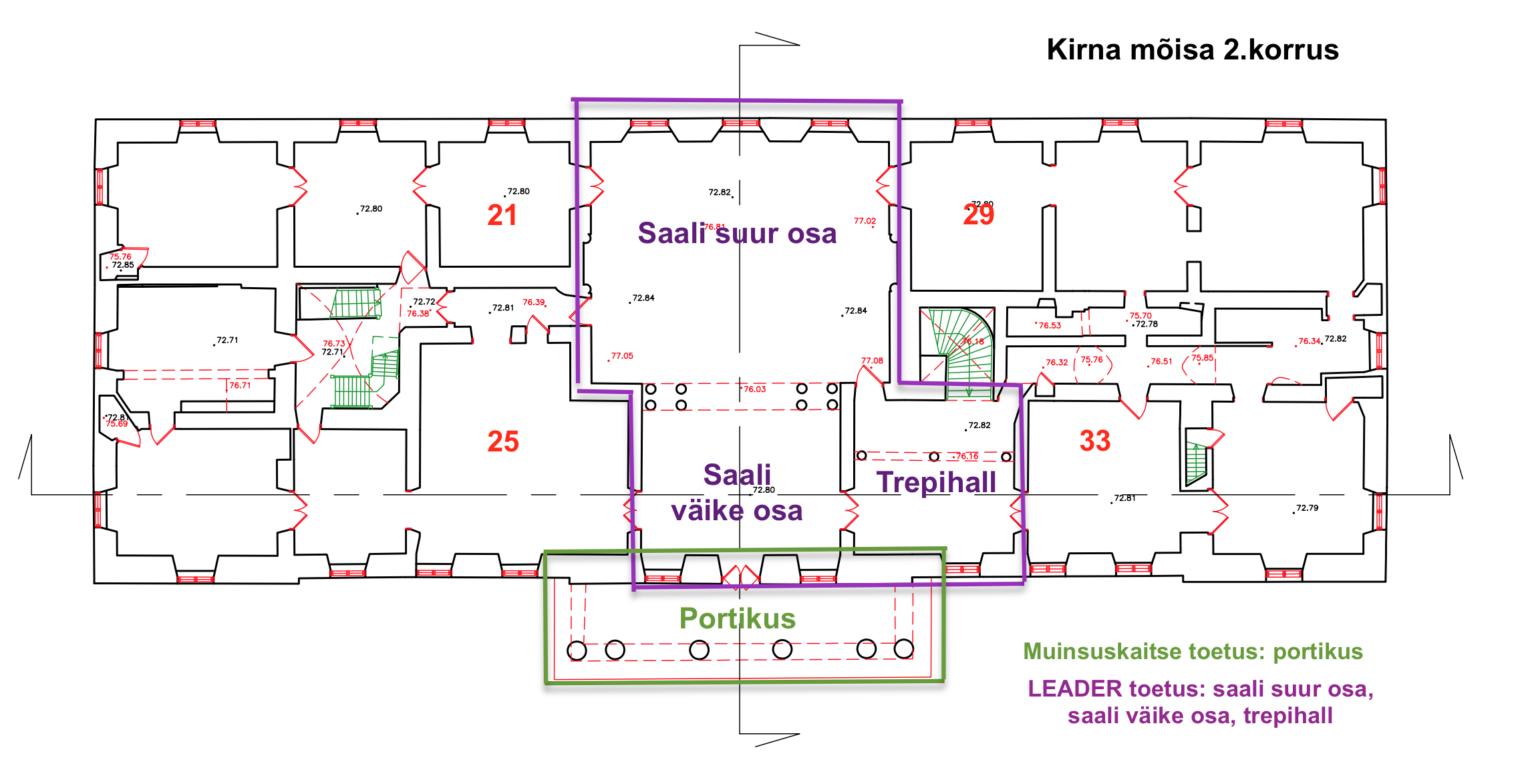 2. Saali suure osa lae ehitus vastavalt M.Koppeli projektile. Karniisi ja stukkdekoori püütakse säilitada, kuid vajadusel demonteeritakse, nummerdatakse, ladustatakse mõisa ruumidesse. Karniisi ja roseti profiili joonised on koostatud. Karniiside ja stukkdekoori restaureerimine ei ole arvestatud selle etapi tööde hulka. Hinnapakkumises palume näidata ainult stukkide demontaaž ja ladustamine.