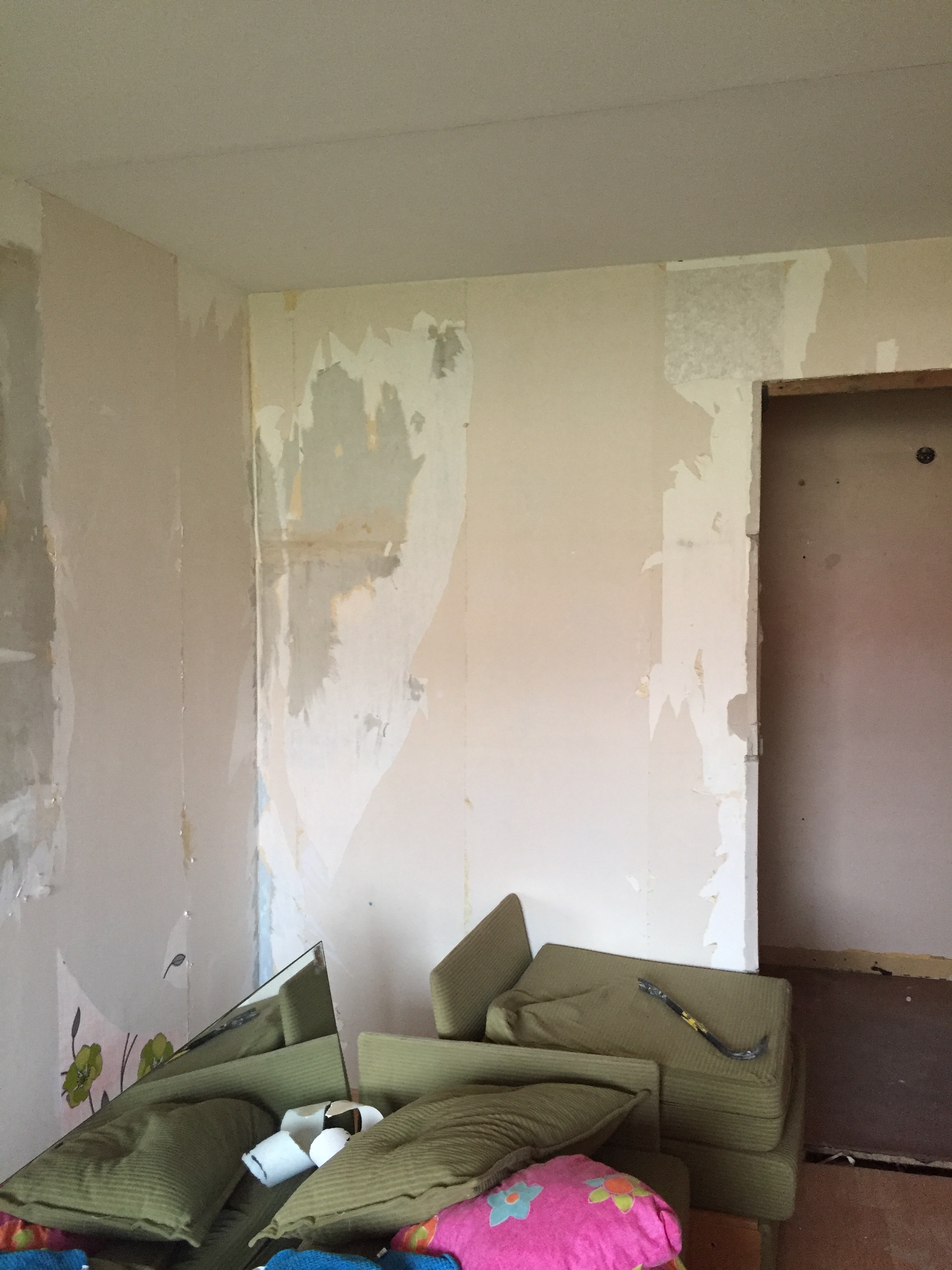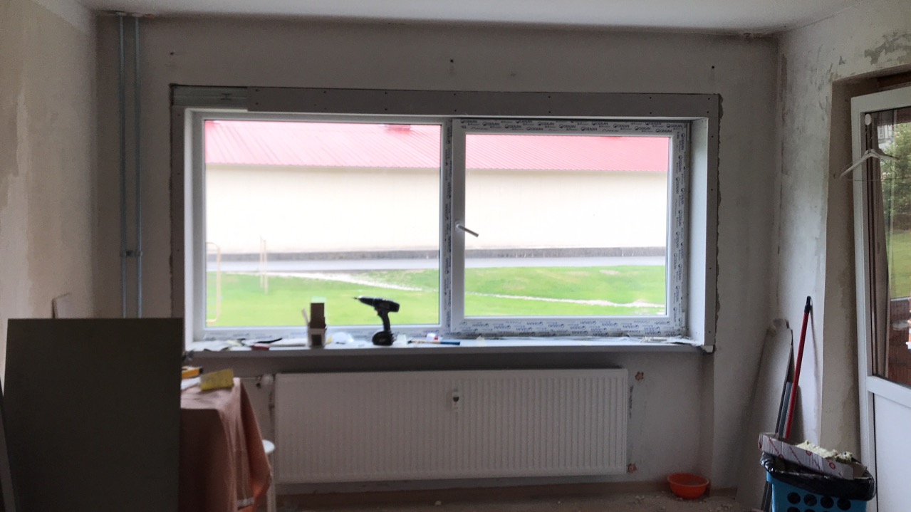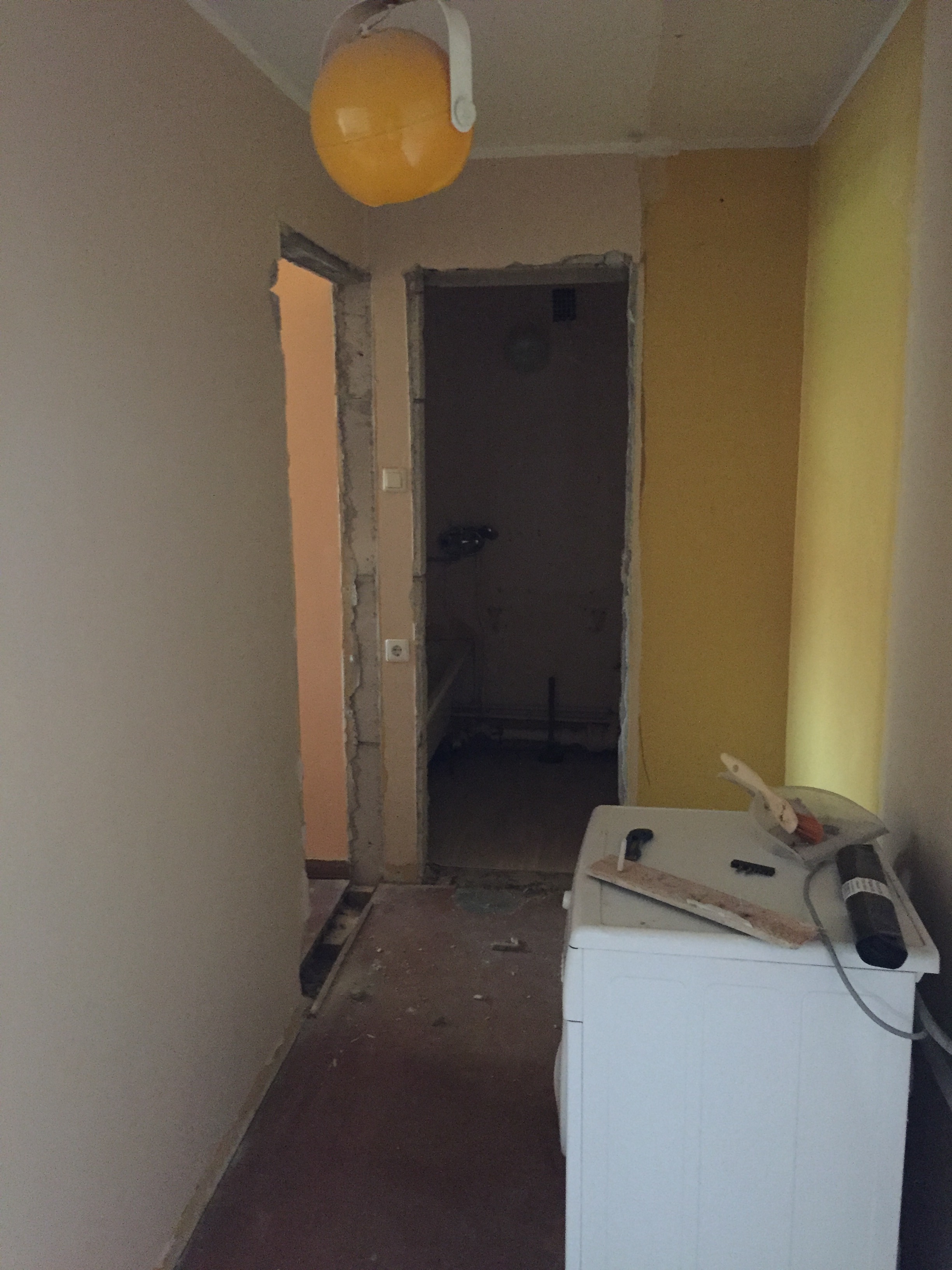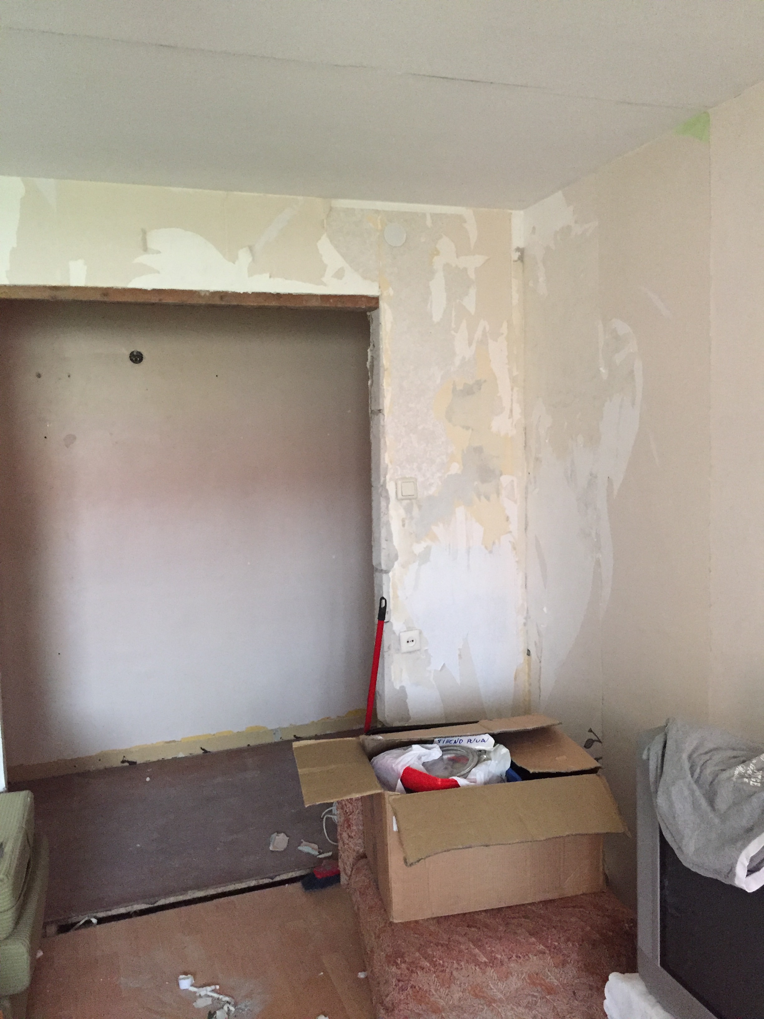 Seintelt vana tapeet eemaldatud, aknapale elutoas kipsitatud, köögis vaja ehitada. Vannitoas on valatud tasandussegu põrandale, lagi värvitud.