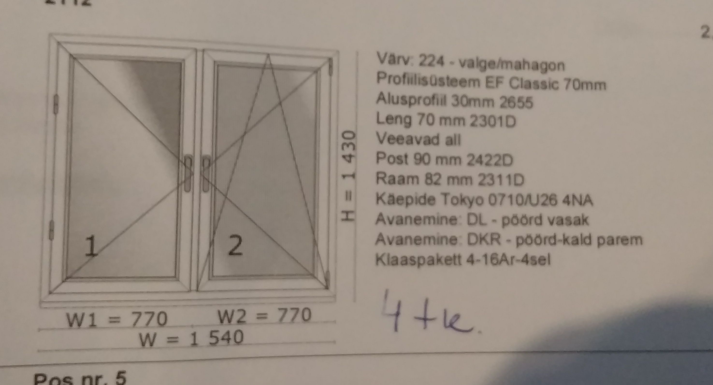 Aken koosneb kahest poolest mõlemad käivad lahti.Müügilepingu peal mõõdud laius W1-770,W2-770,üld laius-(W-1540) ja kõrgus H-1450.Ja 4 akent kõik ühesugused mõõdud.