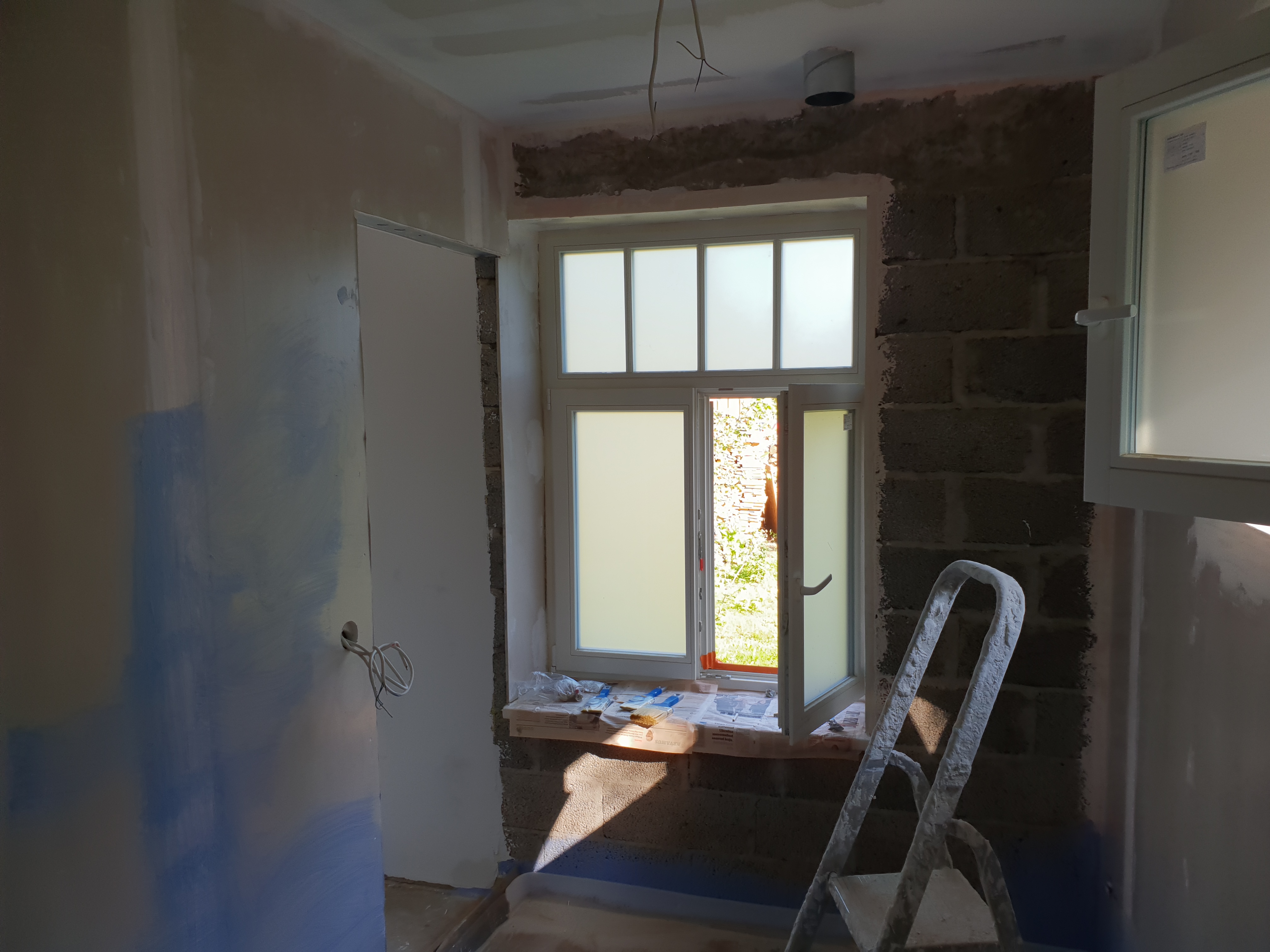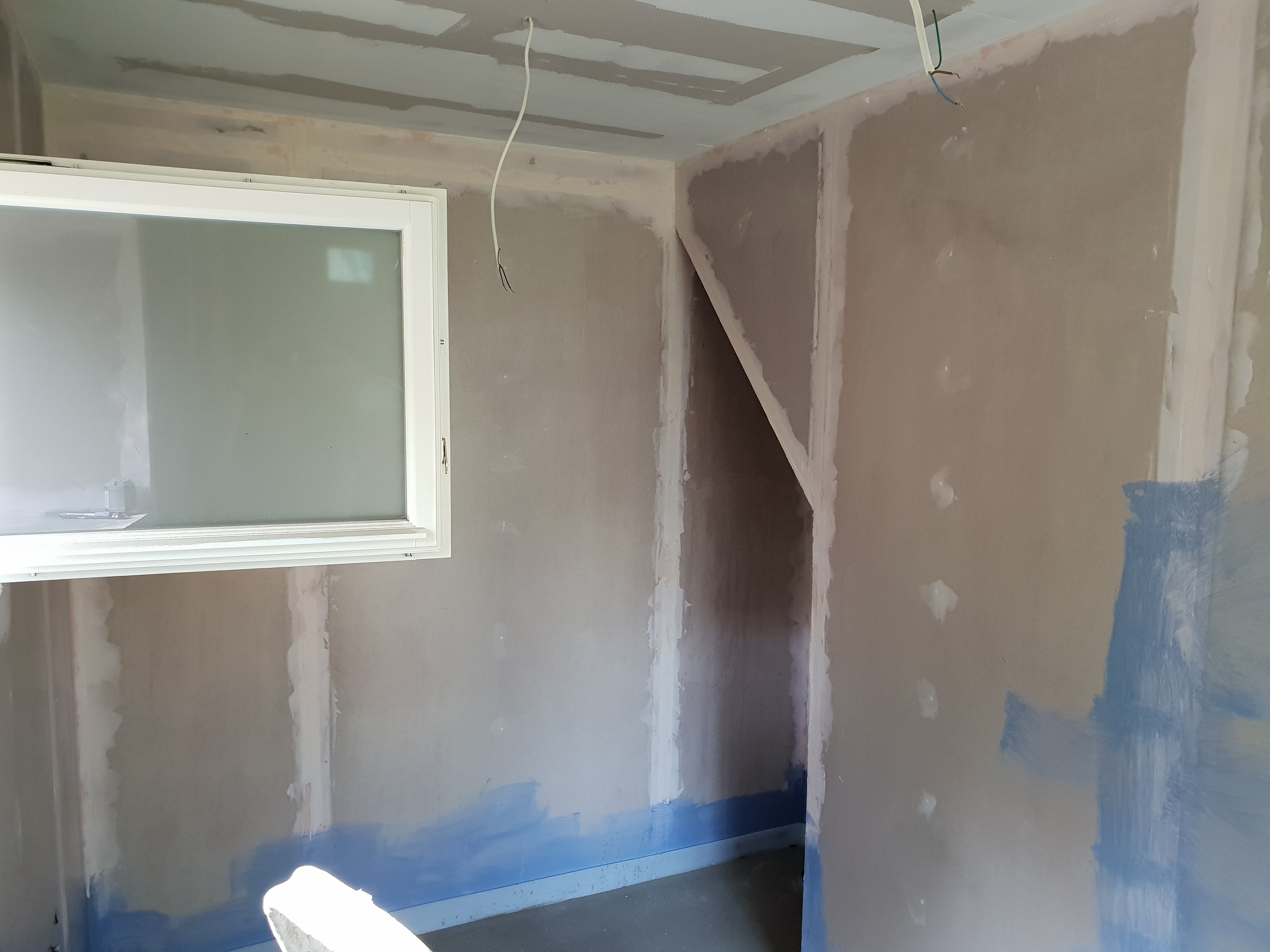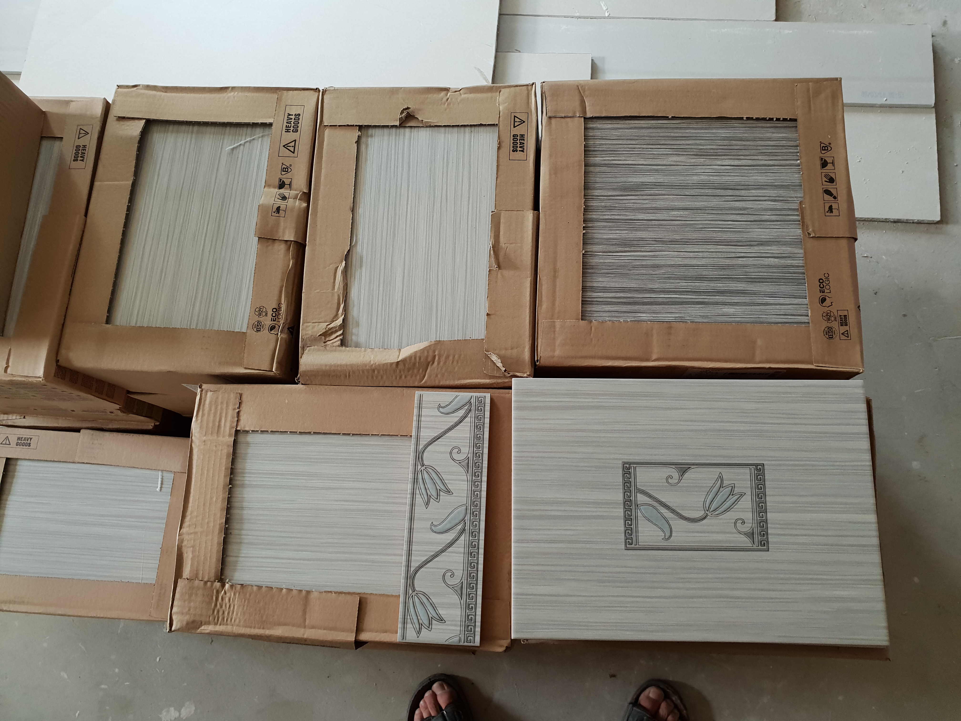 Seinaplaat 25x35 cm, põrandaplaat 33,3x33,3 cm. Seintel on praegu kipsplaat ja ühes seinas fiboplok. Seinad on niiskustõkkega immutatud, kipsplaatide vahed ja nurgad teibitud ning pahteldatud. Põrandas on üks vannitoa põranda äravoolutruup. Aknapõskesid plaatida ei ole vaja, küll aga on vajalik plaatida ühe akna aknalauapind. Ühte seina läheb horisontaalselt porte. Pildil 1 nähtavat kaldlage ei tule plaatida.