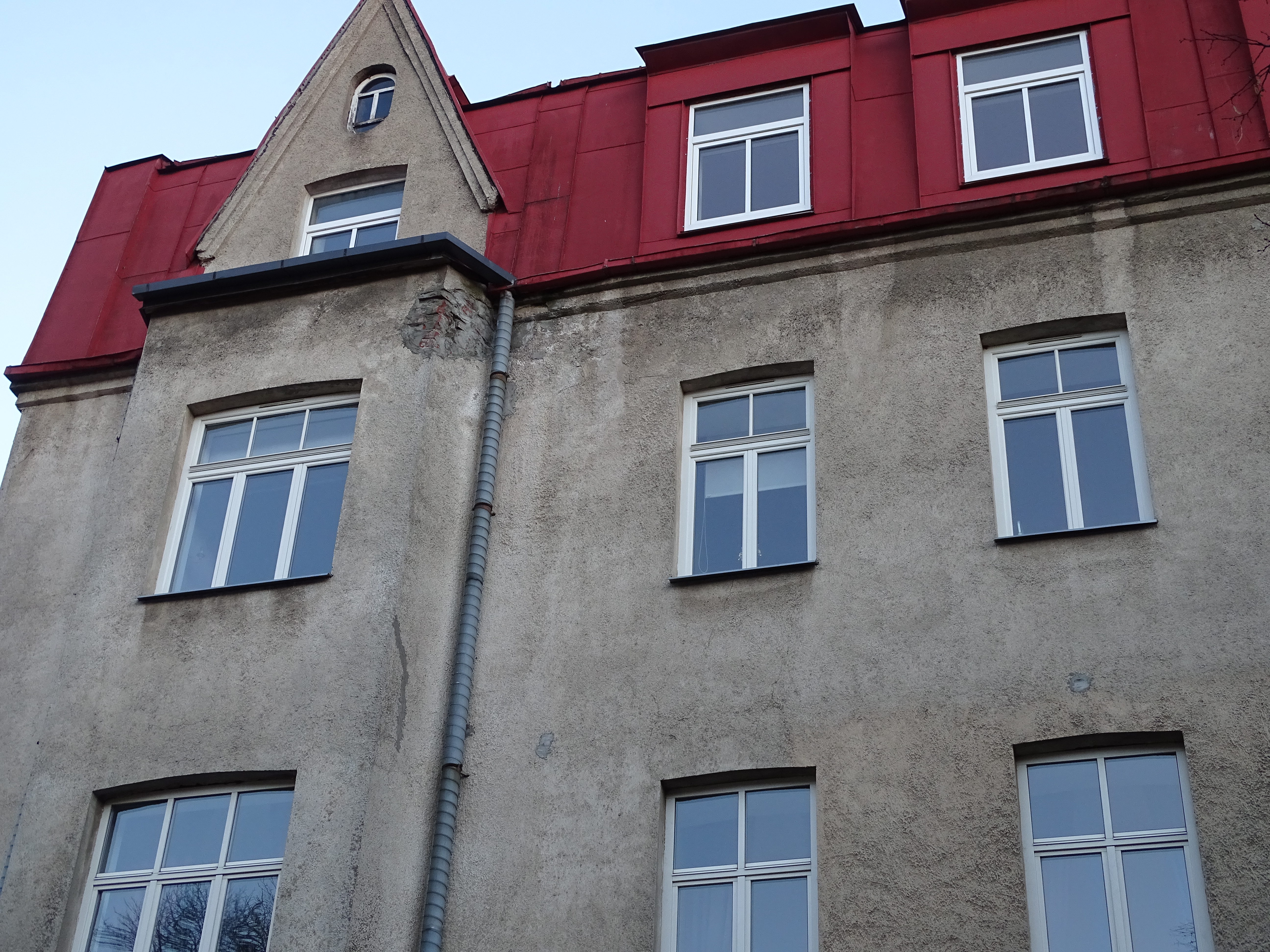 Plekkkatus laseb kahest kohast vette läbi. Läbijooksu kohad on tuvastatavad pööningult. Vähemalt ühe koha parandamiseks eeldan tõstuki kasutamist. Sirgestada on vaja ka tänavapoolne vihmaveerenn, mis on katusest kaugemale vajunud.