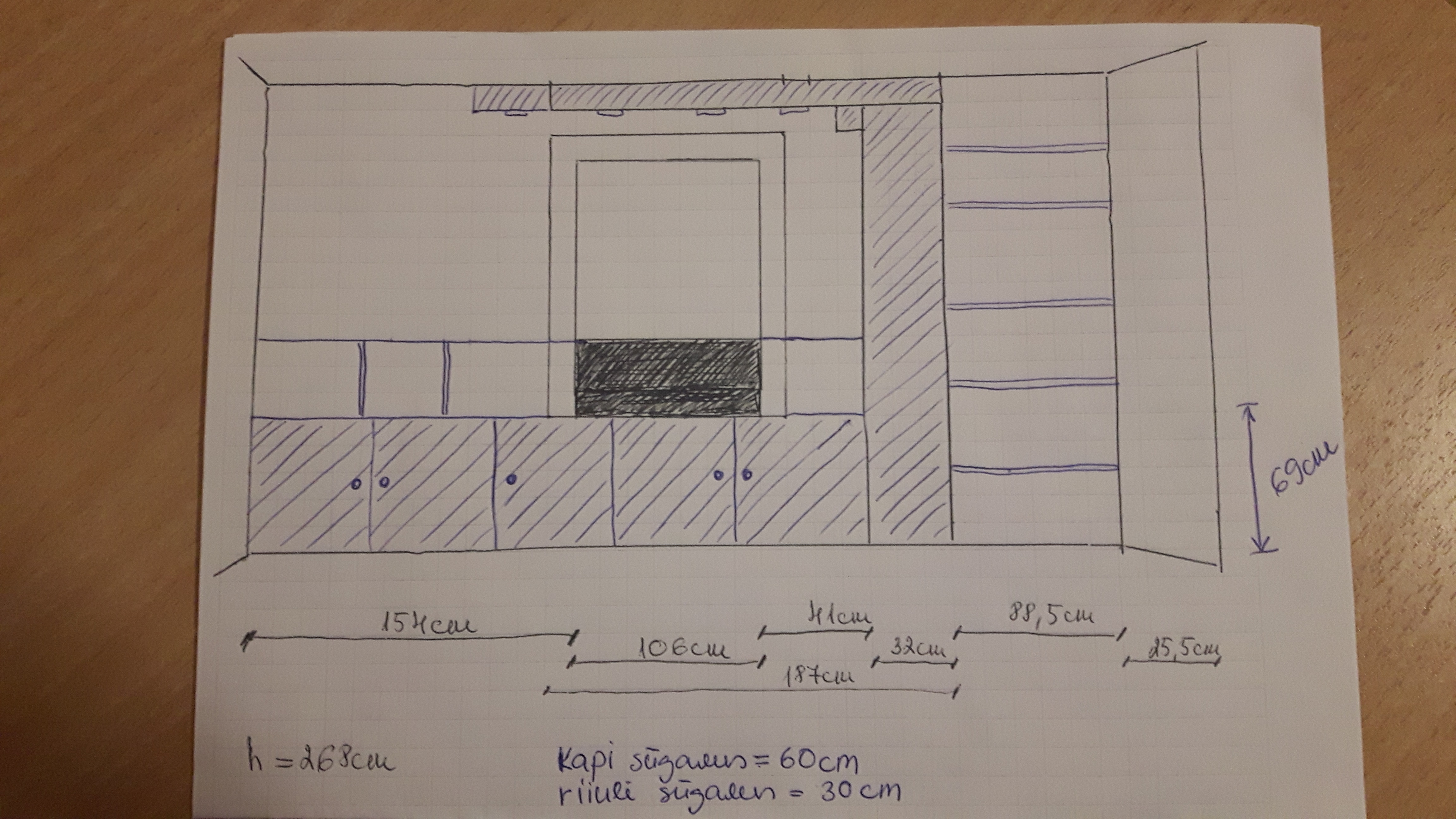 Üks pilt annab rohkem edasi kui tuhat sõna. Seega pikemalt selgitamata lisan ideejoonise, pildid seinast ja umbkaudse nägemuse, kuidas see kõik võiks umbes välja näha (sealt saab vaadata snitti alumise kapi ja alumise kapi peal oleva riiuli osas).
