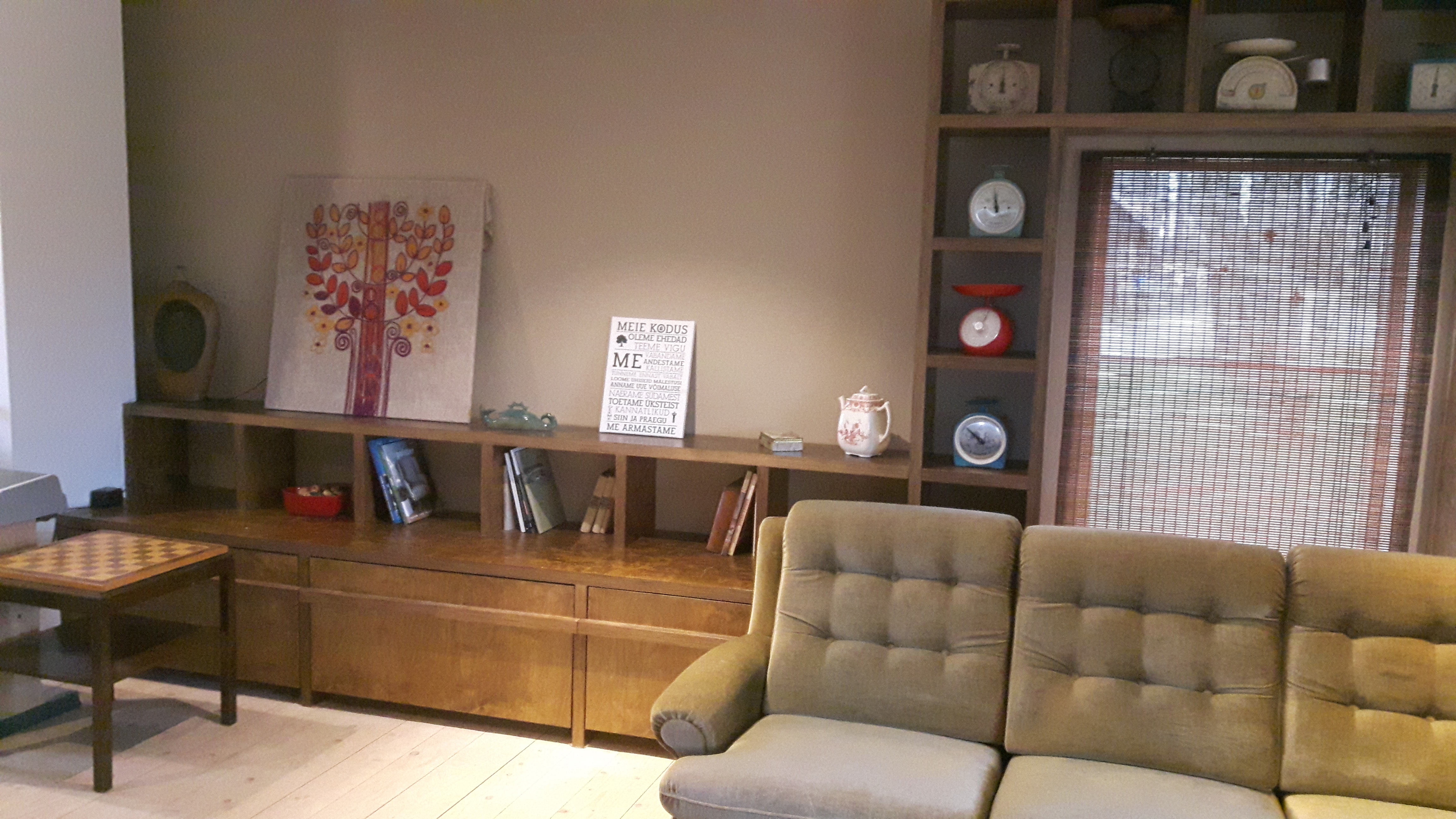 Kapi peale tuleks riiul, mille tasapinna kõrgus ühtib köögi tasapinna kõrgusega (90 cm), mis jaguneb viieks sektoriks. Riiuli sügavus 30 cm. Lisaks peaks riiul ulatuma ka palkseinas oleva avause (akna) postide vahele (vastu köögi tööpinnaplaati, mis on teisel pool palkseina). Joonisel nähtav tume viirutatud ala on pildil nähtav villaga kaetud ala ja see tuleks katta plaadiga. Mujal olev riiulite vaheline ala ning riiuli ja kapi vaheline ala jääb palkseinana nähtavale.