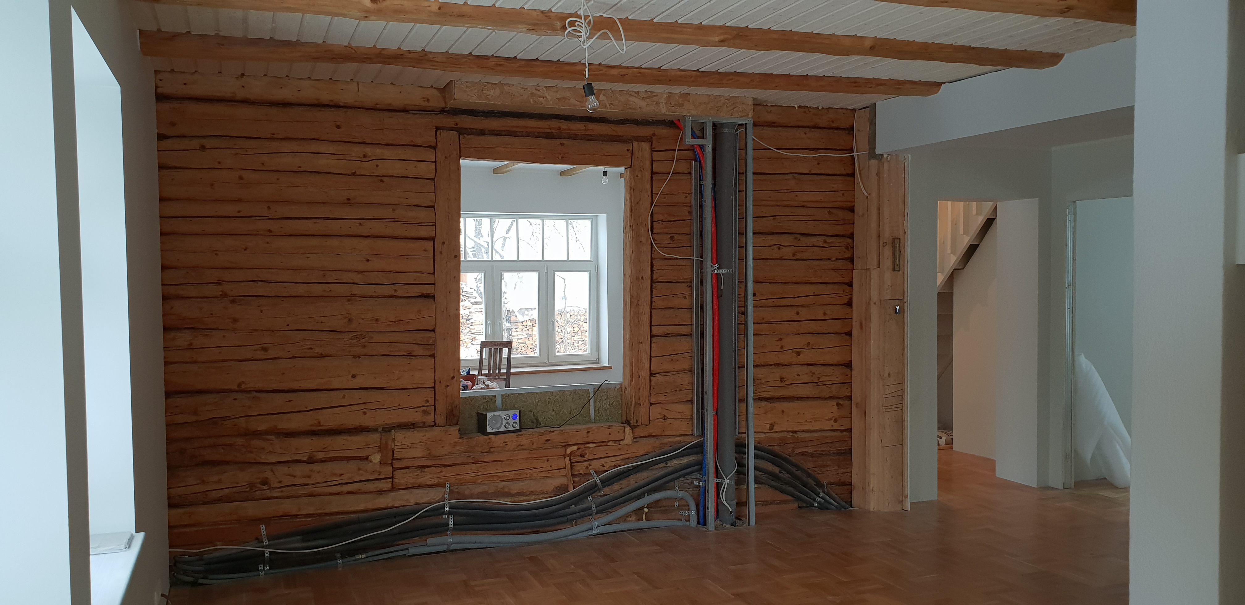 Palkseinas oleva avause (akna) kohal on püssiplaadist teise korruse torude varjamiseks suletud karp. See karp tuleks katta kapi materjaliga ning puurida ülemise suletud ala sisse kaks lambipesa avaust. Juhtmed on sinna veetud ja lülitiga ühendatud.