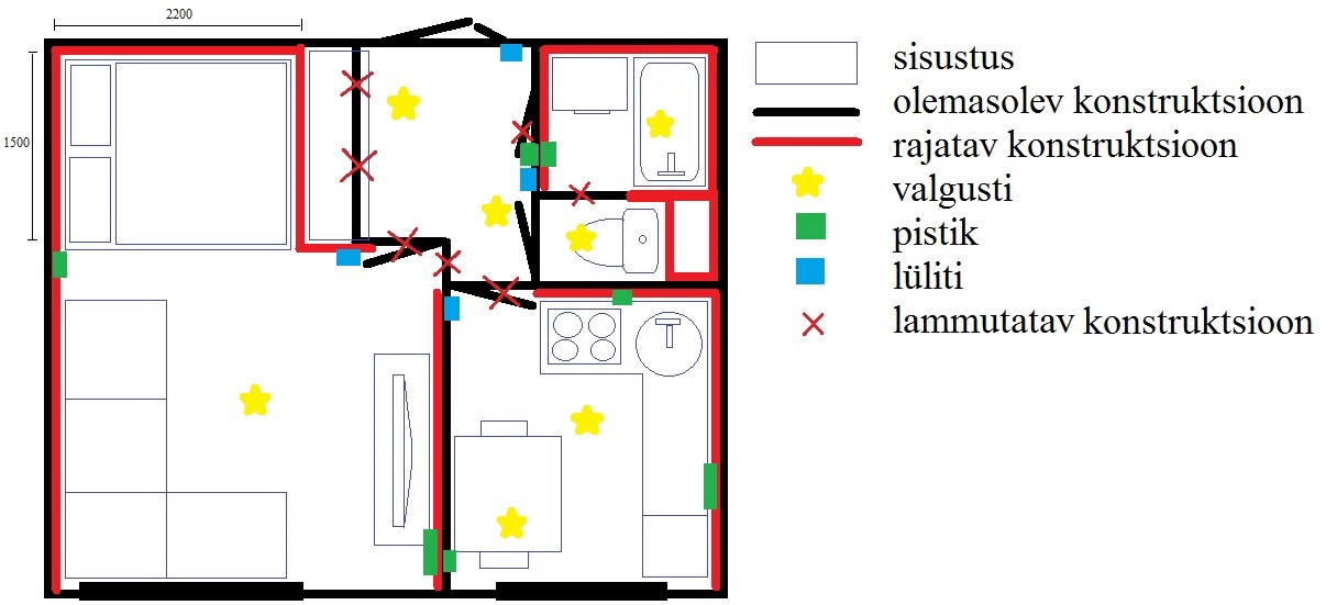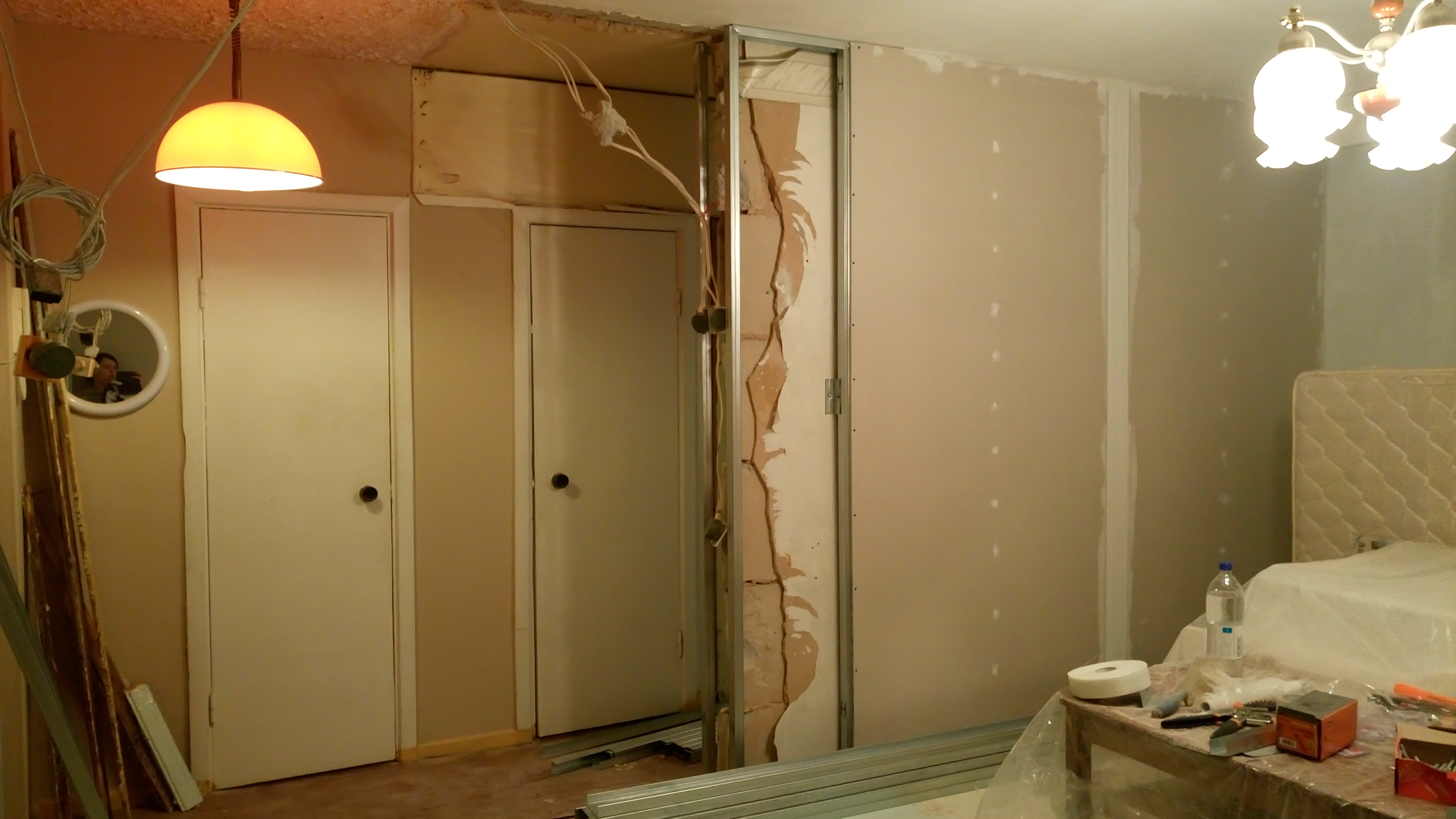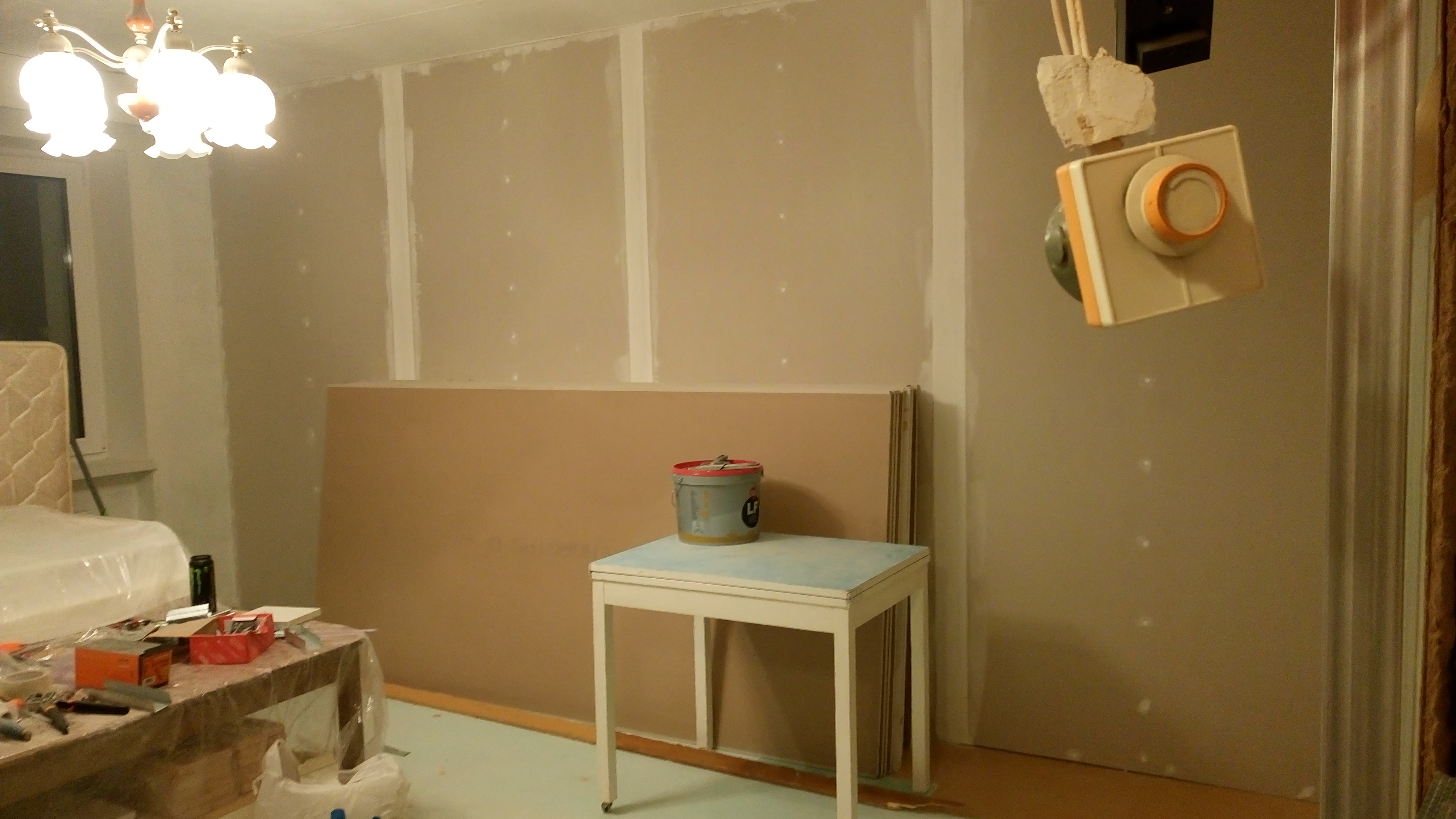 27m2 korteri elektrisüsteemi täielik uuendamine. Korteri kõigisse seintesse on paigaldatud metallkarkassil kips. Kaabelduse võib vedada igatepidi otse olemasoleva lae all, sest lähiajal paigaldatakse korterisse ripplagi, mis kaabli ära varjab.