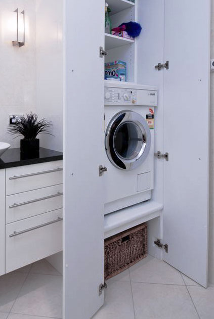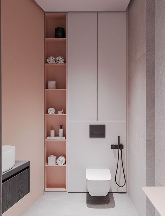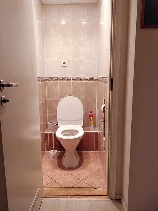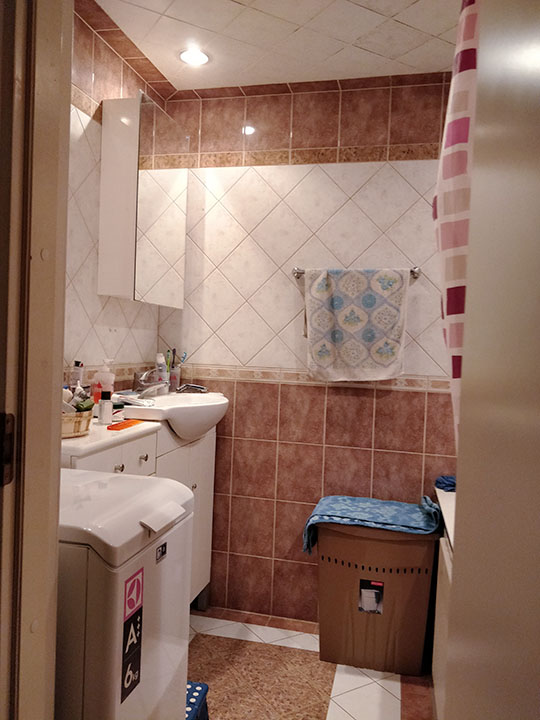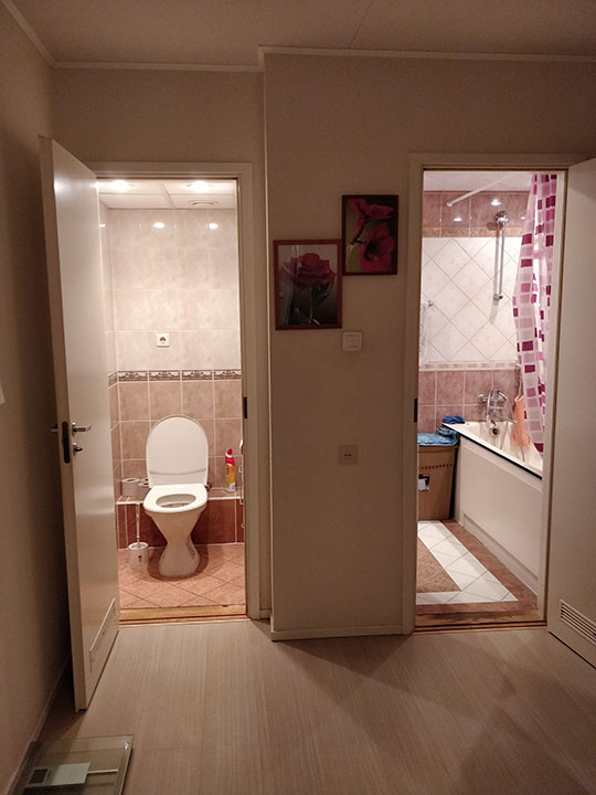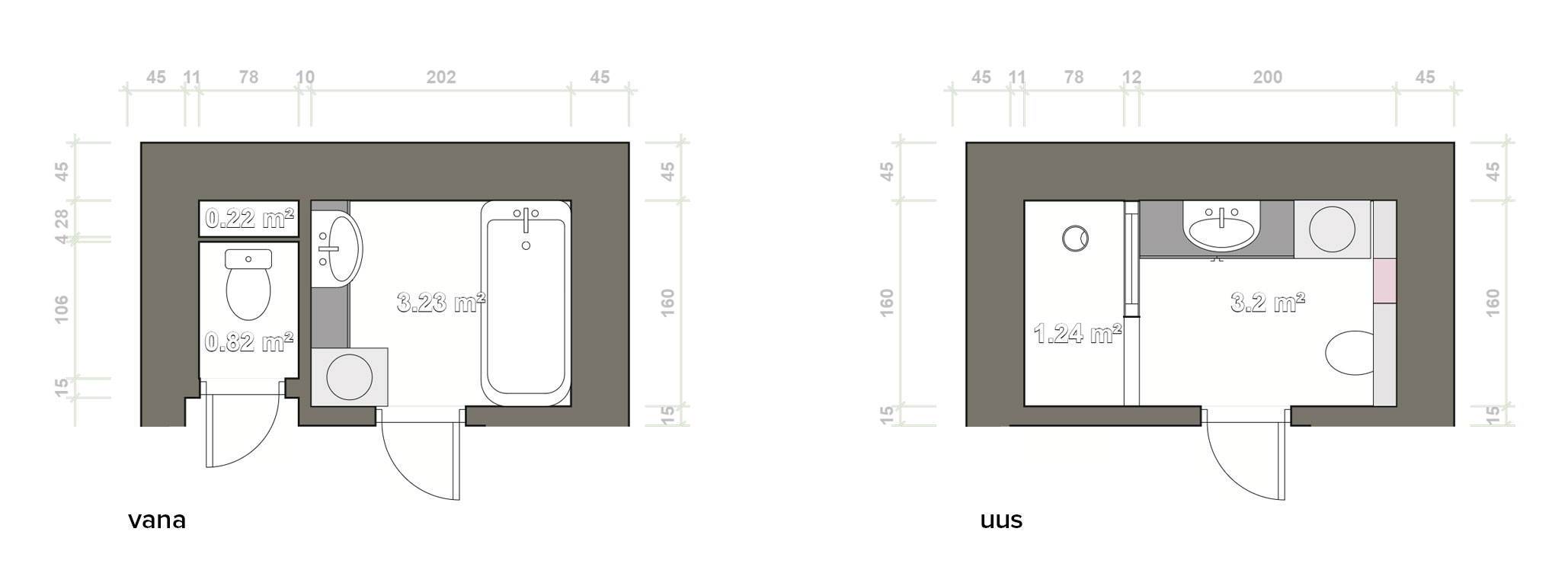 Vaja oleks WC ja vannituba kokku ehitada, sanitaartehnika ümber paigutada. Lammutada tuleb WC ja vannitoa vaheline sein (kipsist) ja kinni ehitada WC ukseava (vt joonist). WC pott tuleb seina sisse ehitada ja ideaalis sooviks pesumasina paigutada kappi maast 40-50cm kõrgusele riiulile nagu on näha näidisfotol. Kogu vannitoas tuleb paigutada uus hüdroisolatsioon, teostada toru ja elektritöid, seinu tuleb krohvida, värvida ja plaatida, ümber paigutada ventilatsioon ja sanitaartehnika.