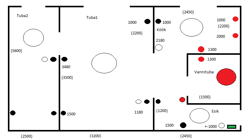 Praegune kaabeldus jookseb mööda seinu. Vajalik on kaablisoonte freesimine koos topsiavade freesimisega. Lisatud pildil on näha sulgudes seinte mõõdud, Suured sõõrid tähistavad laevalgustite asukohti, väiksed tühjad sõõrid valgustite lülitite asukohti, väiksed läbijoonestatud sõõrid pistikupesi. Punasega läbijoonestatud pistikud peaks olema eraldi rikkevoolu kaitsmega turvatud. Rohelisega läbijoonestatud on korteris eraldi kilp, kuhu jookseb terve korteri elekter. Korterisisene kilp pole samas väga primaarne. Võimalik ka välja jätta.