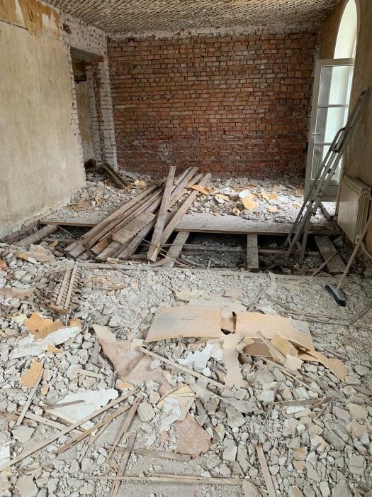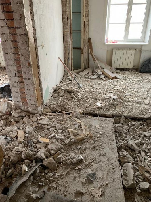 Krohv on laest juba eemaldatud ning põrandalauad üles võetud. Piltidel on lauad veel maas, kuid käesolevaks hetkeks eemaldatud. Laest tulnud krohvi kaudne hulk näha piltidelt.