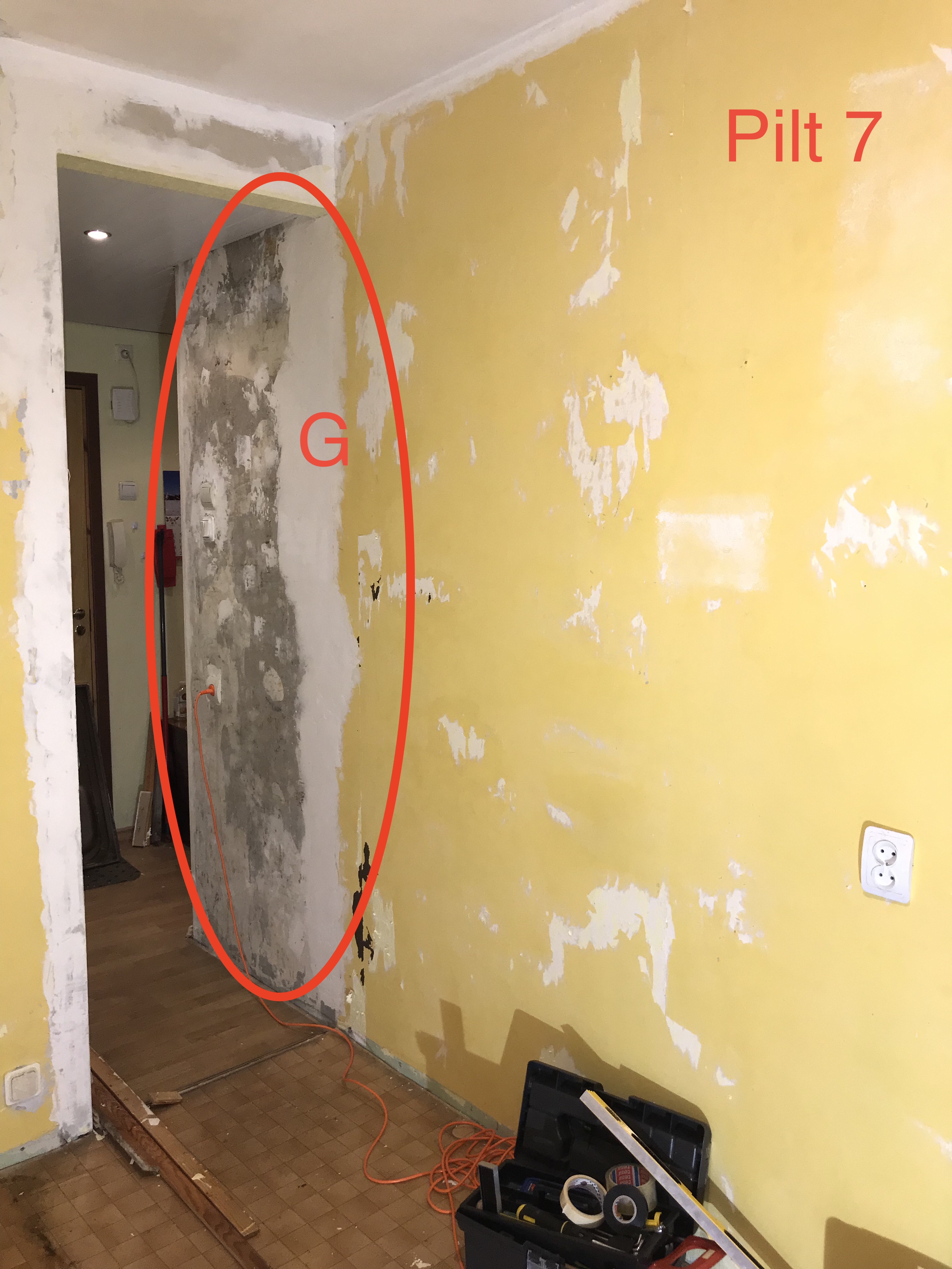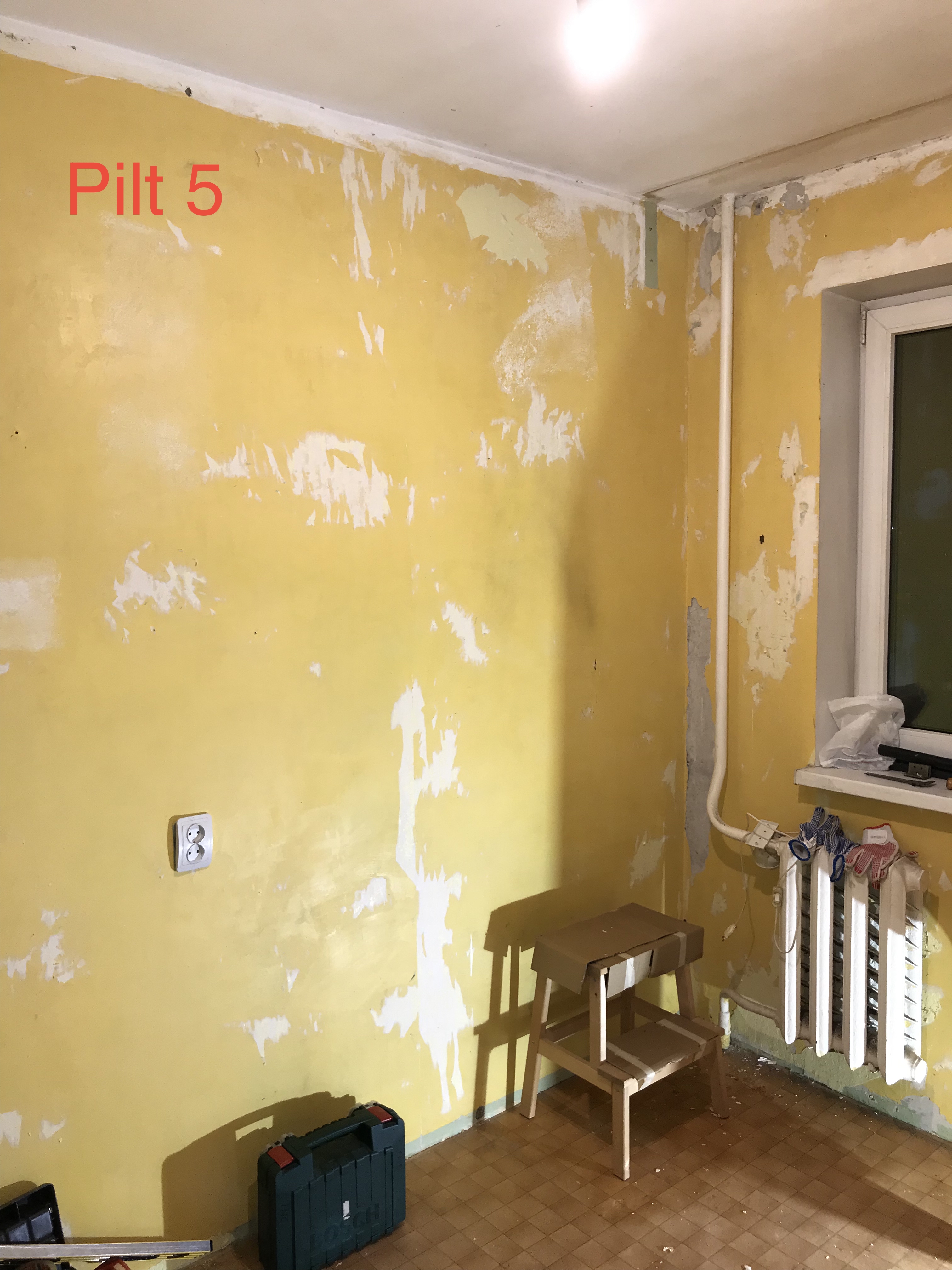 4. Kõikide seinte, sh punktis 1 kirjeldatud kipsplaadiga korrastatud nurga, defektide ja pragunenud kohtade parandamine, mitmesuguste augukeste (kruvid, naelad jne) sulgemine ja pahteldamine, värvimiseks ette valmistamine. Seinad on olnud varem värvitud ning põhiosas olid värvitud tapeediga kaetud (tapeet on eemaldatud). Teatud üksikud kohad nõuavad lauspahteldust, sh pikemal seinal ala ca 0,9m x 2,4m (vt pilt 7, märgistus G, pilt 4 märgistus H). Sein, millel on näha gaasitoru ja -mõõtja peab võimaldama kappide kinnitamist seinale (s.t olema piisavalt sirge). Kruntvärviga katmine (2x). Kokku on seinte töödeldav pind 26,9m2, sellest põhjalikumat töötlust vajab 3,45m2.