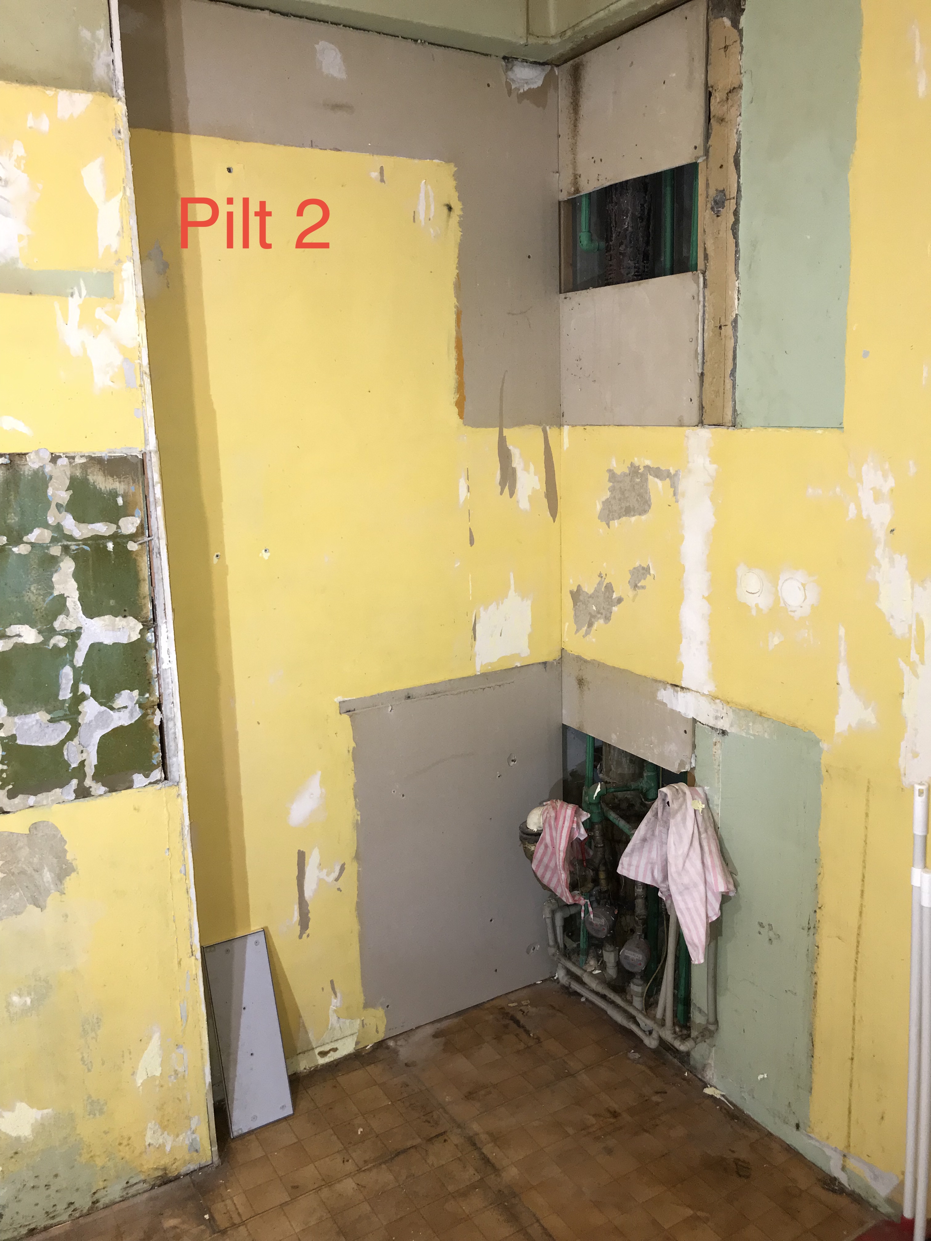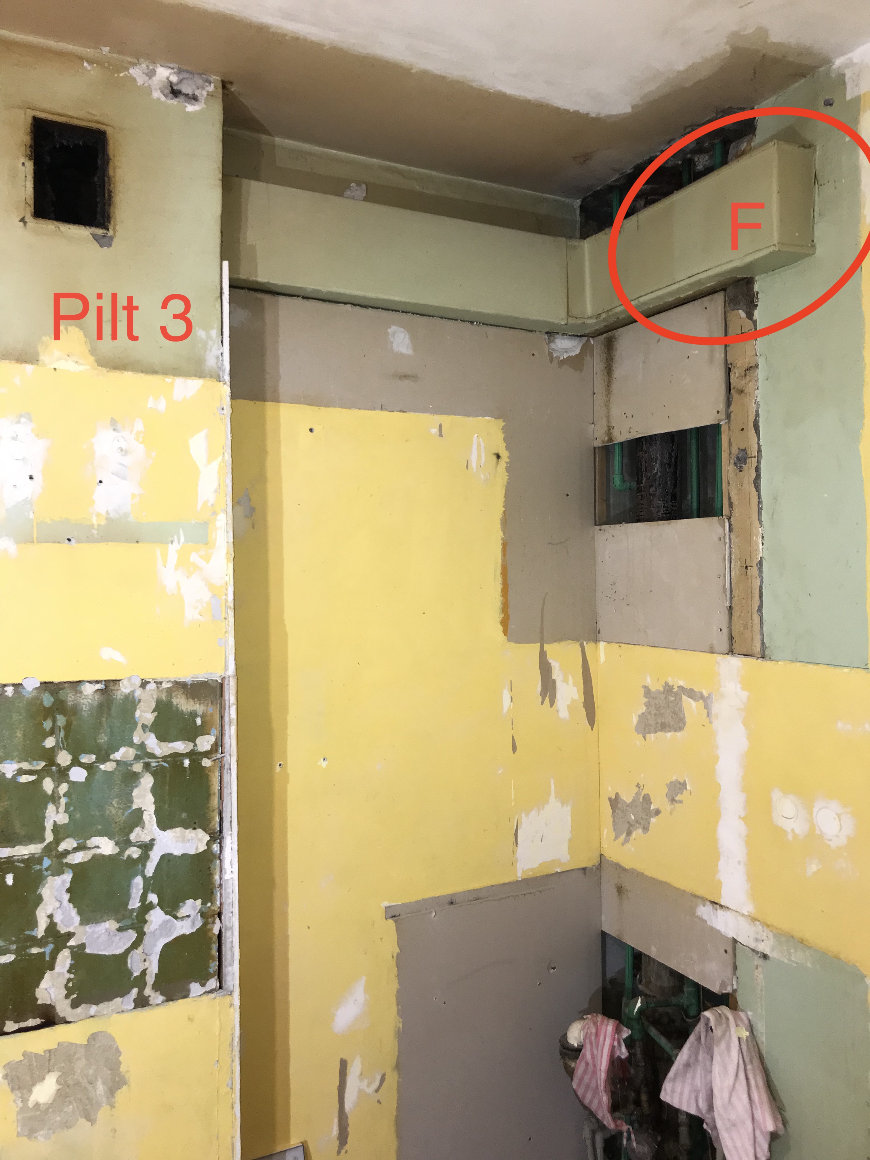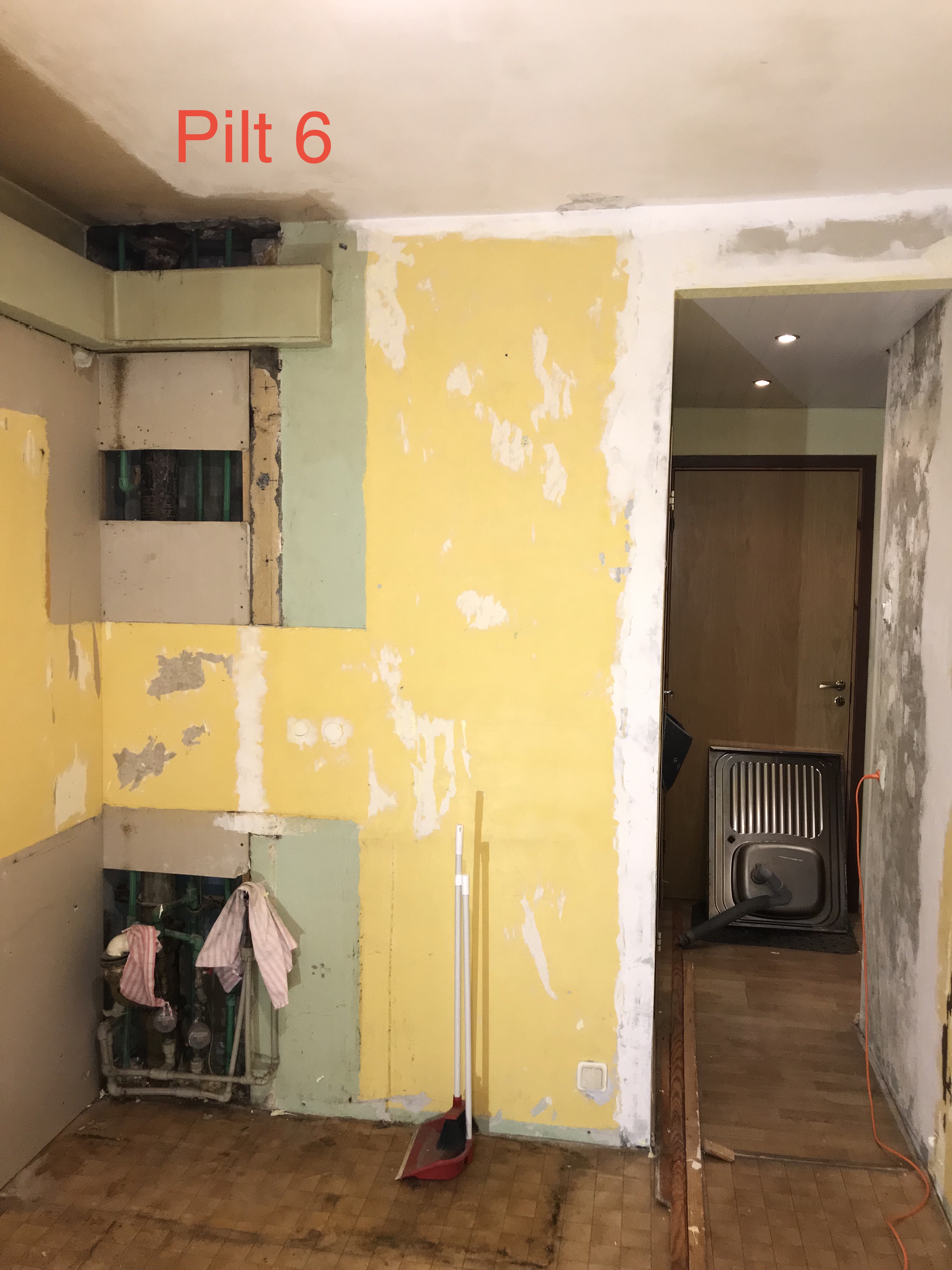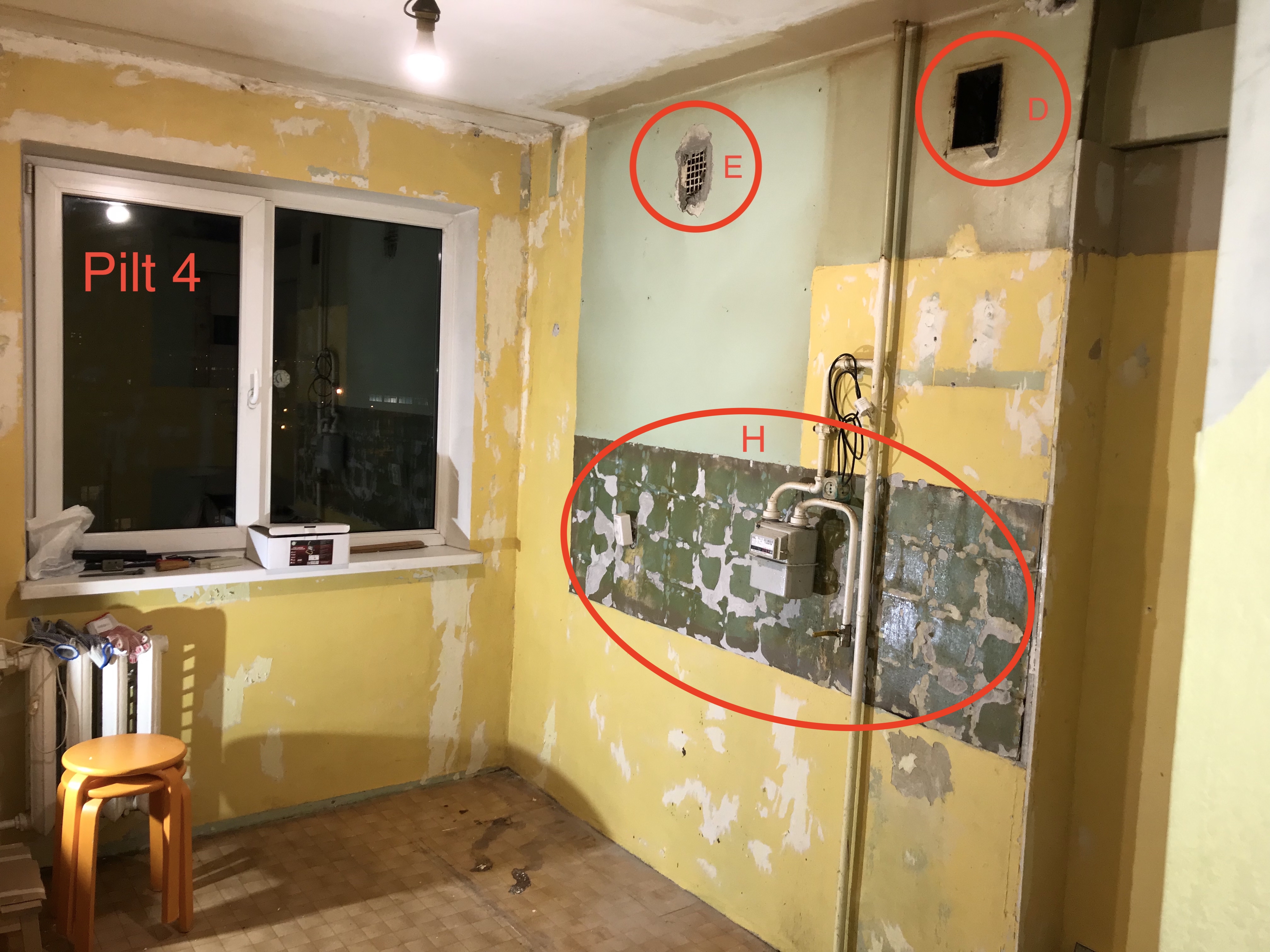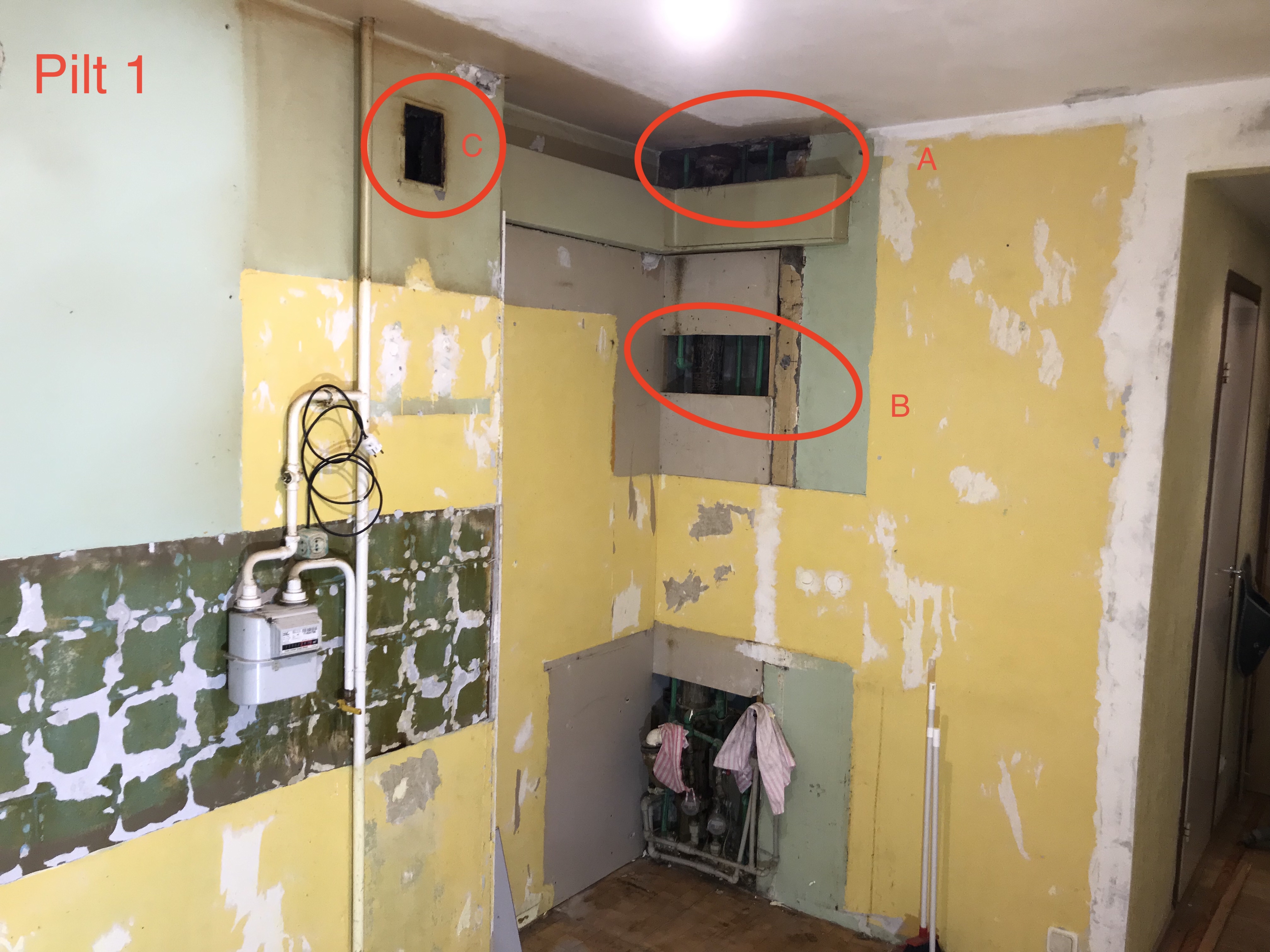 1. Mainitud süvendi (vt pildid 2 ja 1) kinni ehitamine kipsplaadi paigaldamisega. Sein peab moodustama ühtse terviku olemasoleva paneelseinaga (piltidel vasakul) et oleks võimalik paigaldada köögikapid põrandale ja seinale. Kõnealusesse kipsplaati tuleb freesida avad kolmele pistikule (asukohad täpstustatakse töö käigus). Lisaks tuleb kipsplaadiga sulgeda avad, mis on pildil 1 märgitud tähtedega A ja B ning nende avade ümbrus. Tulemus peab moodustama ühtse terviku seinaga, mis on näha paremal. Piltidel 1 ja 2 paremal all nähtavatele torudele ja veemõõdikutele peab säilima ligipääs (sinna tuleb kapp). Pildil ülal paremal nähtava ventilatsioonitoru ümber on vajalik kipsplaadist karp (vt pilt 3, märgistus F).