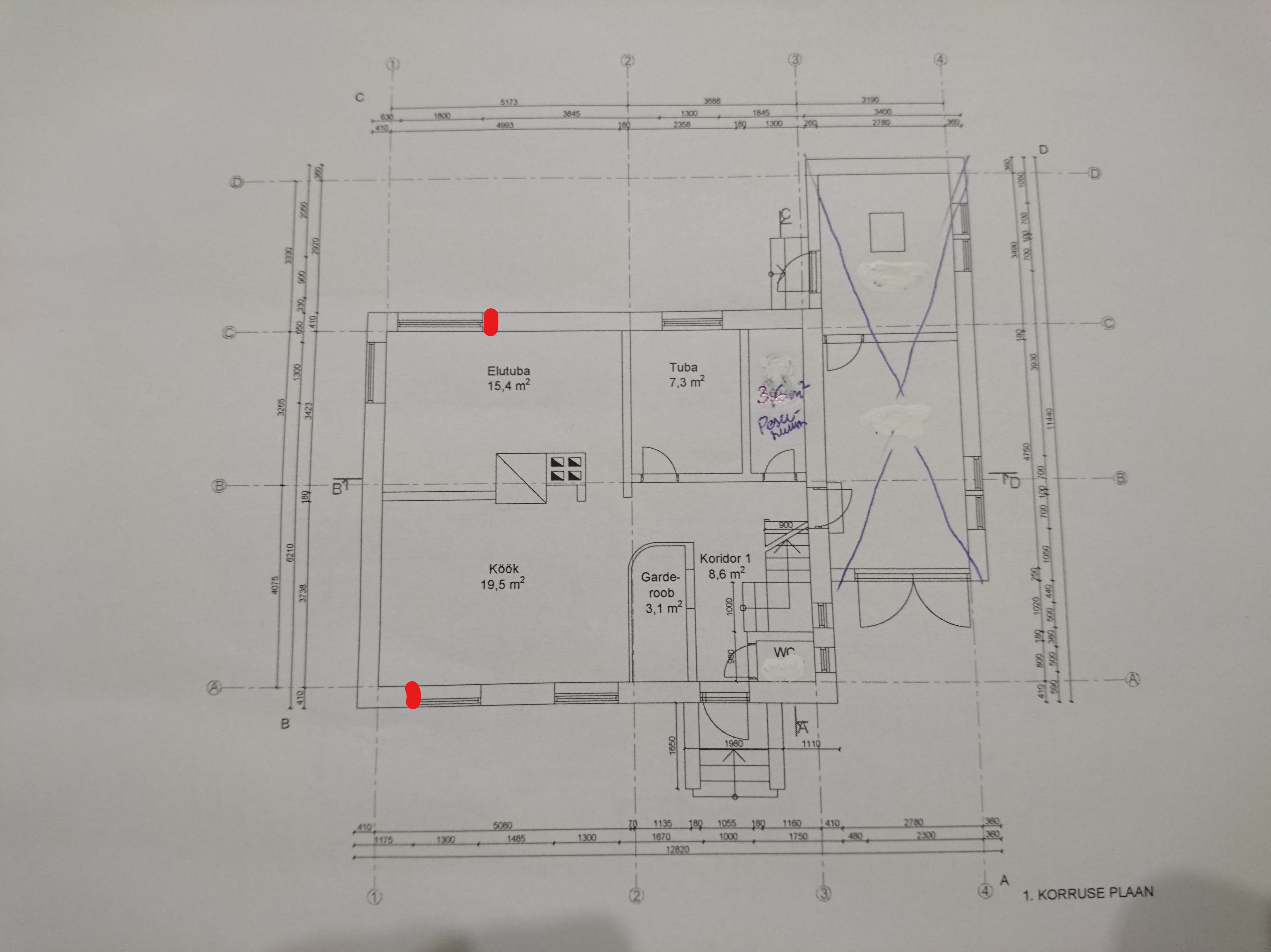 Maja esimene korrus valmis. Olemas esimesel korrussel kaks fresh klappi (märgitud plaanil punasega) ja väikesel toal on klapp akna küljes. Väljatõmbe ventlaator wcs ja pesuruumis.