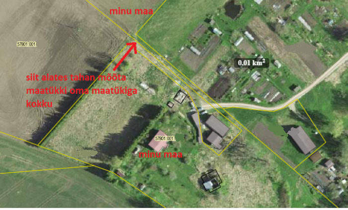 Katastriüksuse 57801:001:____ juurde tahan liita osa katastriüksusest 57801:001:____ (see maatükk on peamiselt põllumaa, kuid selle juurde kuulub ka laut koos kitsa koridoriga). Selgitav pilt hankega kaasas. Mõõdetava maatüki pindala ca 1100 ruutmeetrit.