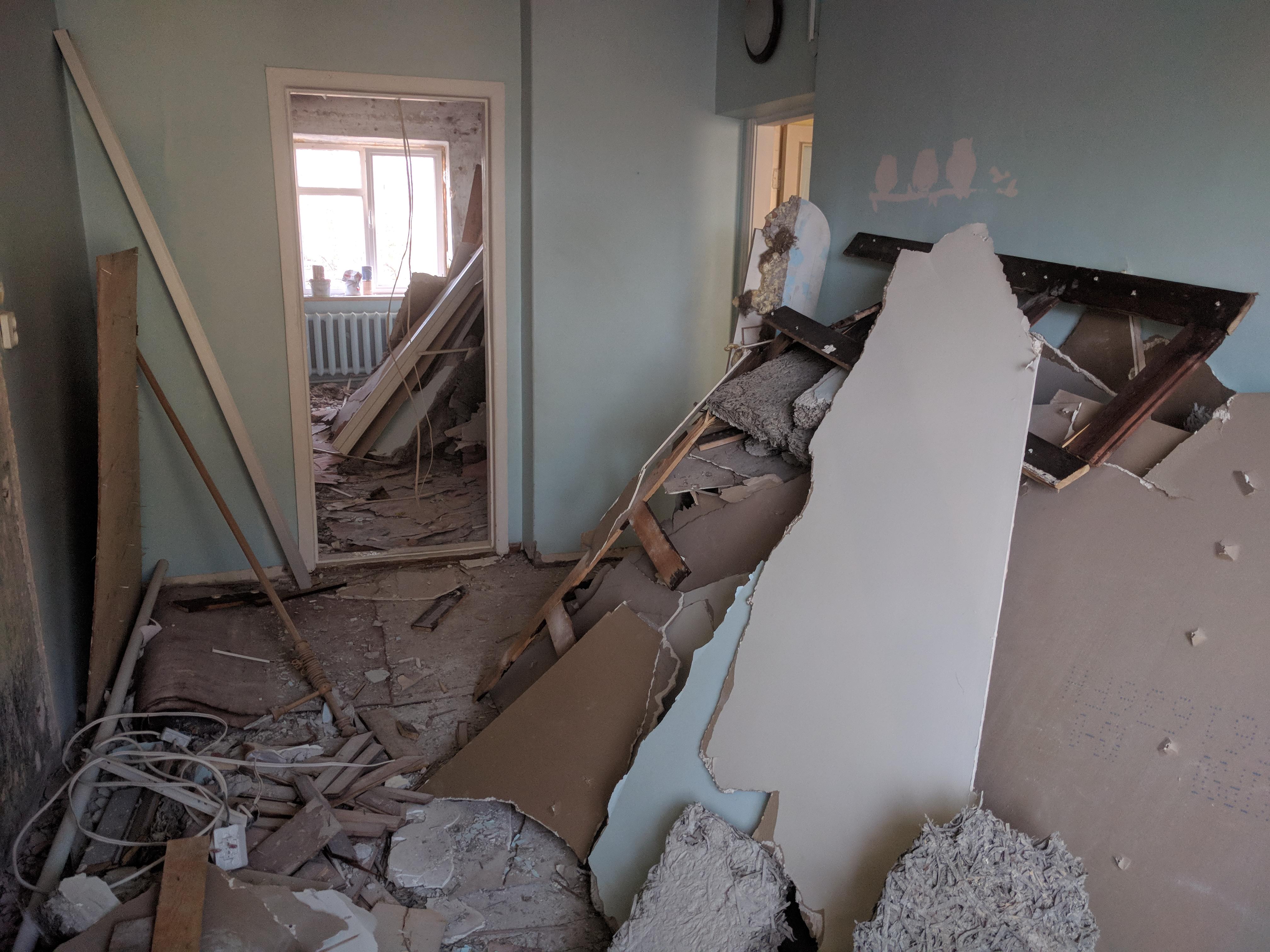Piltidel näha olevaid plastämbreid saab põrandatel oleva lahtise prahi tassimiseks kasutada. Hoonele ligipääsuteed on kitsad, aga ajutiselt paariks tunniks peaks olema võimalik konteinerit paigaldada.